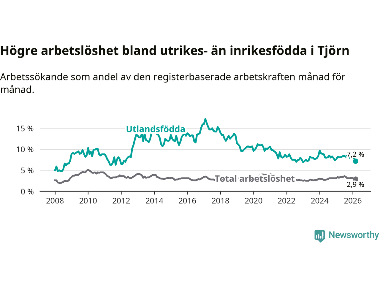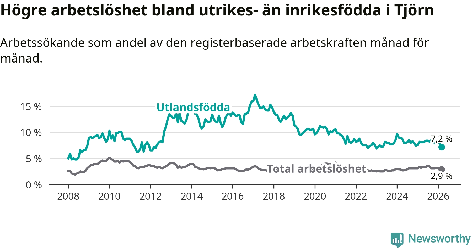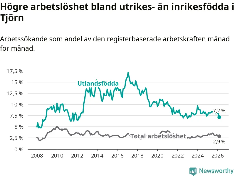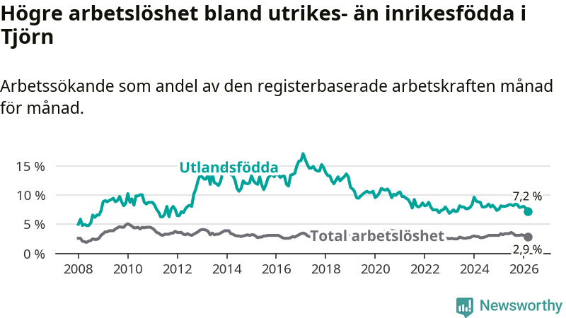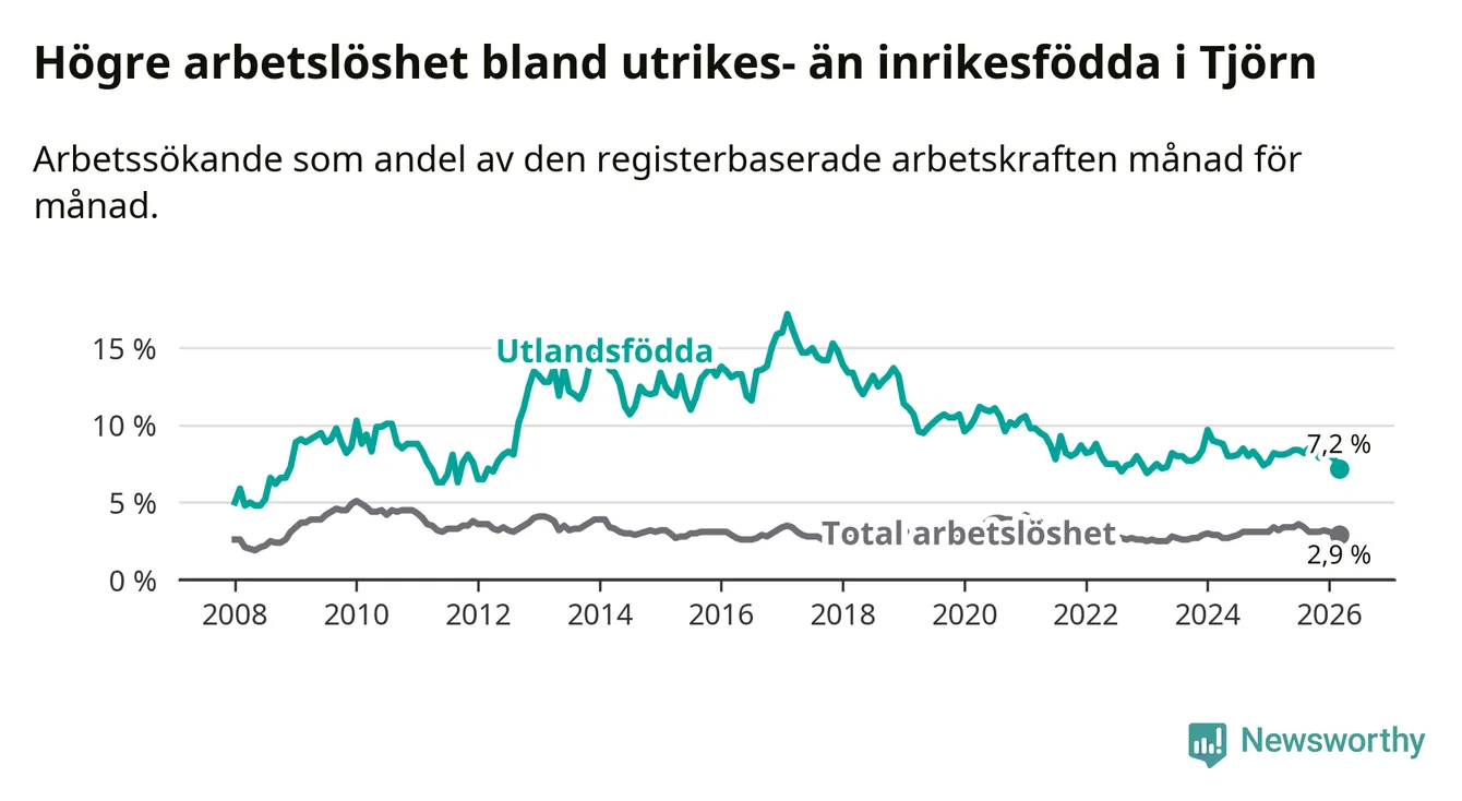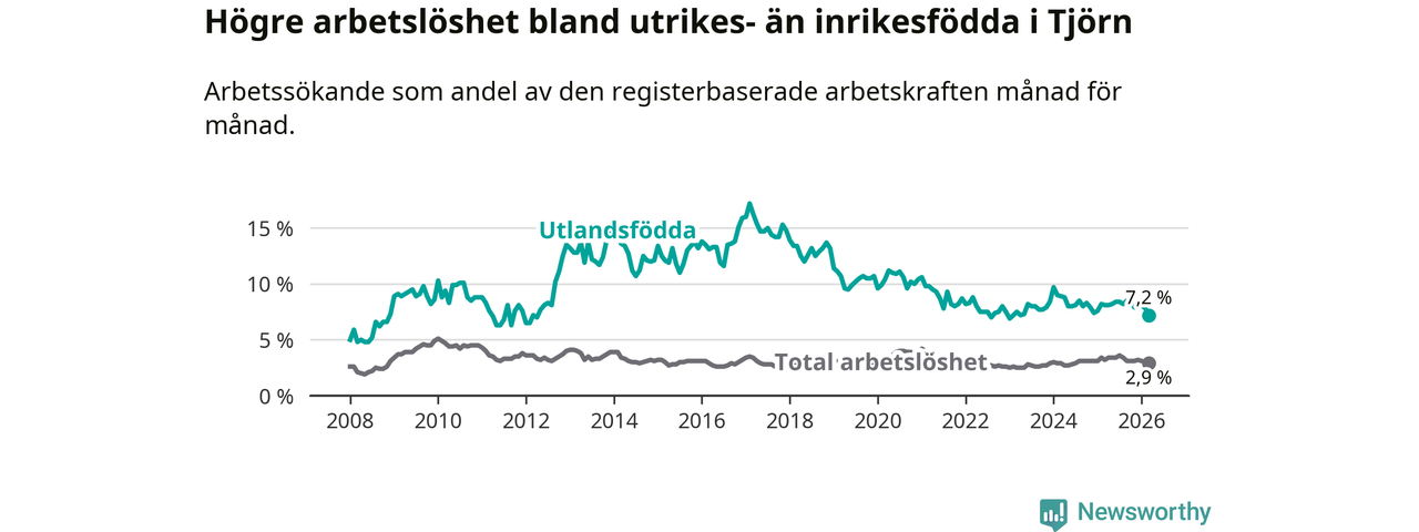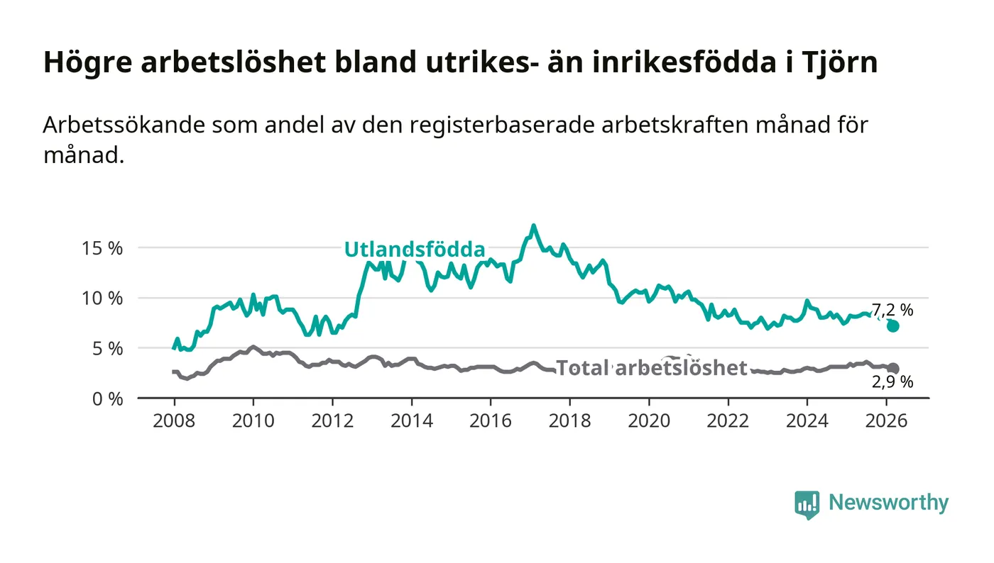 Skillnaden i arbetslöshet mellan utrikesfödda och hela befolkningen är 4,3 procentenheter på Tjörn. Det är en mindre skillnad än för ett år sedan (−0,6 procentenheter).