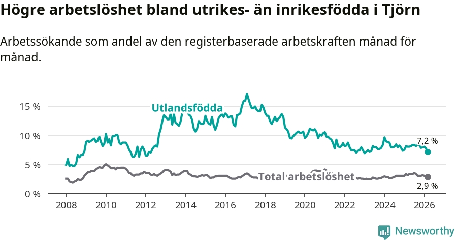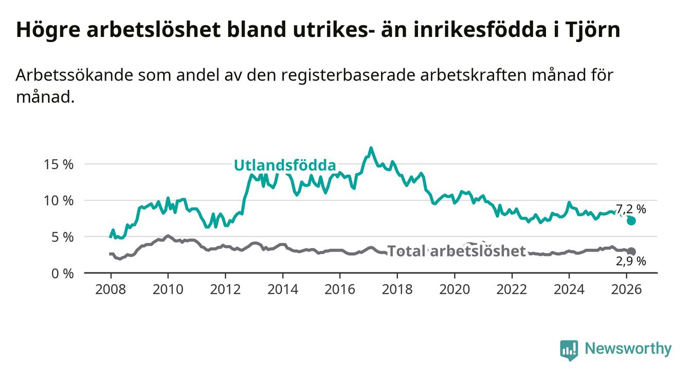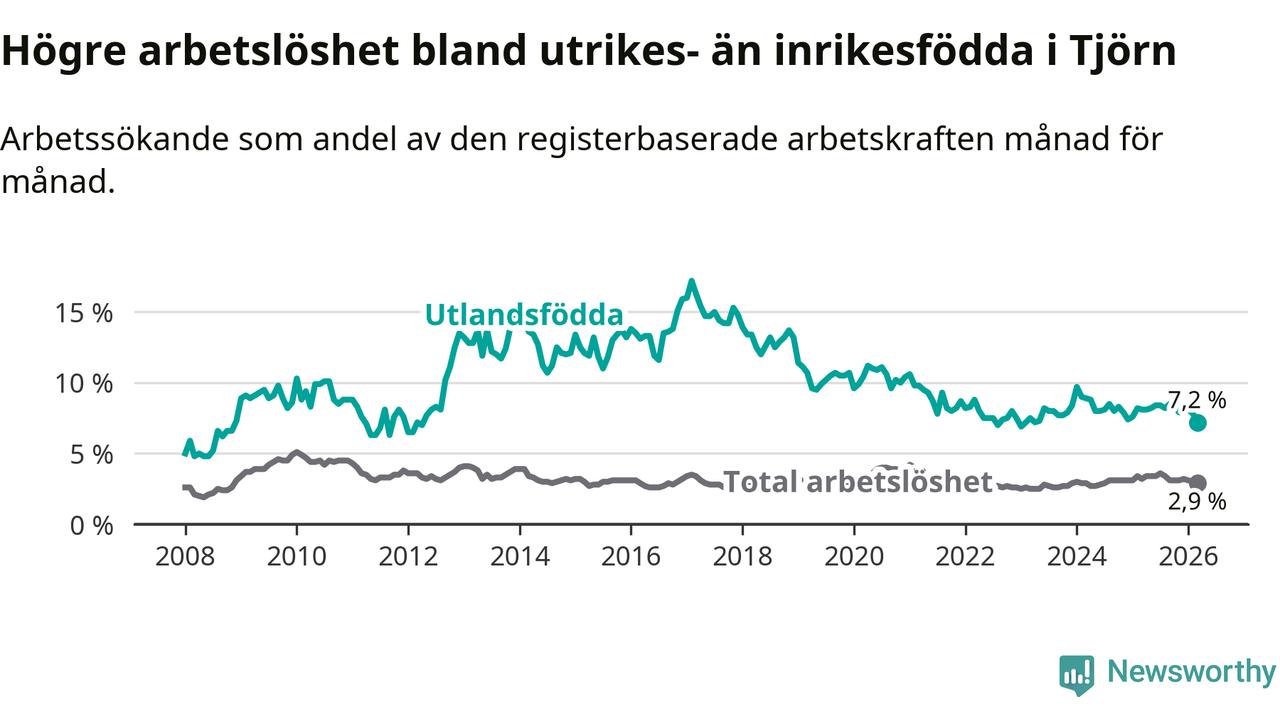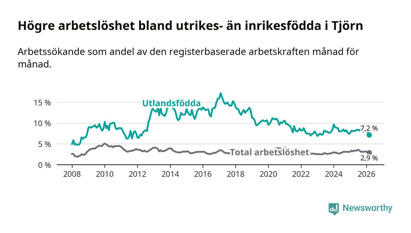 Arbetslösheten bland utlandsfödda var 7,2 procent på Tjörn under mars månad, motsvarande 59 av 819 personer. Det är 0,9 procentenheter färre än vid samma tidpunkt i fjol (−7 om man räknar personer).