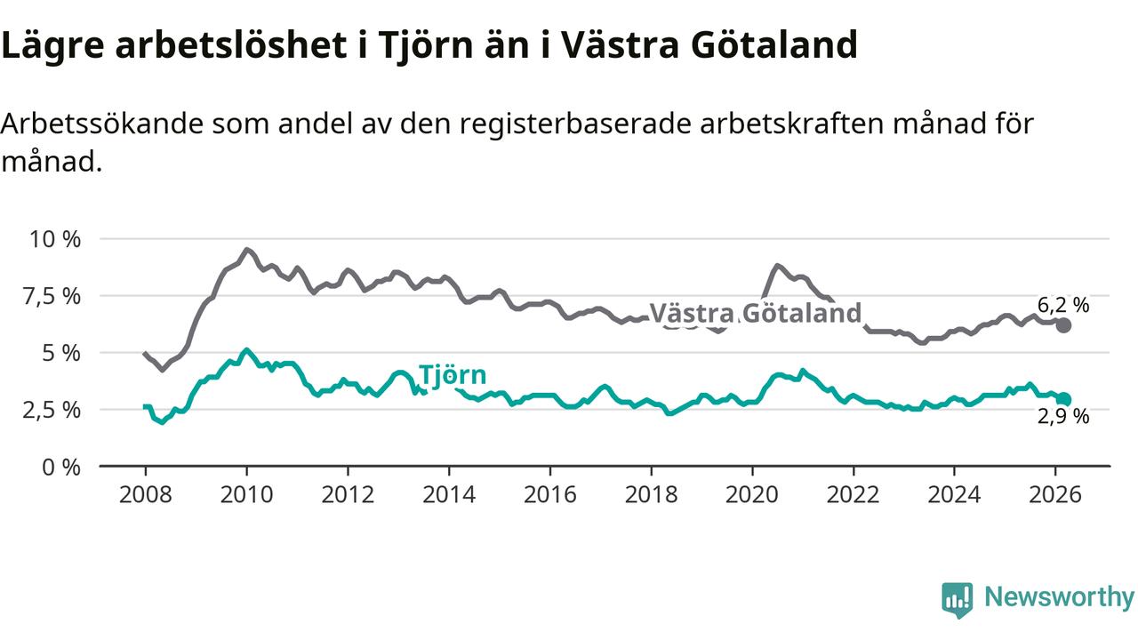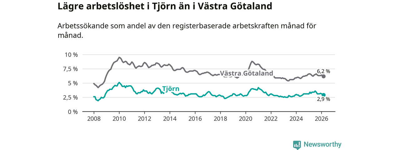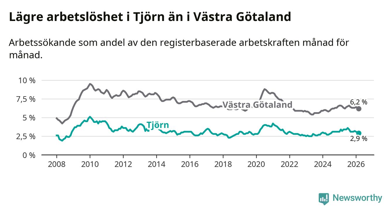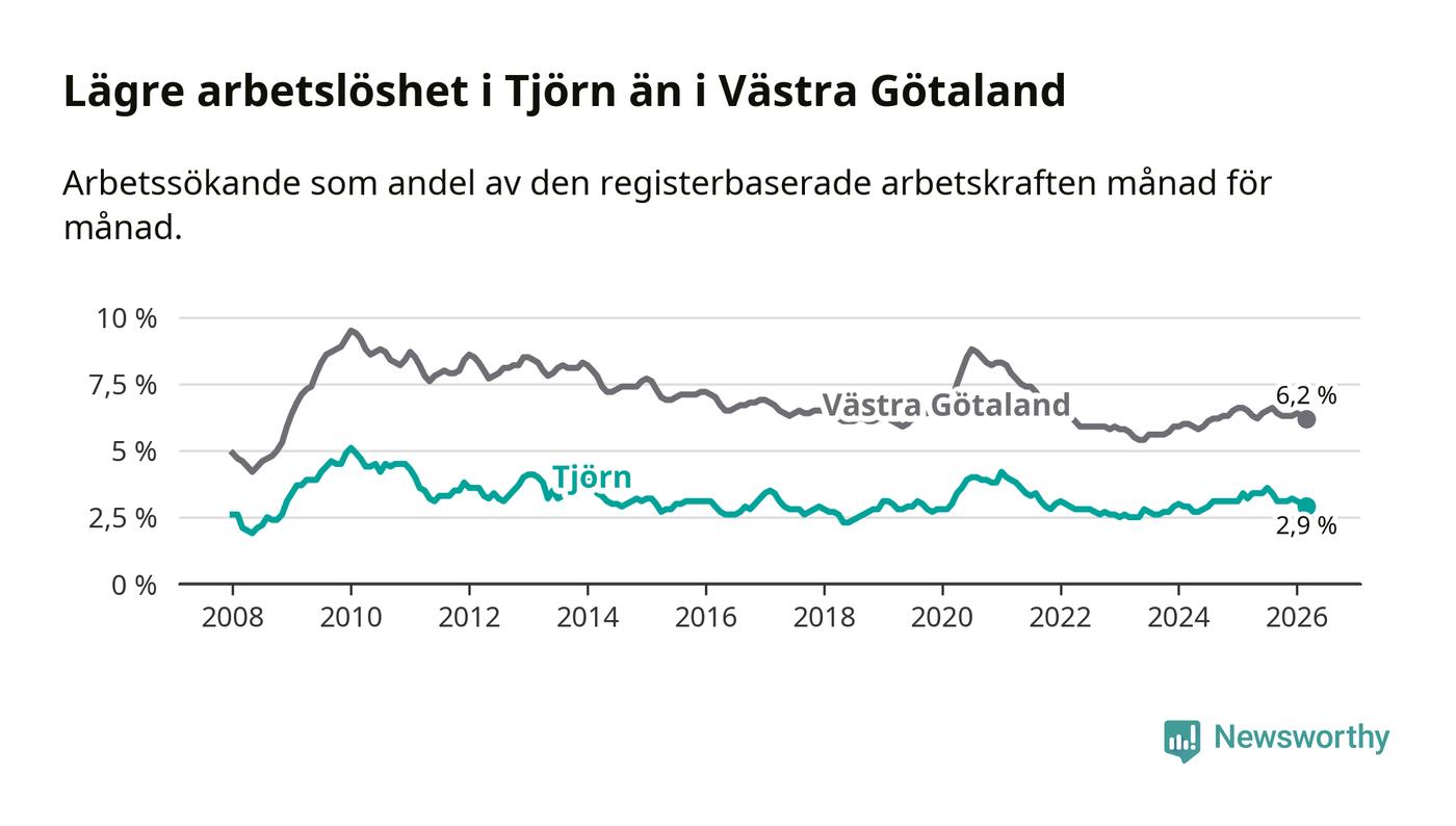 Under mars månad rapporterade Tjörns kommun en total arbetslöshet på 2,9 procent. Det är en minskning jämfört med samma tidpunkt i fjol (−0,3 procentenheter). Även i Västra Götalands län sjunker arbetslösheten .