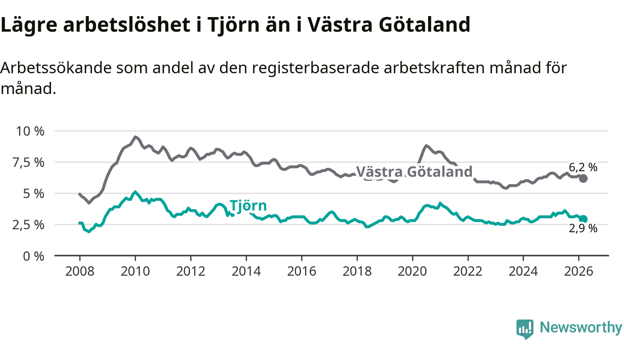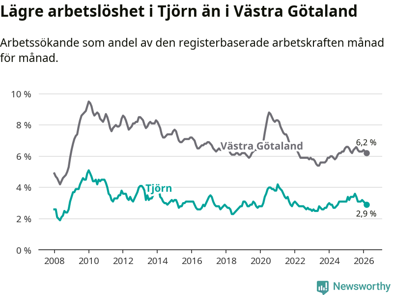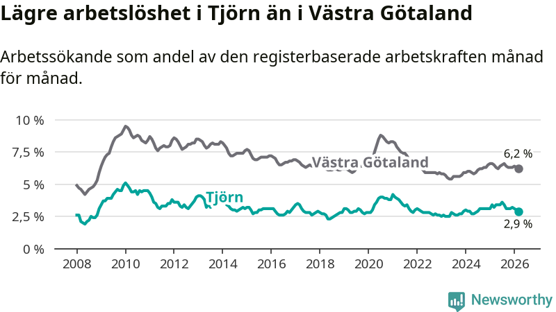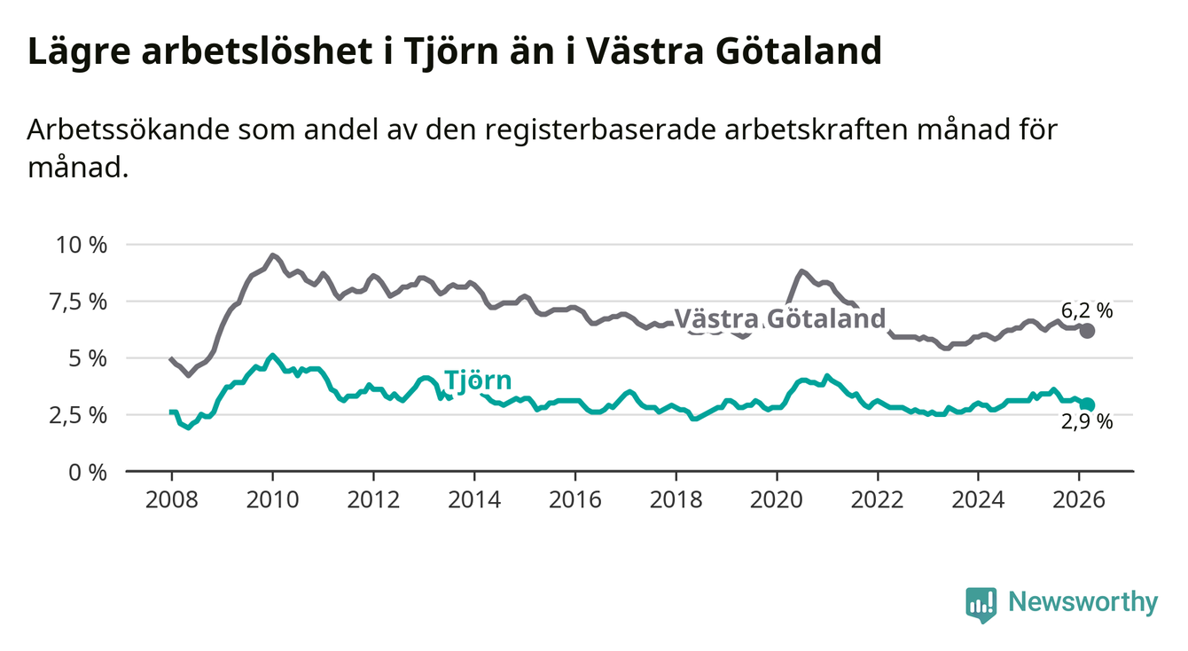 Under mars månad rapporterade Tjörns kommun en total arbetslöshet på 2,9 procent. Det är en minskning jämfört med samma tidpunkt i fjol (−0,3 procentenheter). Även i Västra Götalands län sjunker arbetslösheten .