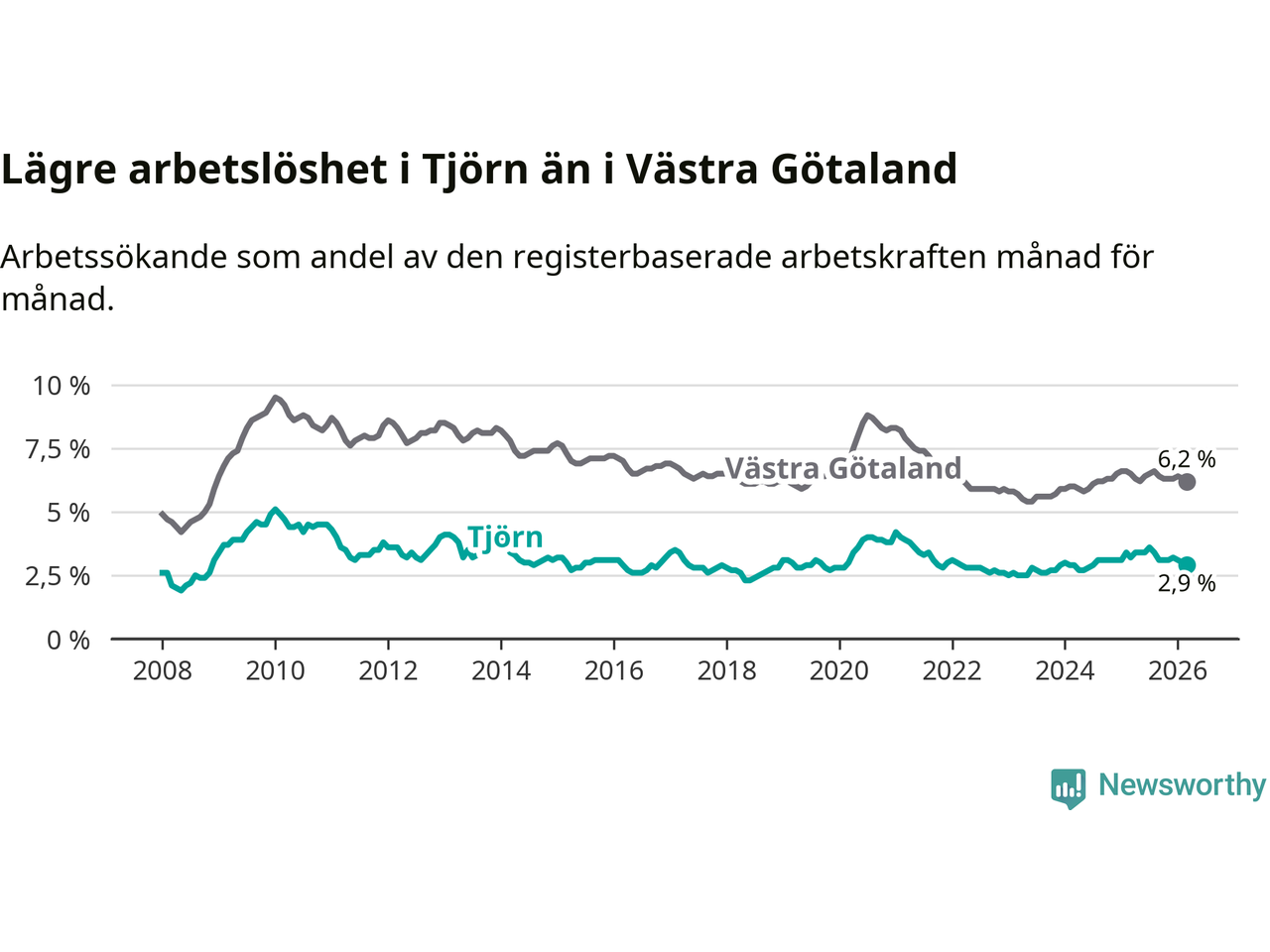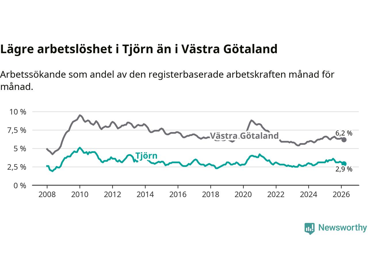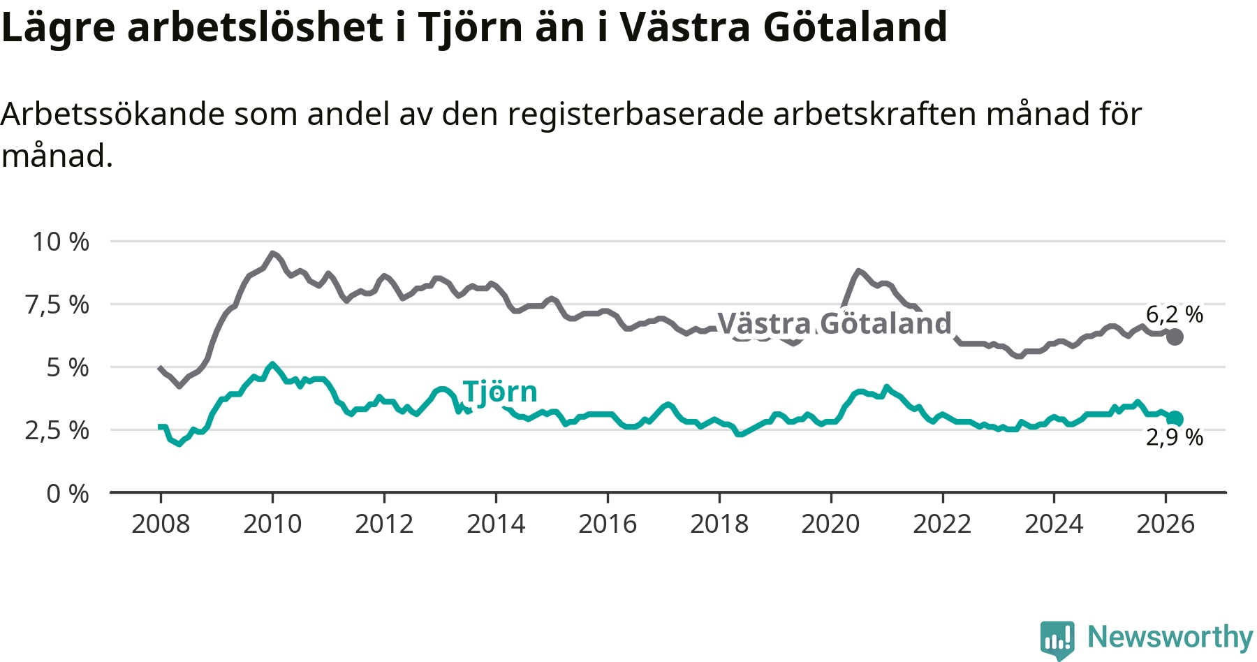Tjörn hade redan tidigare lägre arbetslöshet än snittet i hela Västra Götalands län och nu växer klyftan (2,9 procent i kommunen, jämfört med 6,2 procent i hela länet). Öckerö har den lägsta arbetslösheten i länet (2,6 procent), medan Gullspång har den högsta (8,1 procent). För att Tjörn skulle komma ner i samma arbetslöshetsnivå som Öckerö skulle 22 personer behöva sysselsättas.