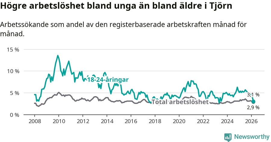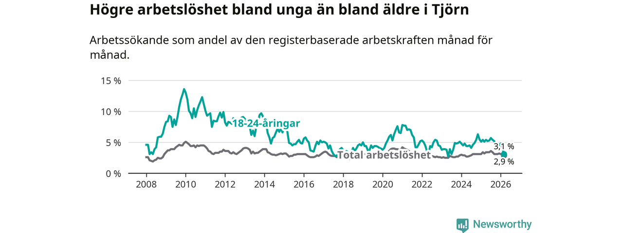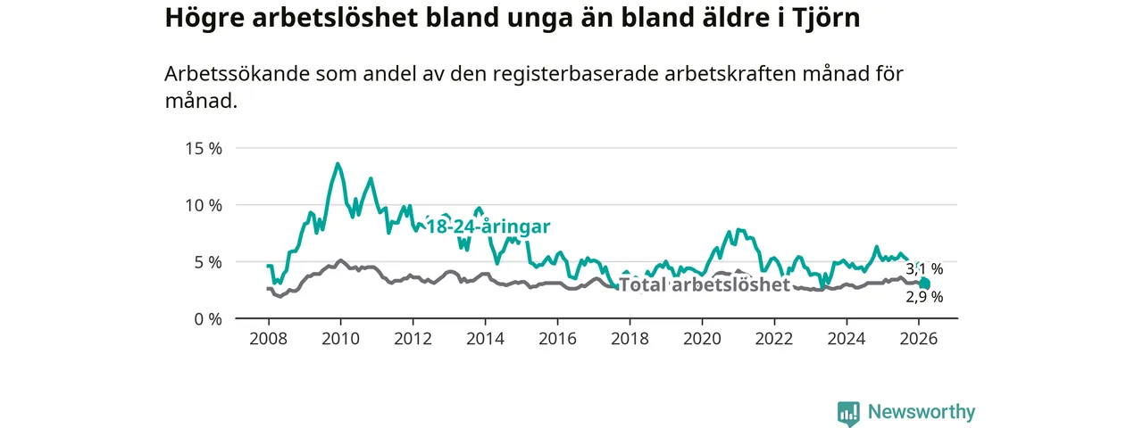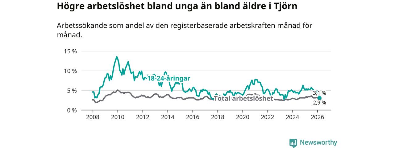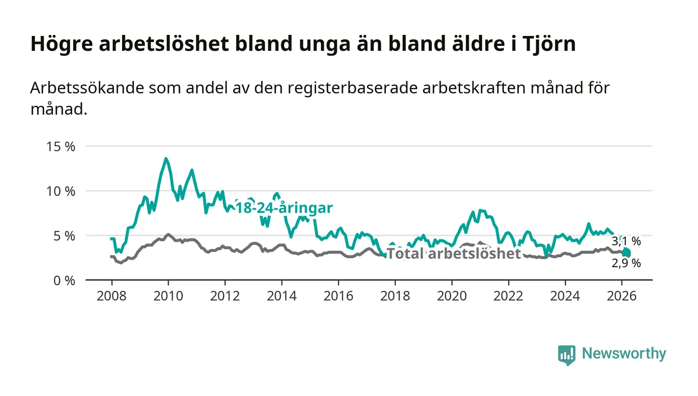 Den senaste månadsstatistiken från Arbetsförmedlingen visar på en nedgång i ungdomsarbetslöshet i Tjörns kommun med 2,0 procentenheter. Arbetslösheten bland personer i åldern 18–24 år låg i mars på 3,1 procent.