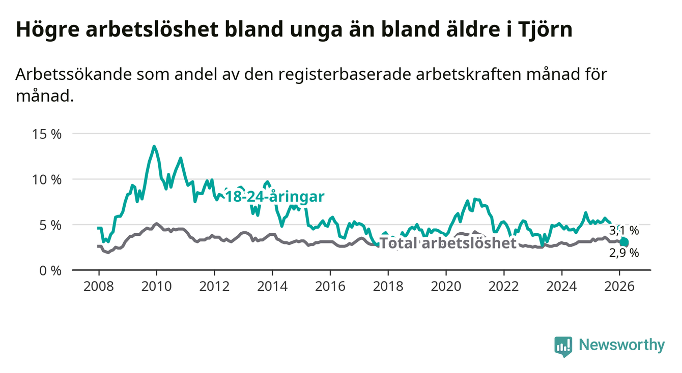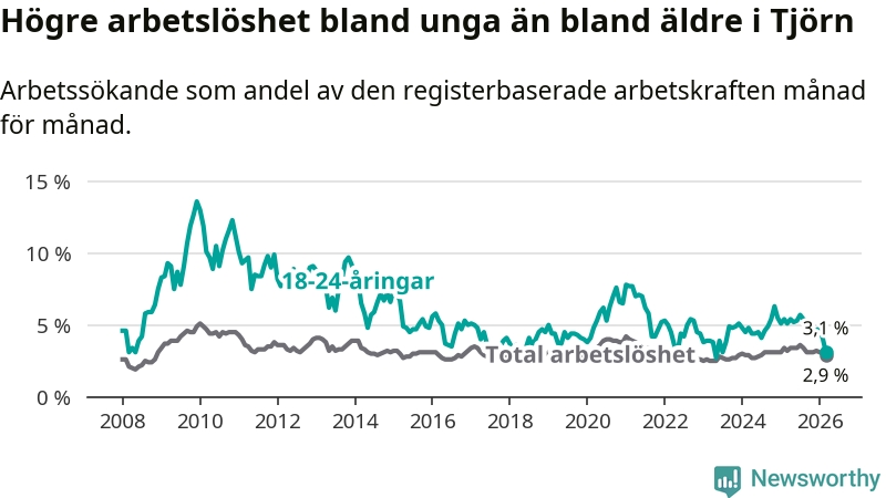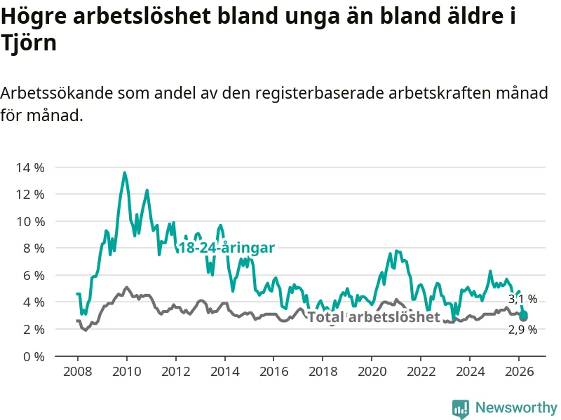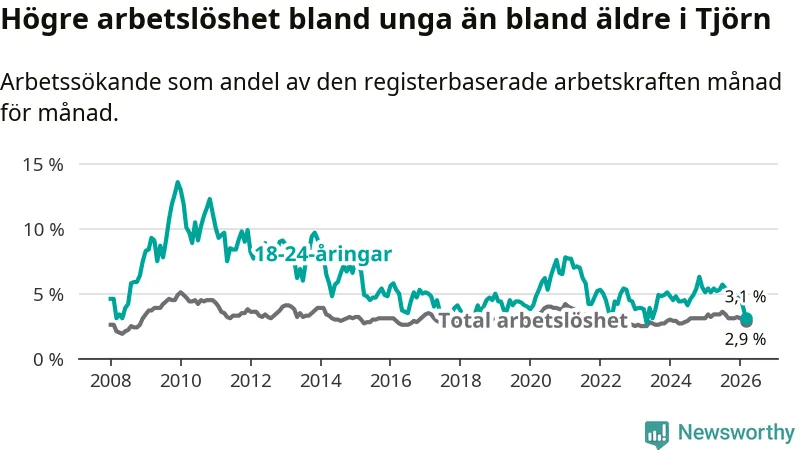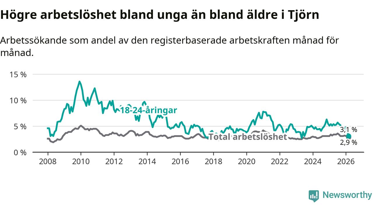 Den senaste månadsstatistiken från Arbetsförmedlingen visar på en nedgång i ungdomsarbetslöshet i Tjörns kommun med 2,0 procentenheter. Arbetslösheten bland personer i åldern 18–24 år låg i mars på 3,1 procent.