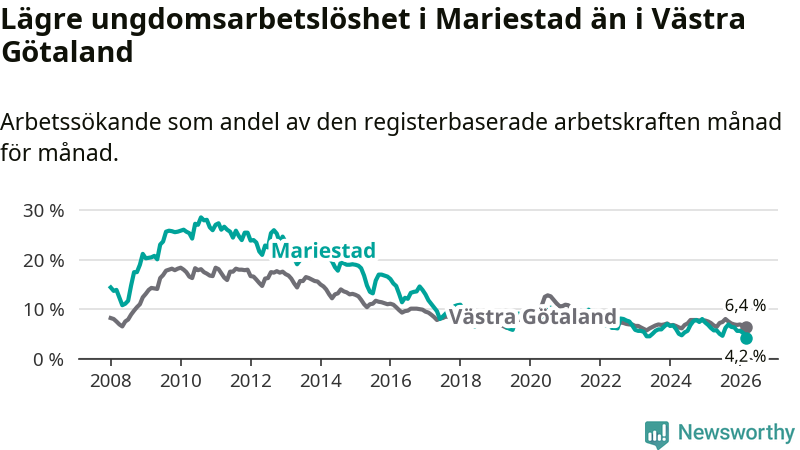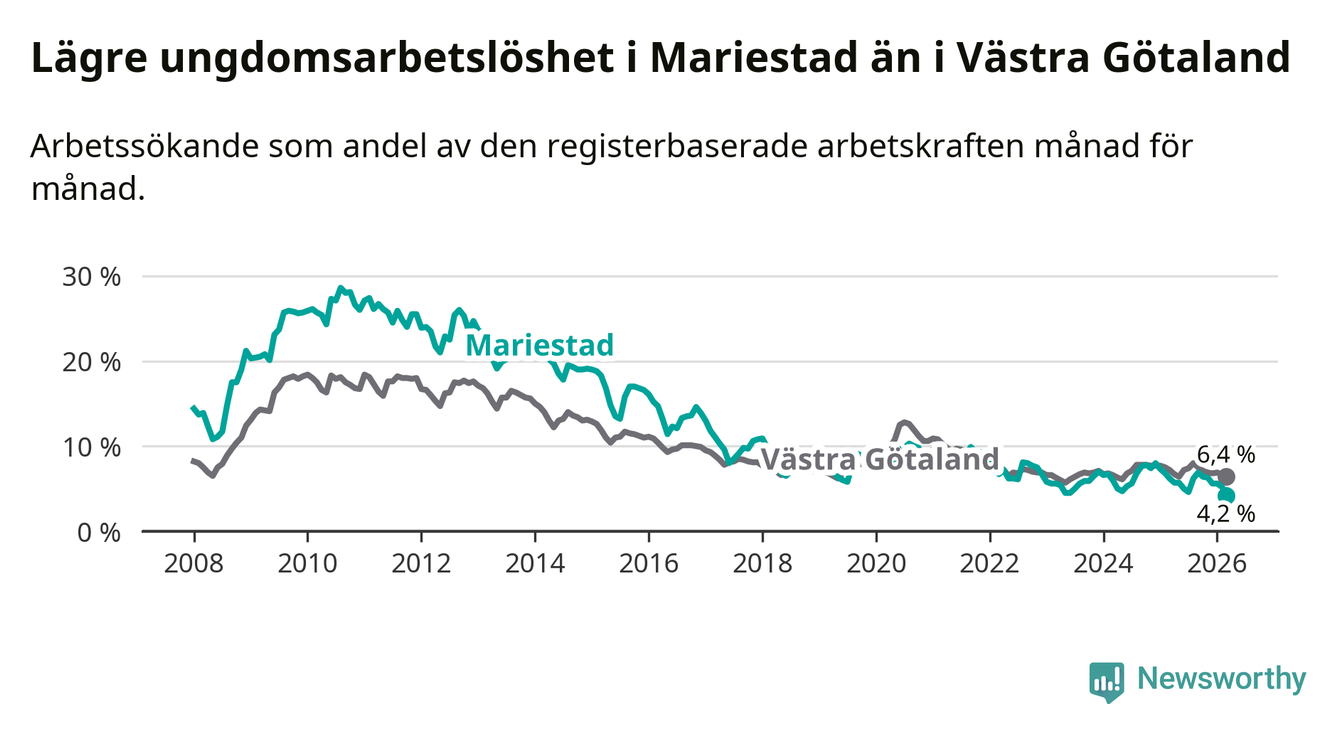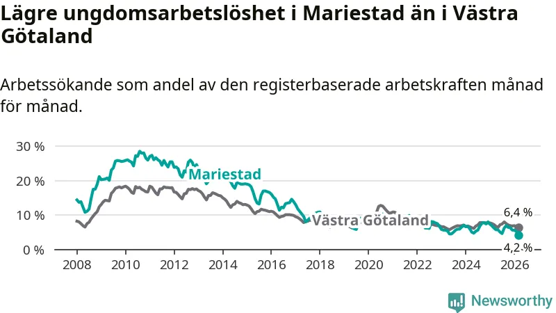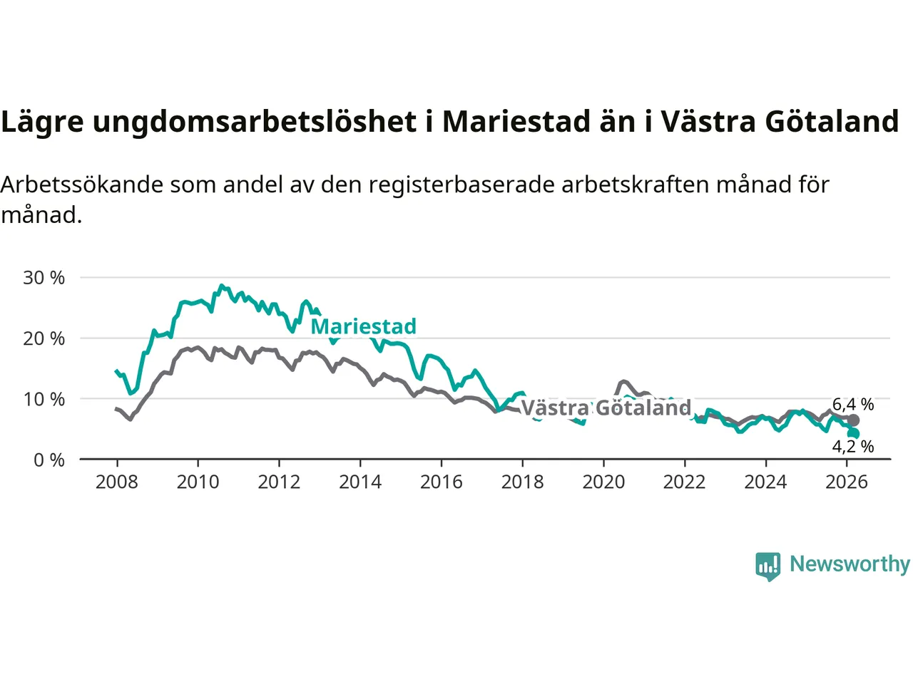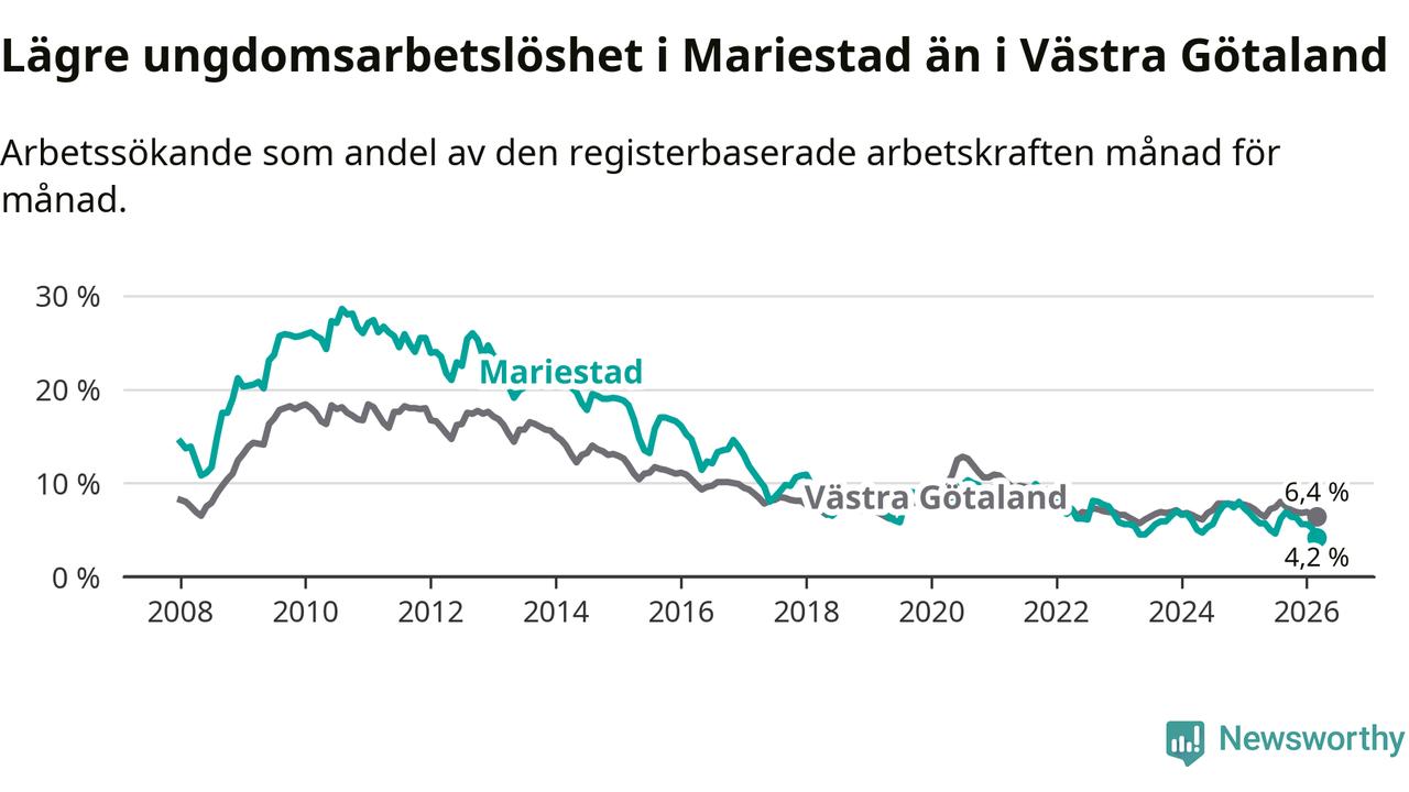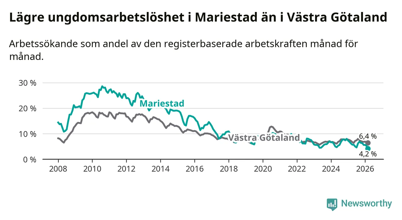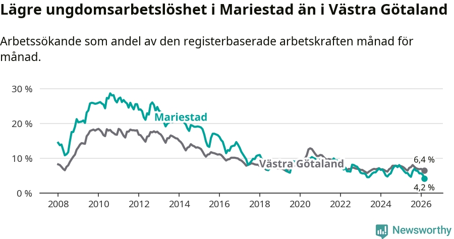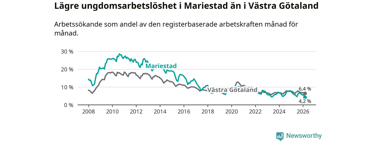 I och med den senaste månadens nedgång har de ungas arbetslöshet i Mariestad sjunkit tio månader i följd (ner från 5,7 procent i maj 2025 till 4,2 procent nu). Den nuvarande arbetslöshetsnivån är den lägsta sedan januari 2008.