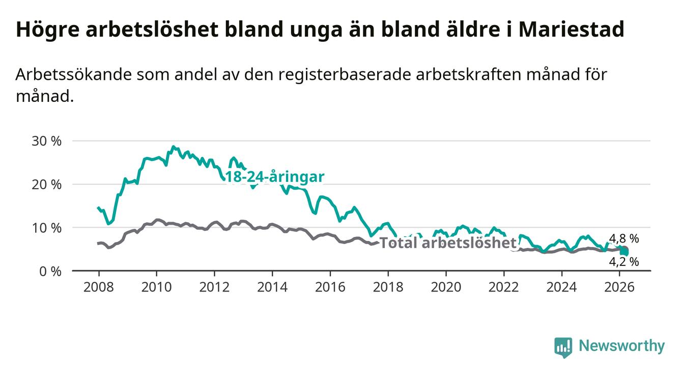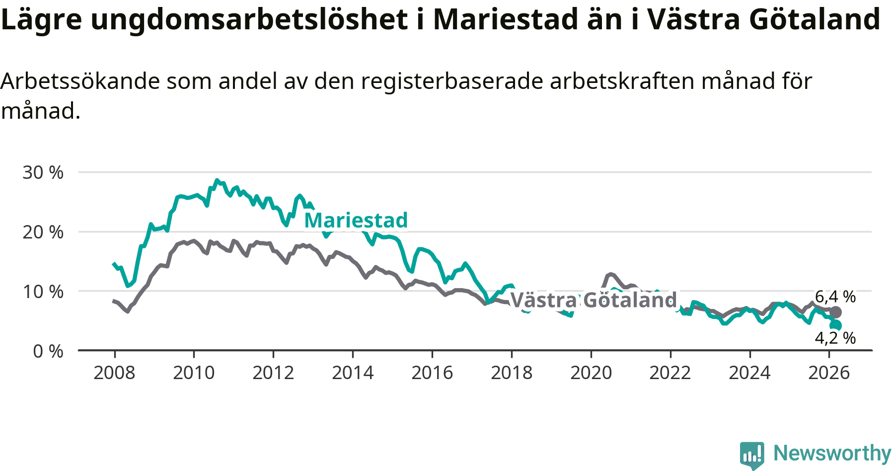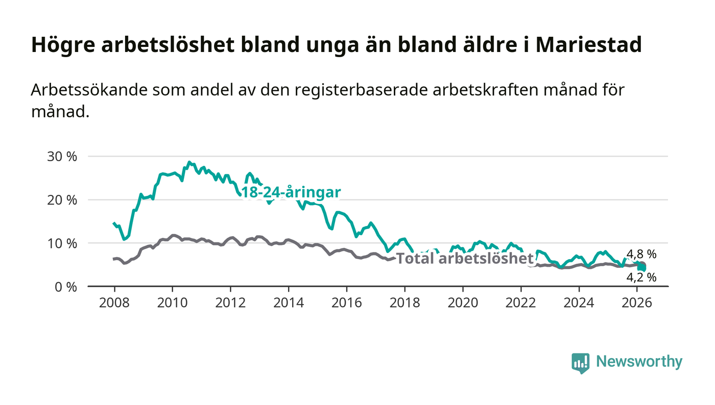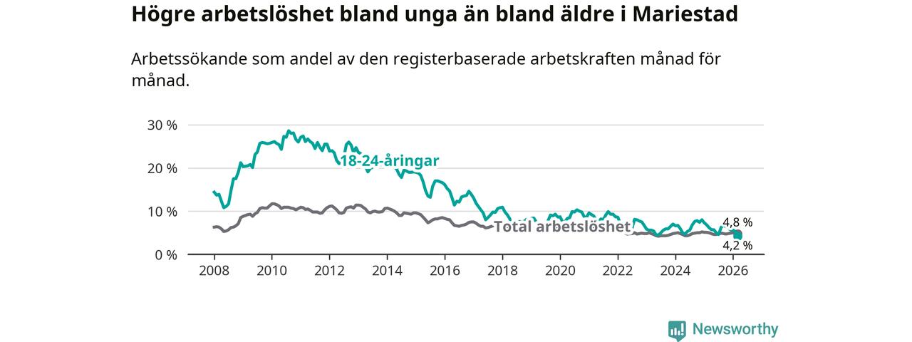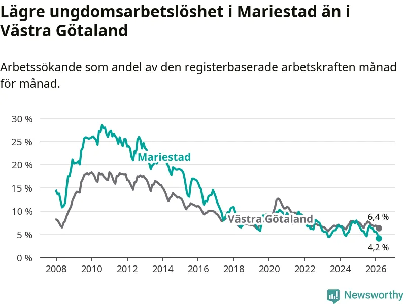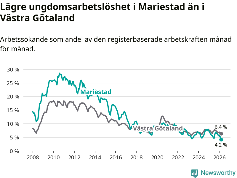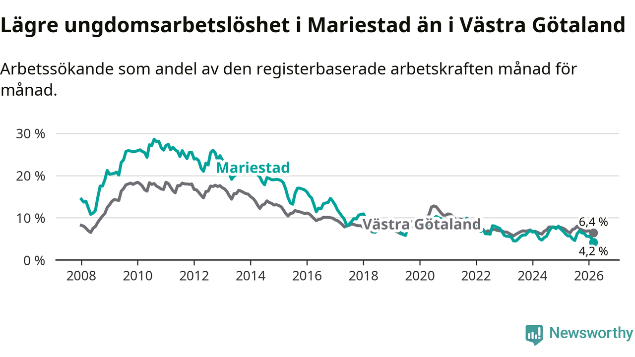 I och med den senaste månadens nedgång har de ungas arbetslöshet i Mariestad sjunkit tio månader i följd (ner från 5,7 procent i maj 2025 till 4,2 procent nu). Den nuvarande arbetslöshetsnivån är den lägsta sedan januari 2008.