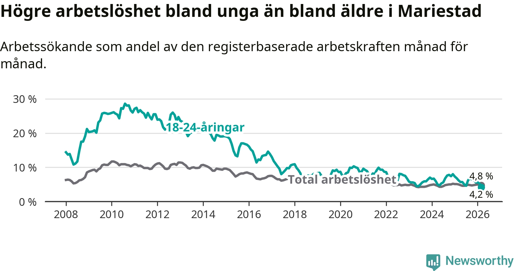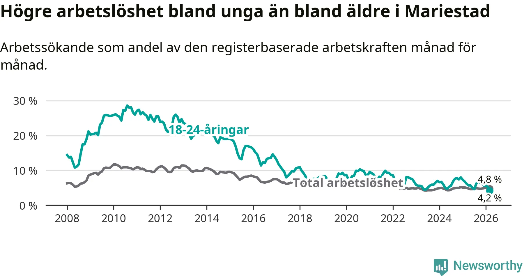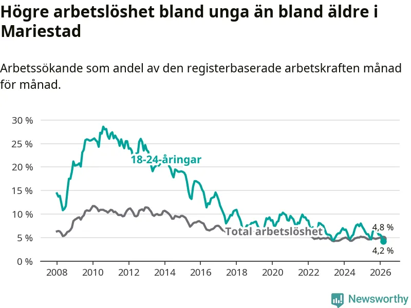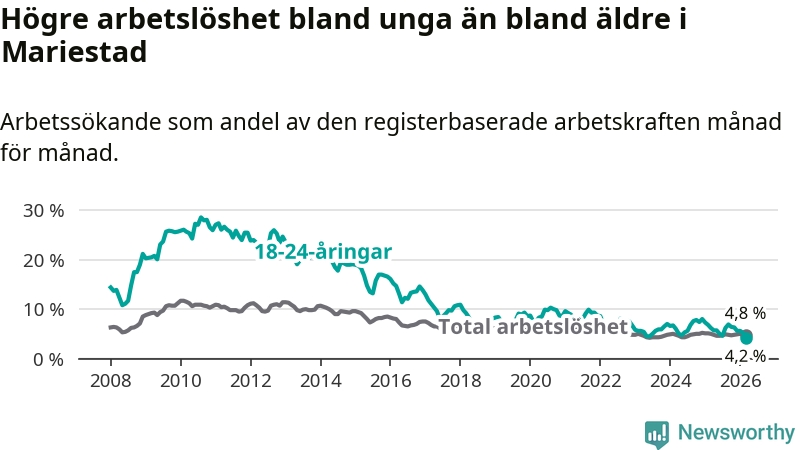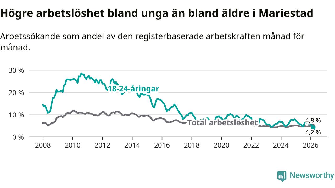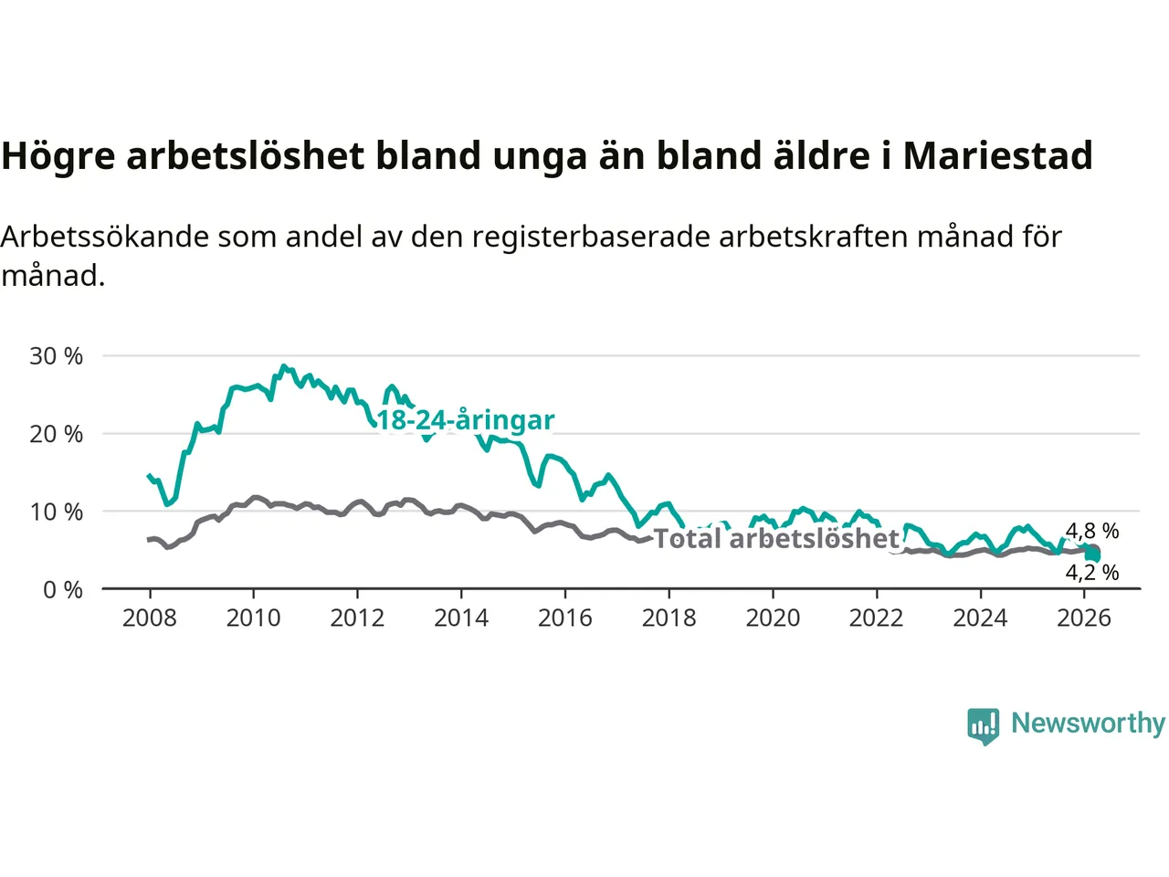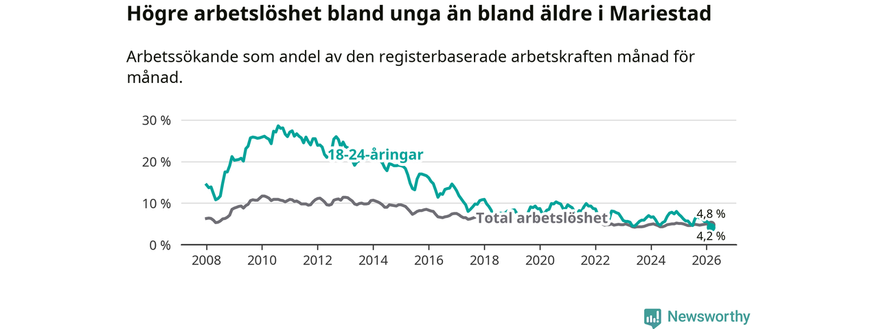 I och med den senaste månadens nedgång har de ungas arbetslöshet i Mariestad sjunkit tio månader i följd (ner från 5,7 procent i maj 2025 till 4,2 procent nu). Den nuvarande arbetslöshetsnivån är den lägsta sedan januari 2008.