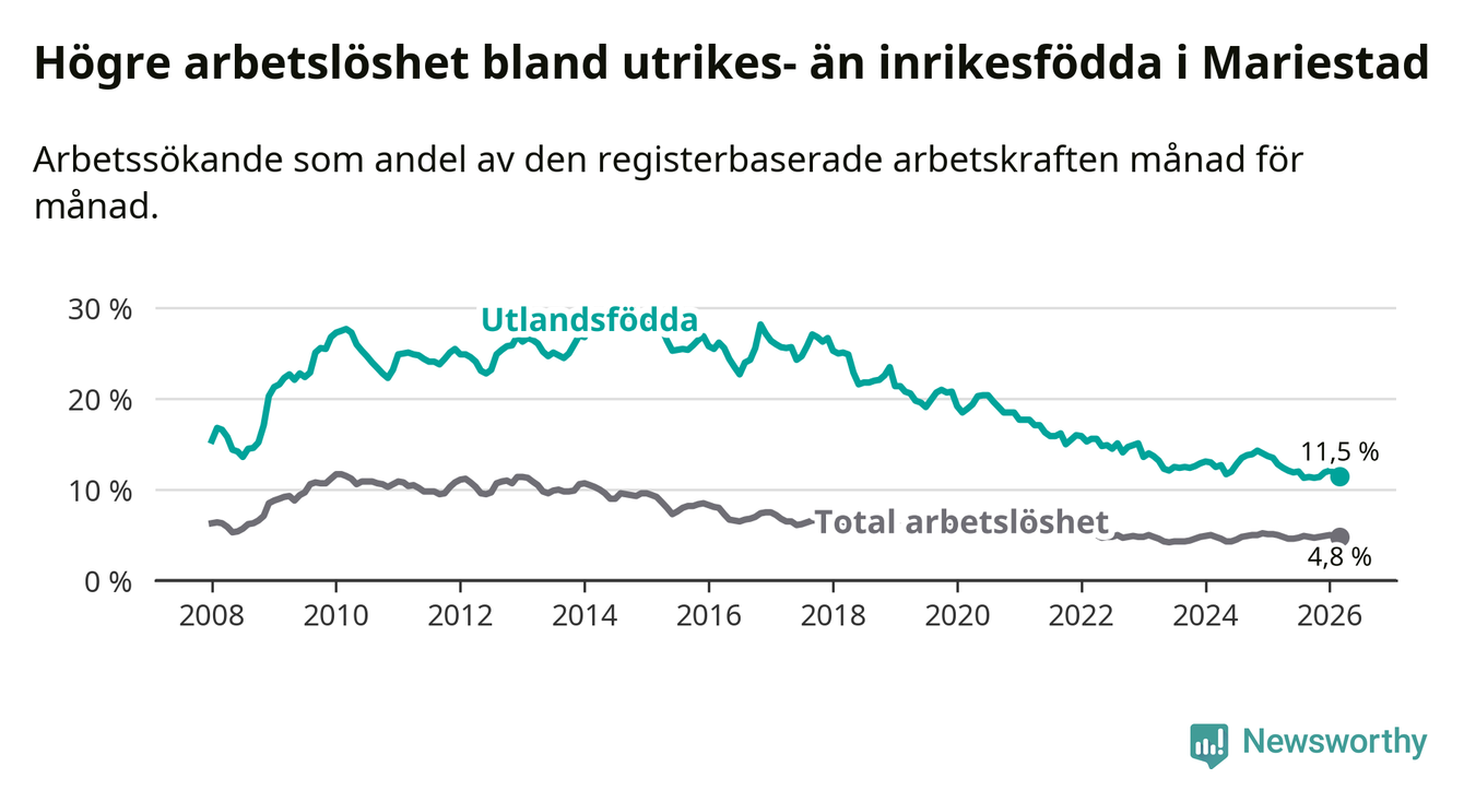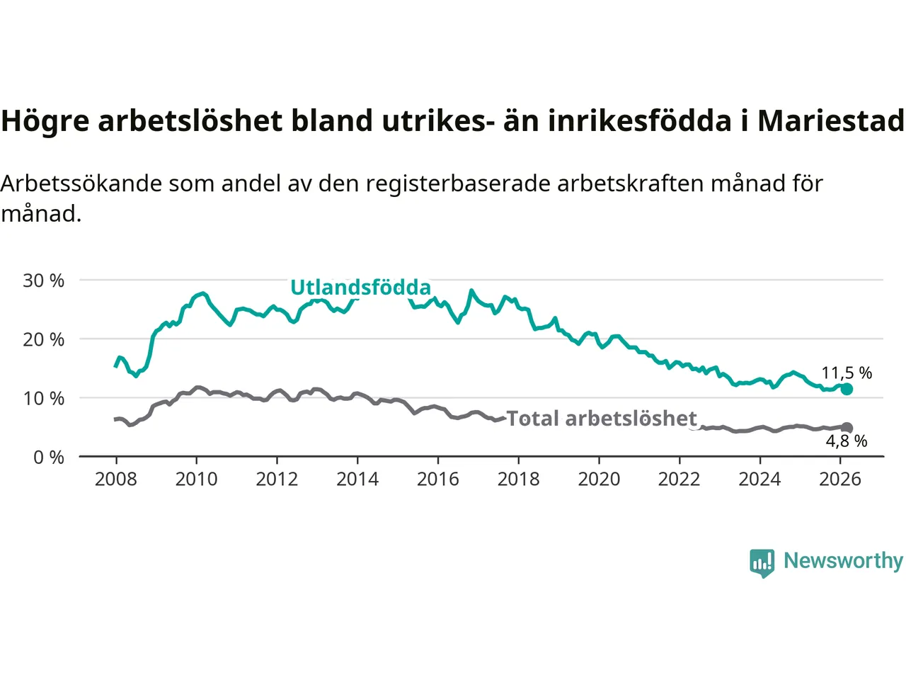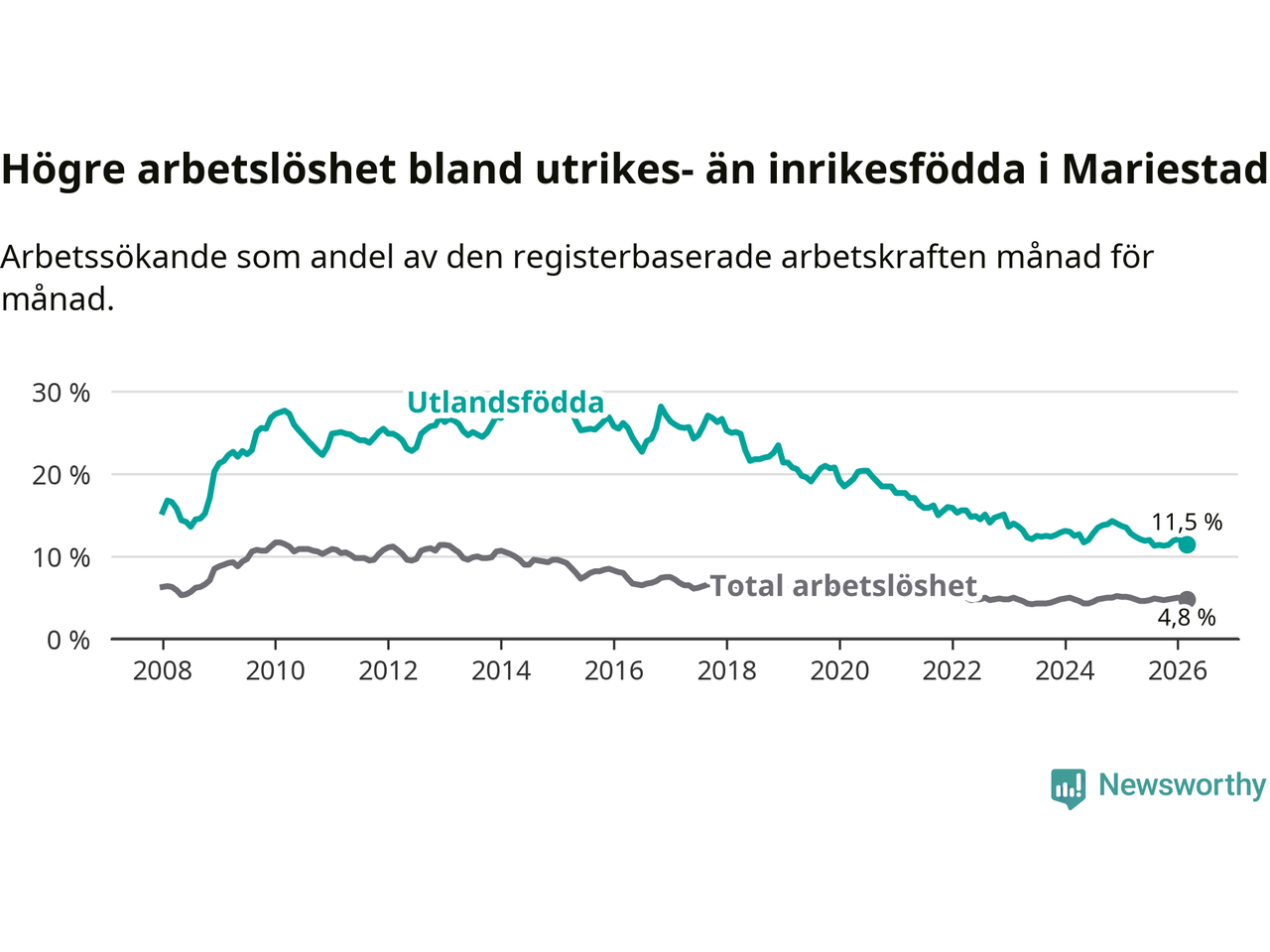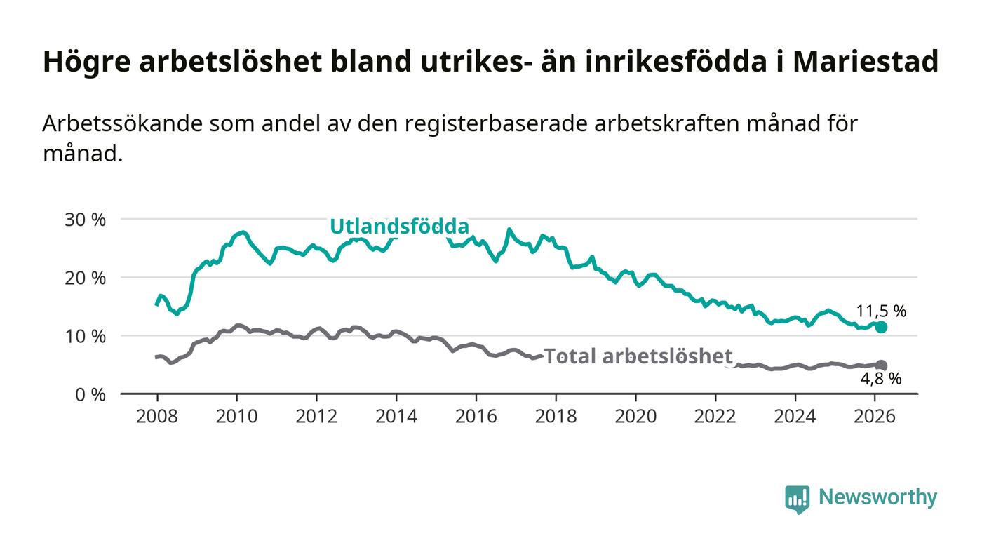 Arbetslösheten bland utlandsfödda var 11,5 procent i Mariestad under mars månad, motsvarande 188 av 1 635 personer. Det är 1,3 procentenheter färre än vid samma tidpunkt i fjol (−19 om man räknar personer). Därmed är de utlandsföddas arbetslöshet lägre än vid samma tidpunkt i fjol för tionde månaden i följd.