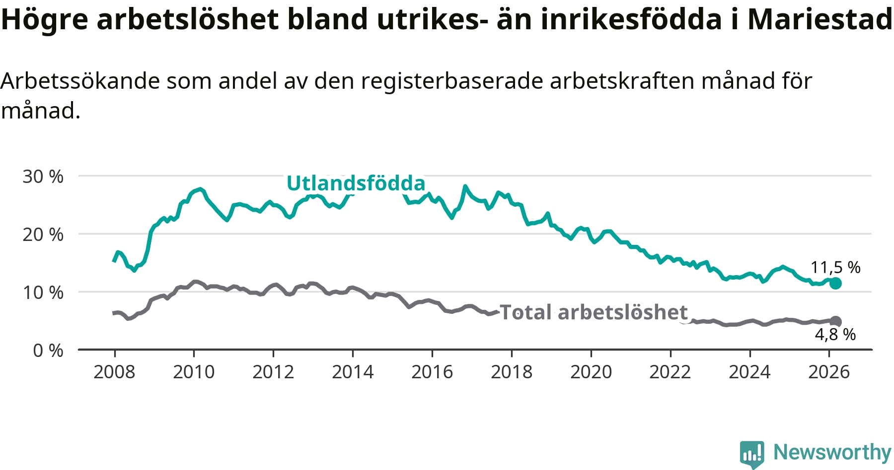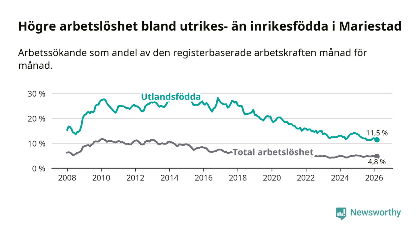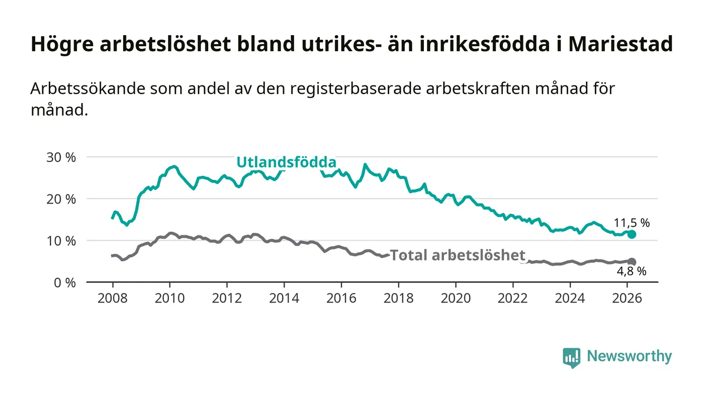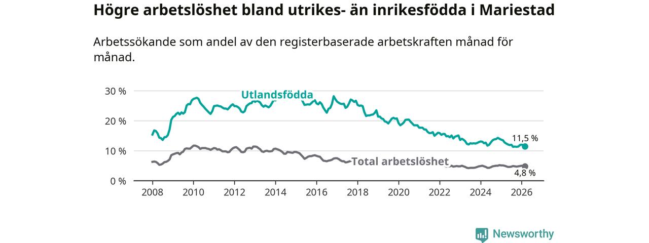 Arbetslösheten bland utlandsfödda var 11,5 procent i Mariestad under mars månad, motsvarande 188 av 1 635 personer. Det är 1,3 procentenheter färre än vid samma tidpunkt i fjol (−19 om man räknar personer). Därmed är de utlandsföddas arbetslöshet lägre än vid samma tidpunkt i fjol för tionde månaden i följd.