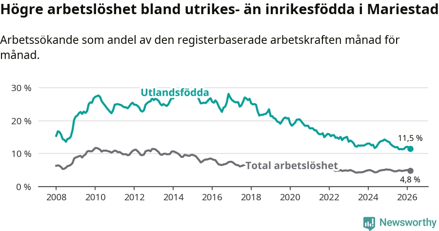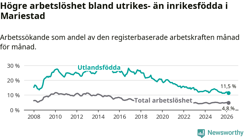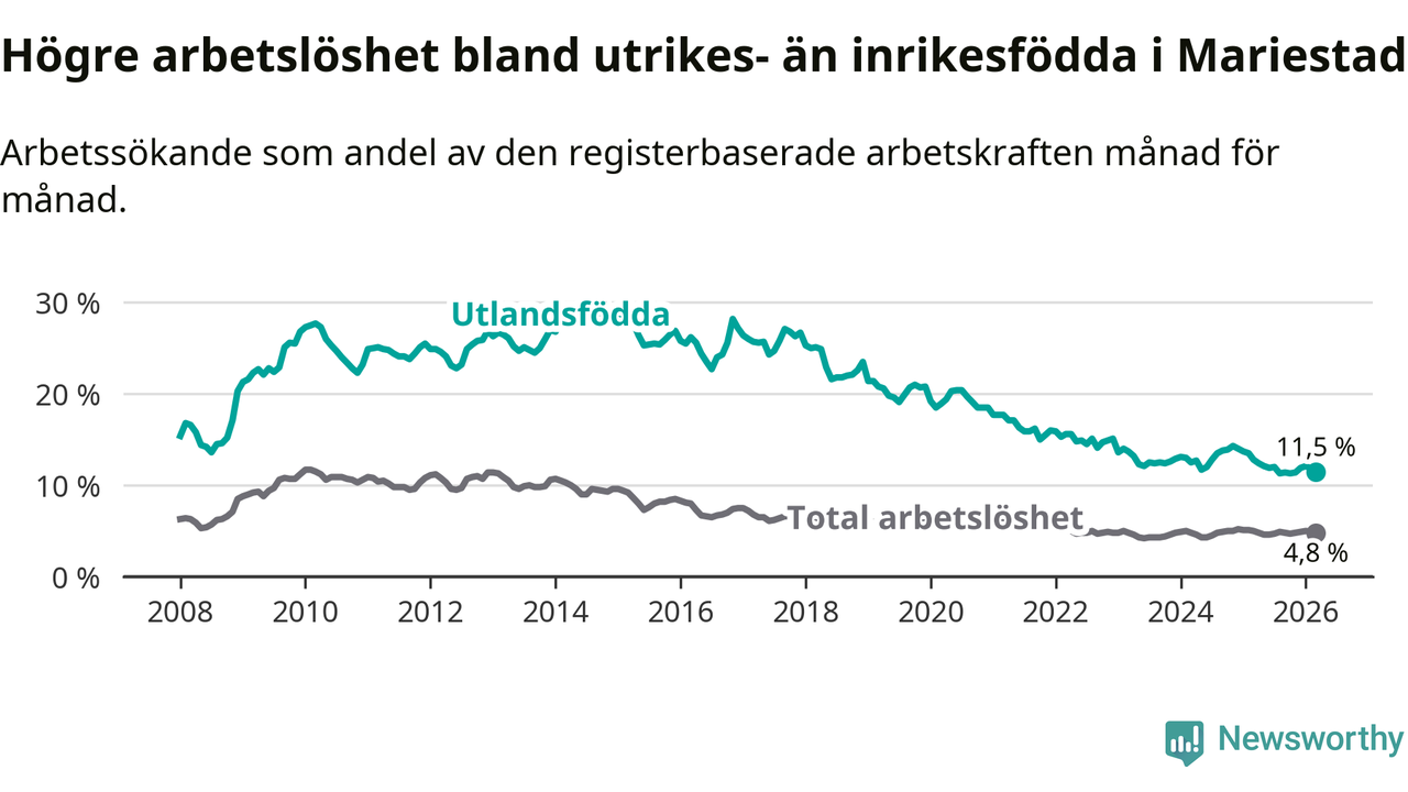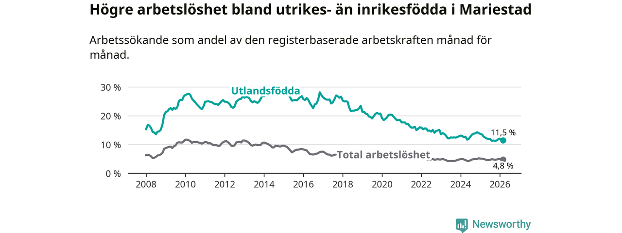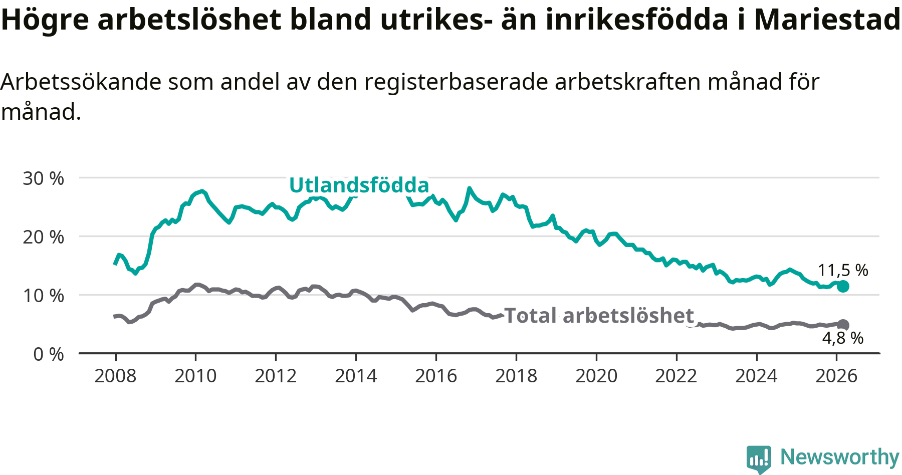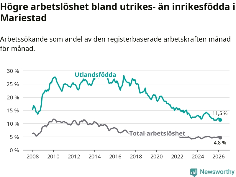 Arbetslösheten bland utlandsfödda var 11,5 procent i Mariestad under mars månad, motsvarande 188 av 1 635 personer. Det är 1,3 procentenheter färre än vid samma tidpunkt i fjol (−19 om man räknar personer). Därmed är de utlandsföddas arbetslöshet lägre än vid samma tidpunkt i fjol för tionde månaden i följd.