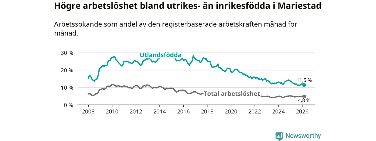 Skillnaden i arbetslöshet mellan utrikesfödda och hela befolkningen är 6,7 procentenheter i Mariestad. Det är en mindre skillnad än för ett år sedan (−1,1 procentenheter).