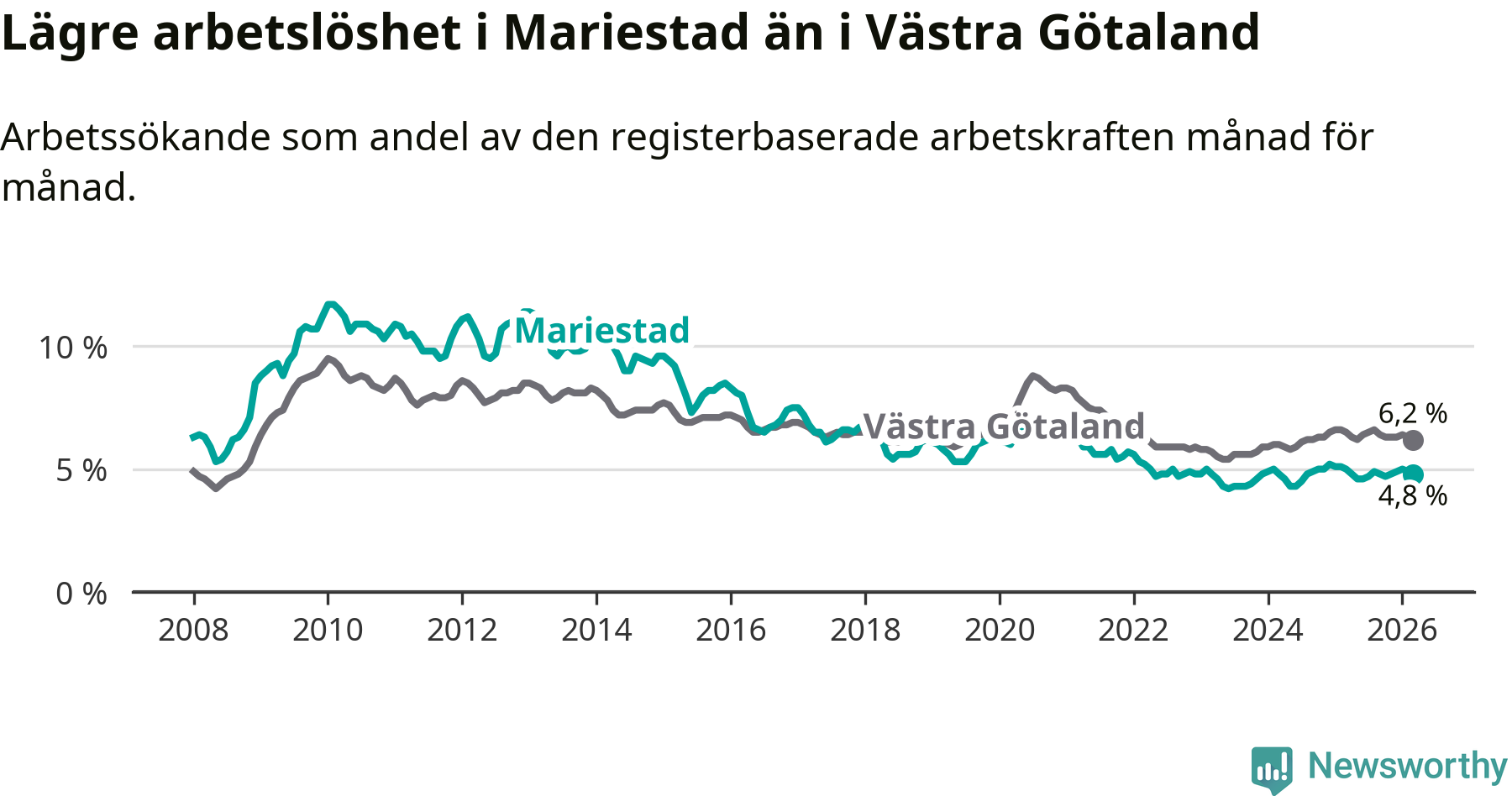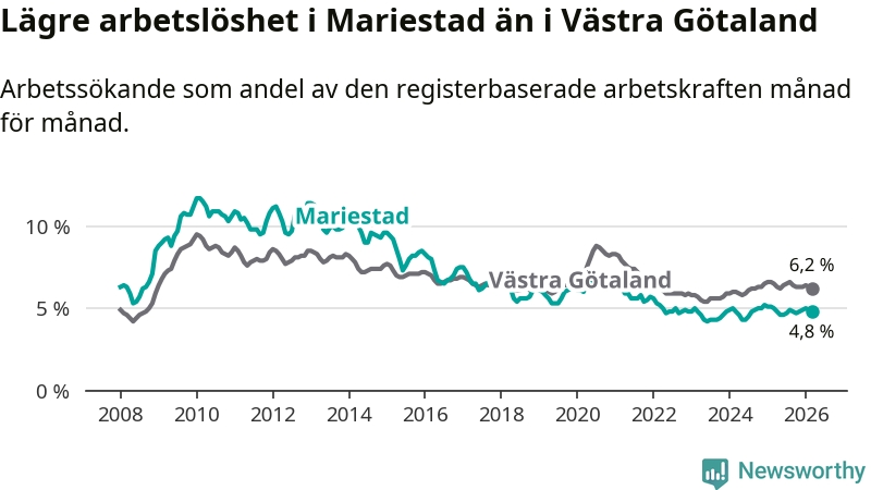 Mariestad hade redan tidigare lägre arbetslöshet än snittet i hela Västra Götalands län och nu växer klyftan (4,8 procent i kommunen, jämfört med 6,2 procent i hela länet). Öckerö har den lägsta arbetslösheten i länet (2,6 procent), medan Gullspång har den högsta (8,1 procent). För att Mariestad skulle komma ner i samma arbetslöshetsnivå som Öckerö skulle 258 personer behöva sysselsättas.