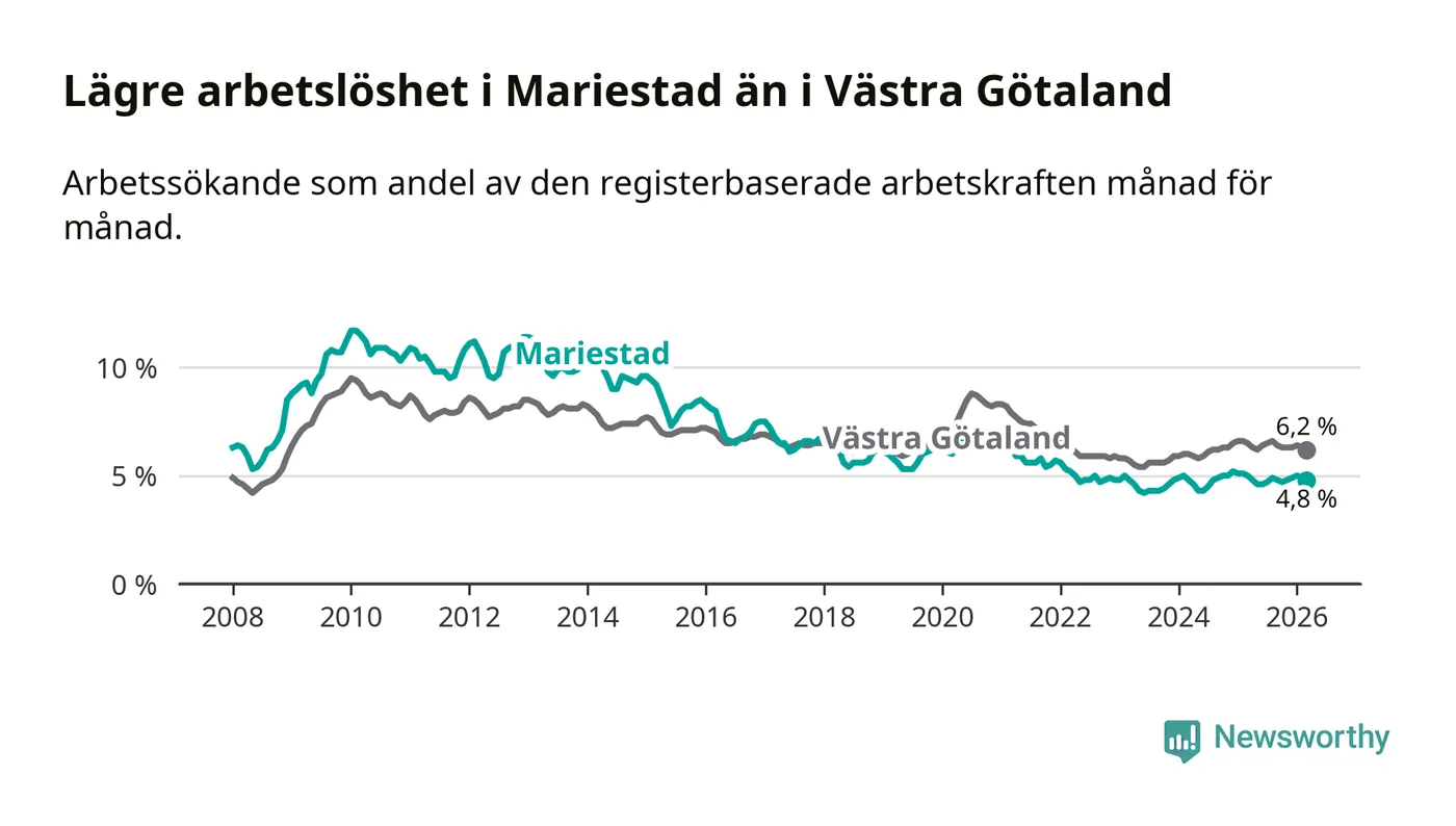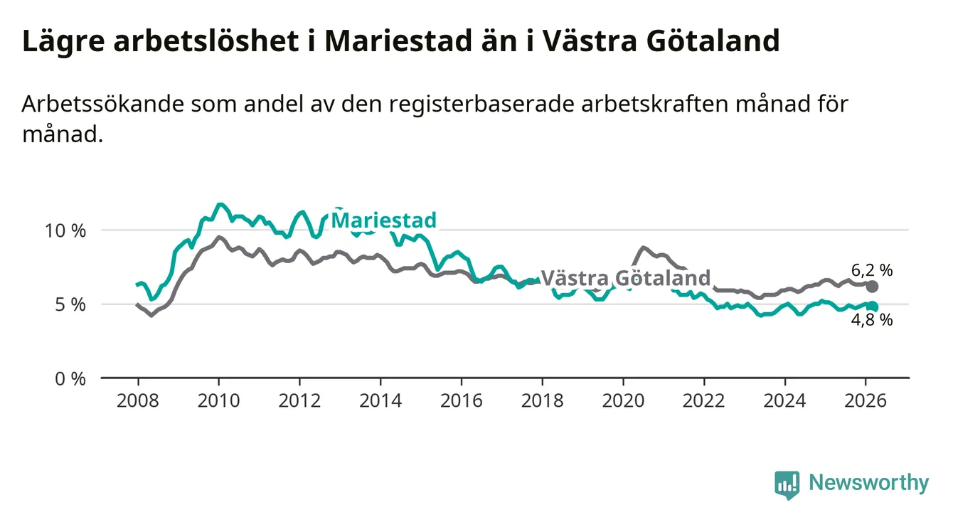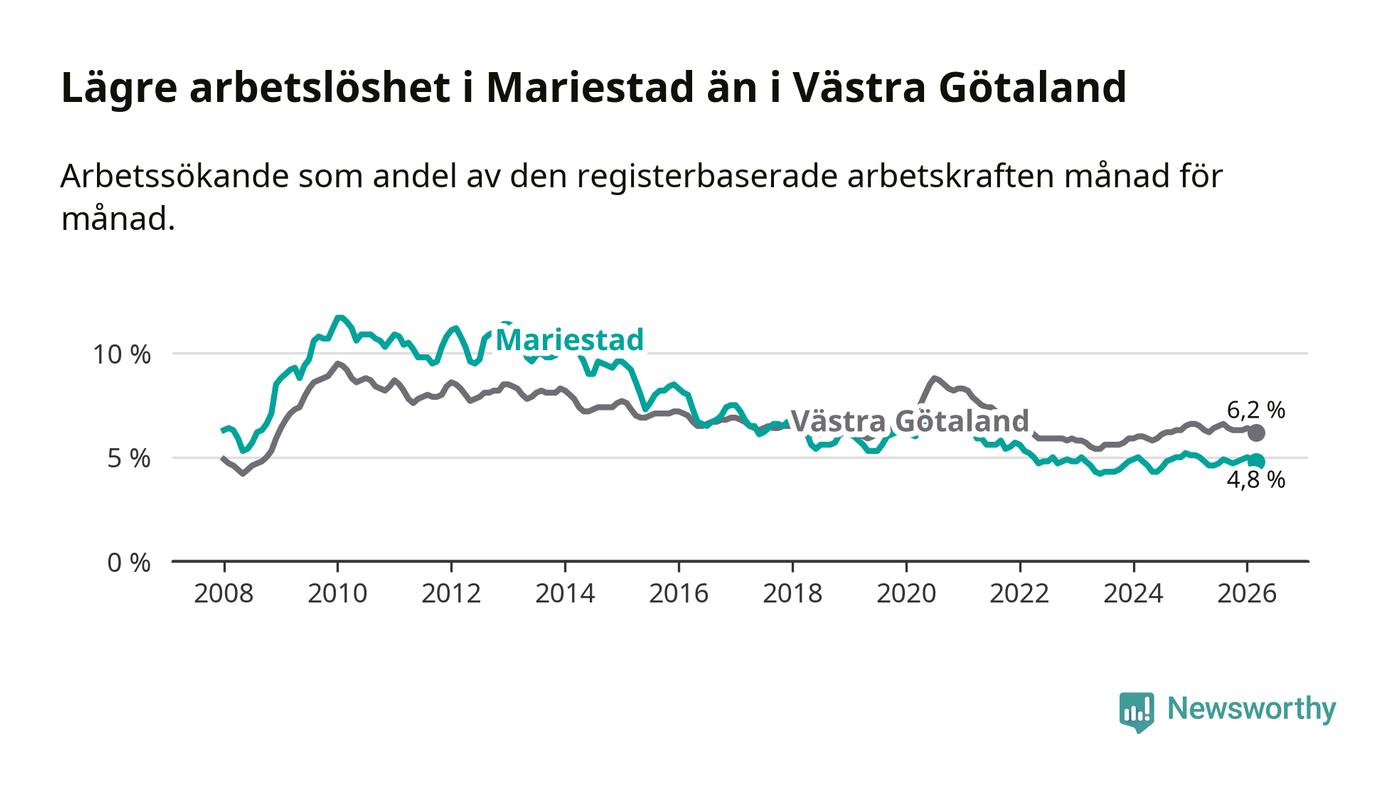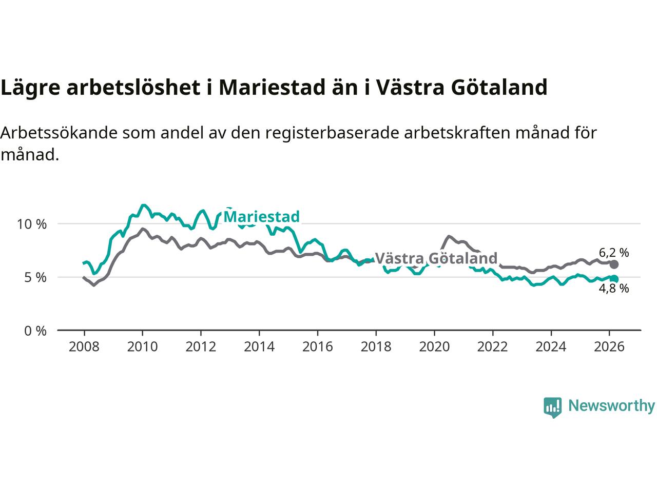 Under mars månad rapporterade Mariestads kommun en total arbetslöshet på 4,8 procent. Det är en minskning jämfört med samma tidpunkt i fjol (−0,2 procentenheter). Även i Västra Götalands län sjunker arbetslösheten .