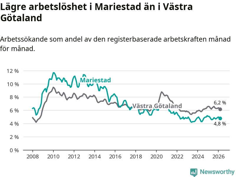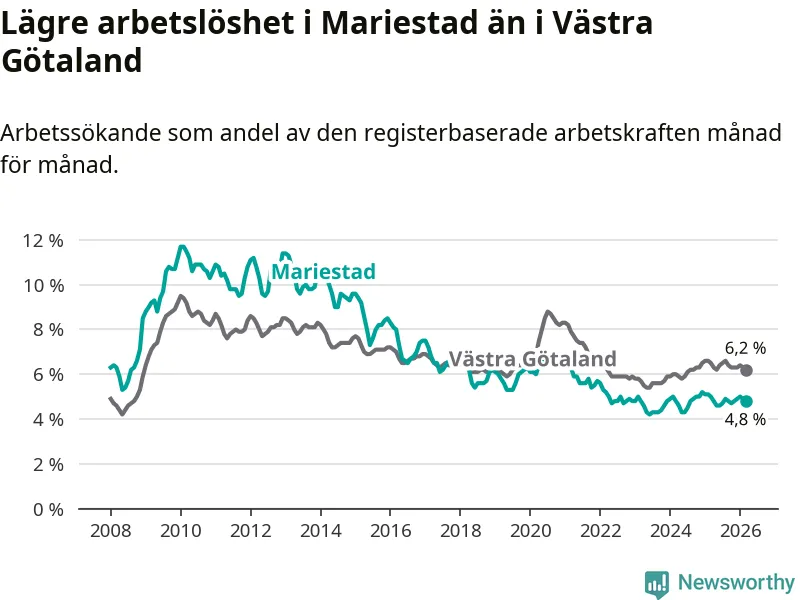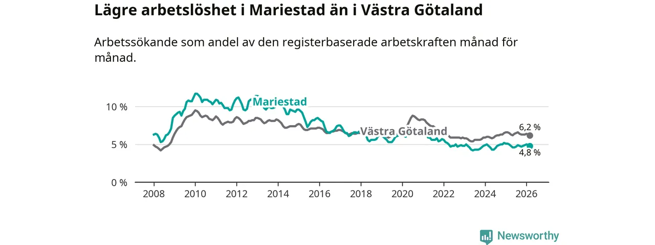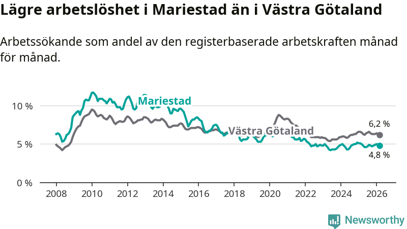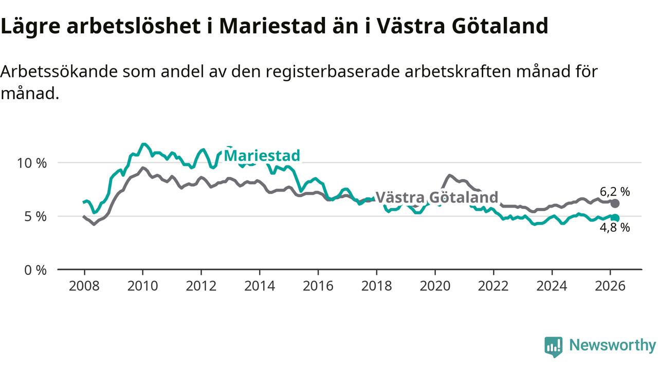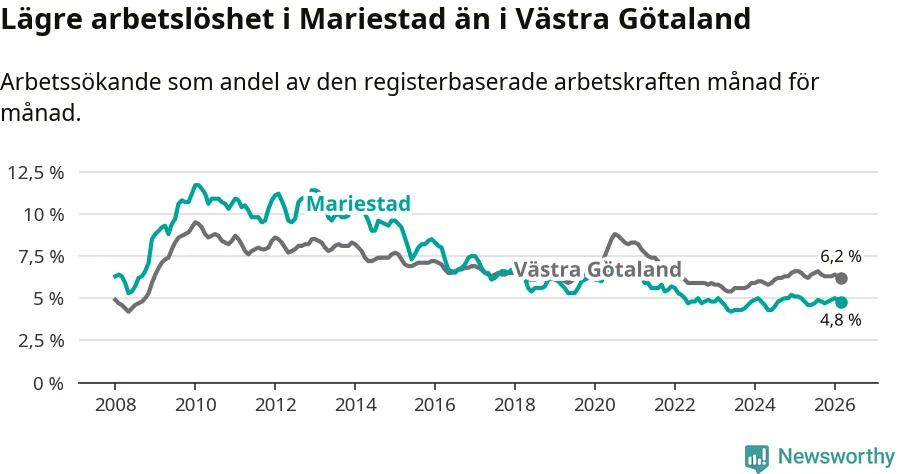 Under mars månad rapporterade Mariestads kommun en total arbetslöshet på 4,8 procent. Det är en minskning jämfört med samma tidpunkt i fjol (−0,2 procentenheter). Även i Västra Götalands län sjunker arbetslösheten .