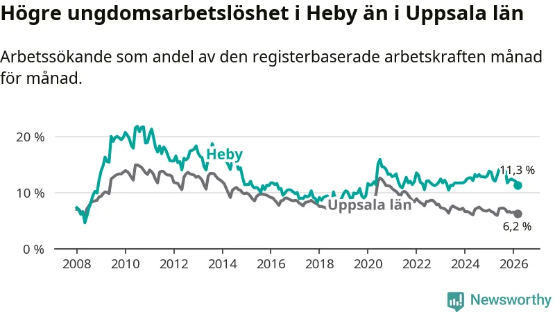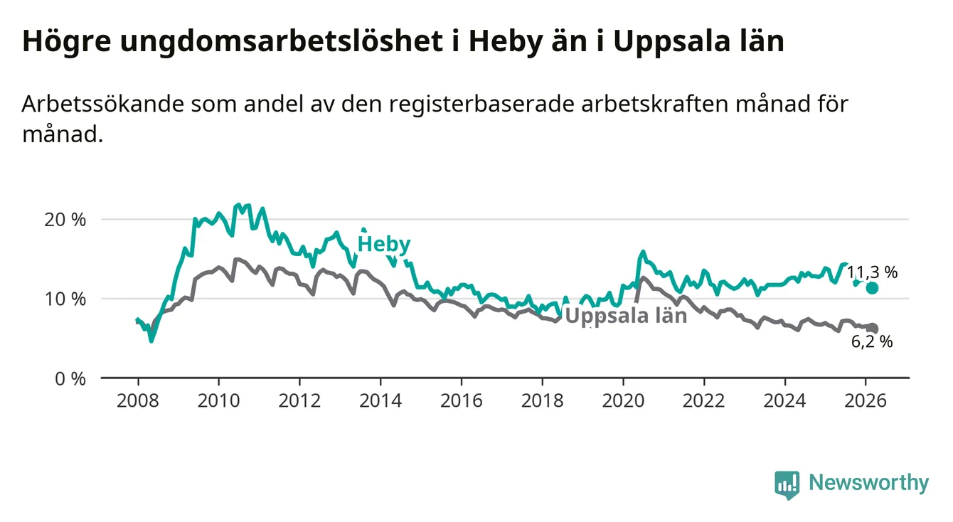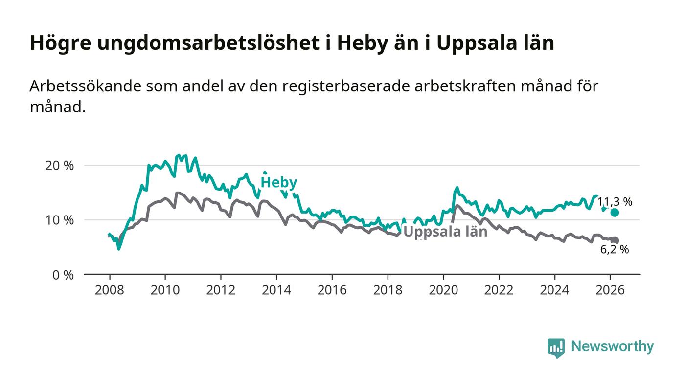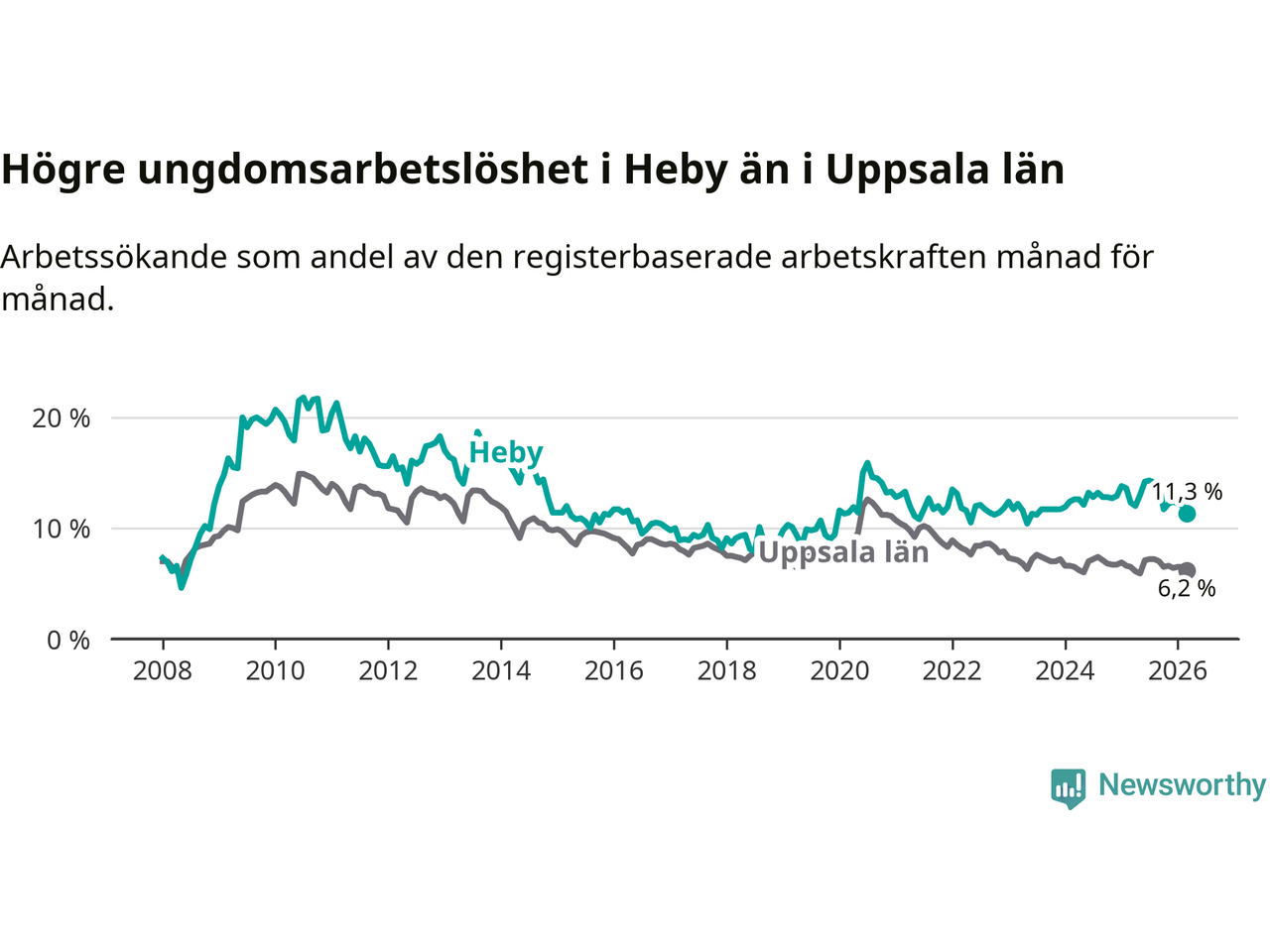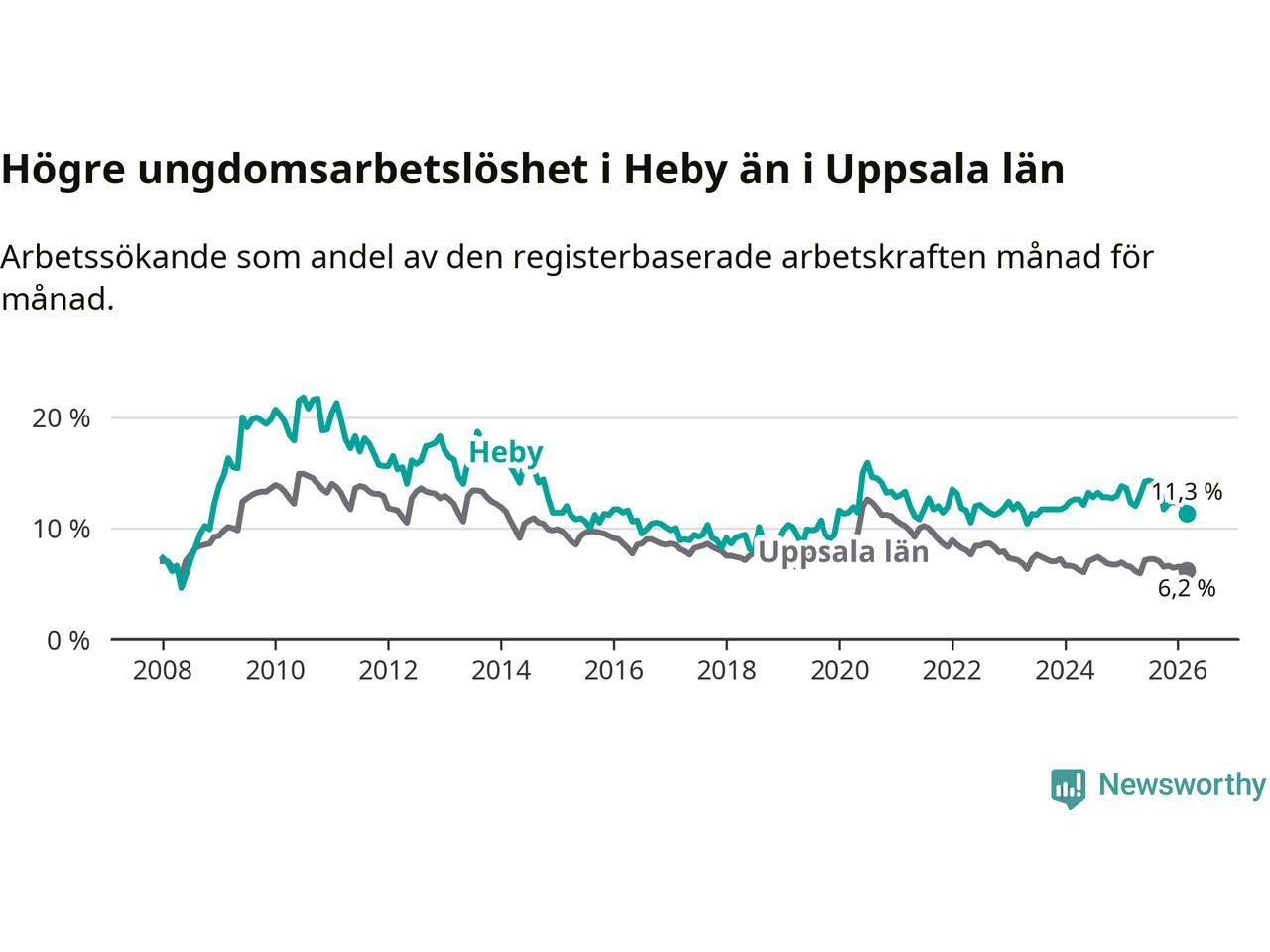 Precis som den totala arbetslösheten ligger ungdomsarbetslösheten i Heby högre än i Uppsala som helhet. Skillnaden mellan kommunen och länet är 5,1 procentenheter.