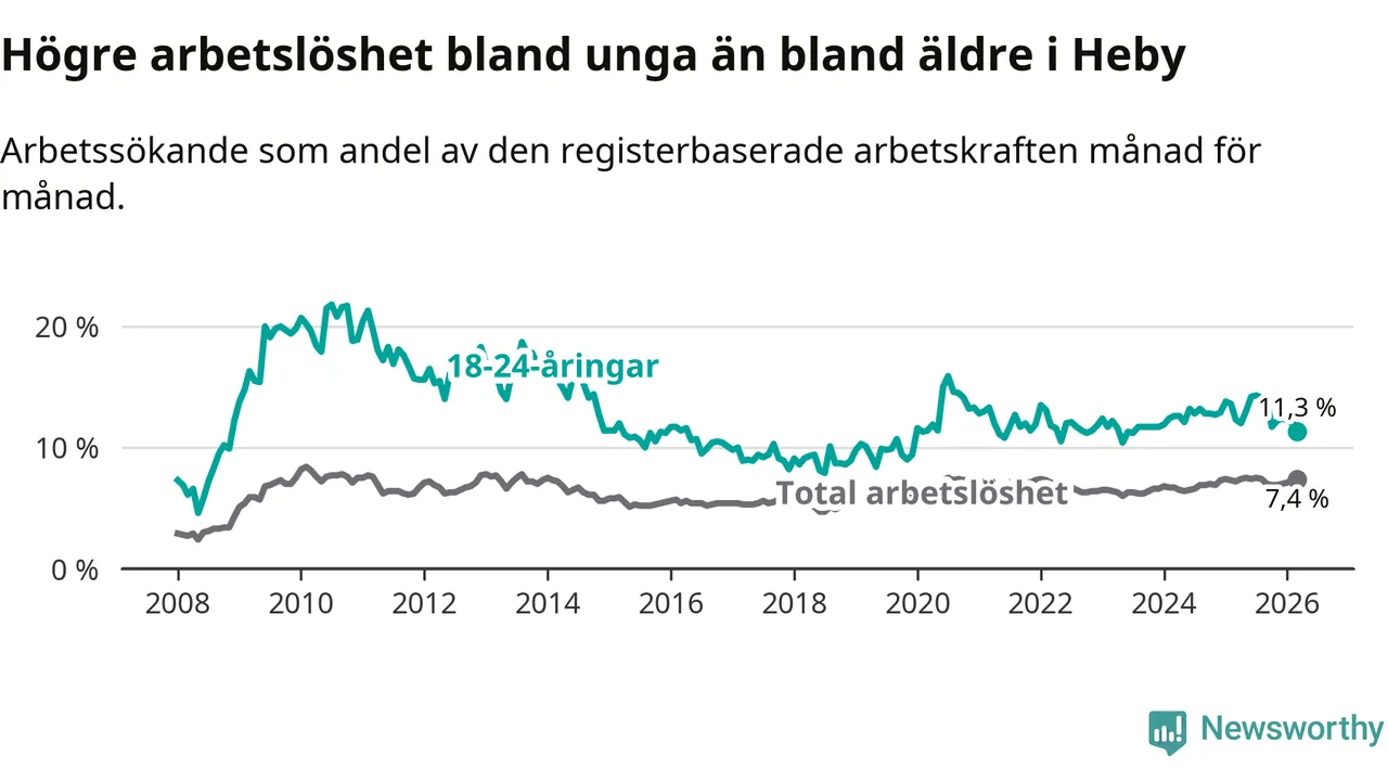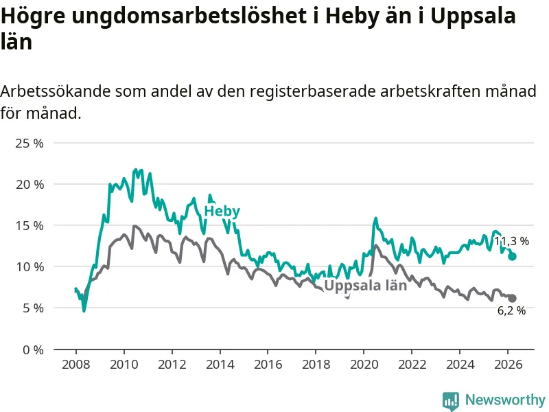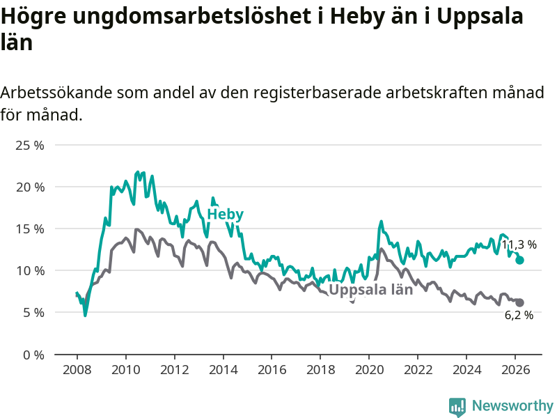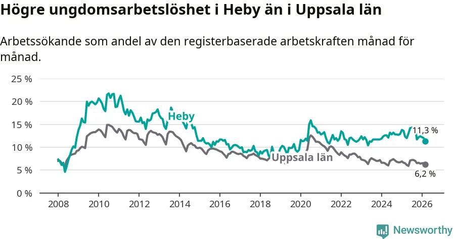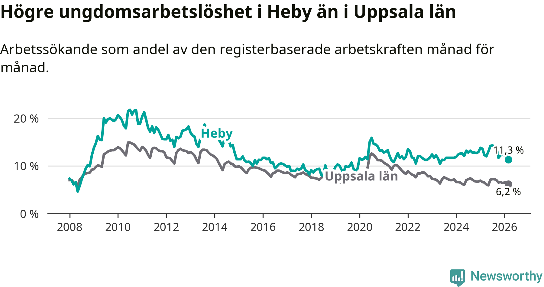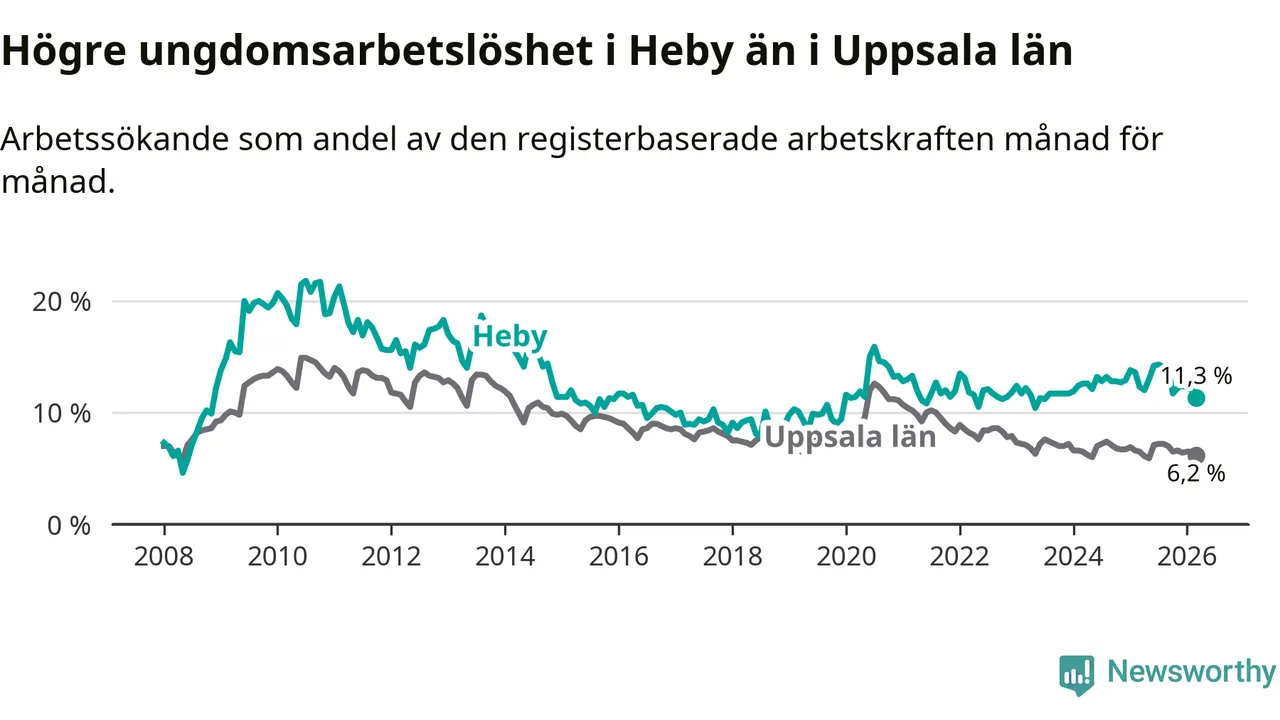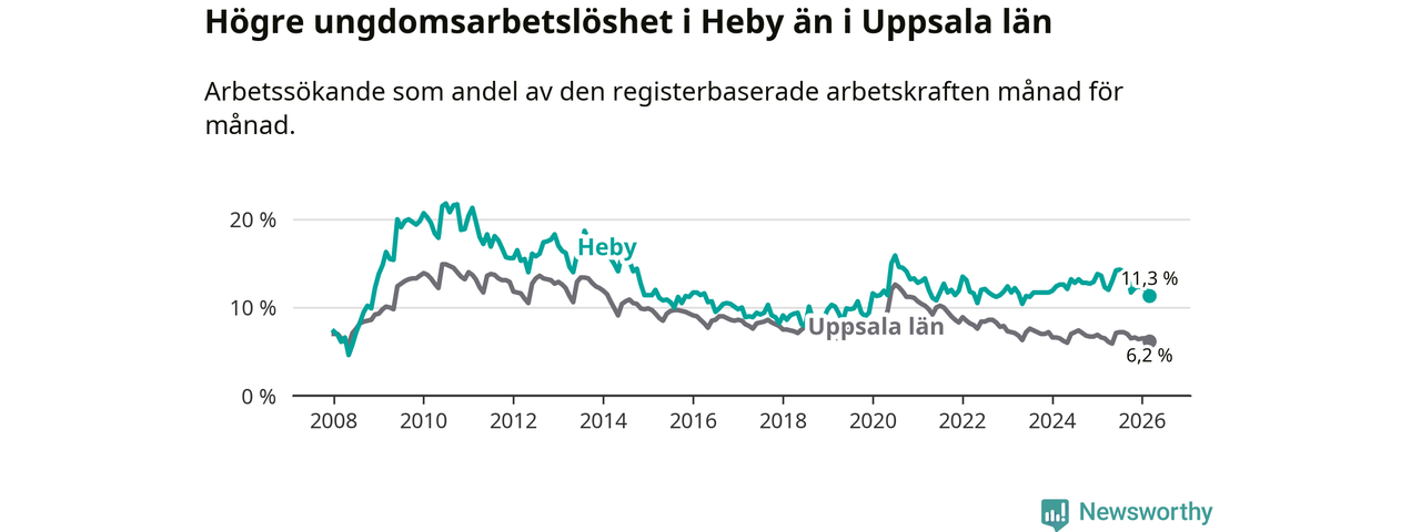 Precis som den totala arbetslösheten ligger ungdomsarbetslösheten i Heby högre än i Uppsala som helhet. Skillnaden mellan kommunen och länet är 5,1 procentenheter.