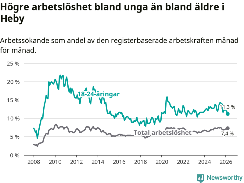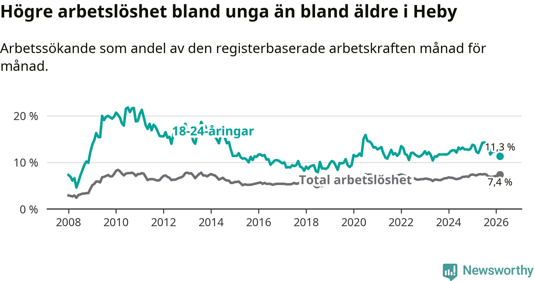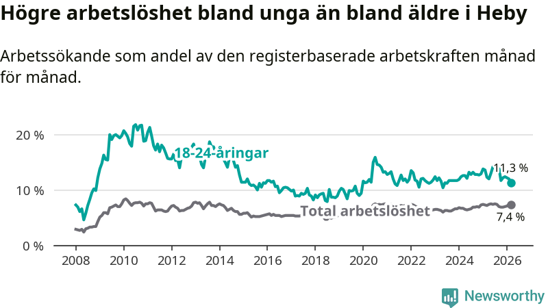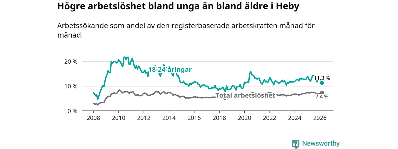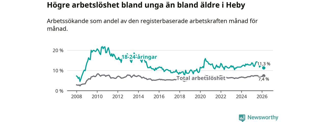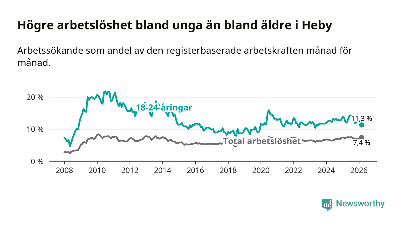 Precis som den totala arbetslösheten ligger ungdomsarbetslösheten i Heby högre än i Uppsala som helhet. Skillnaden mellan kommunen och länet är 5,1 procentenheter.