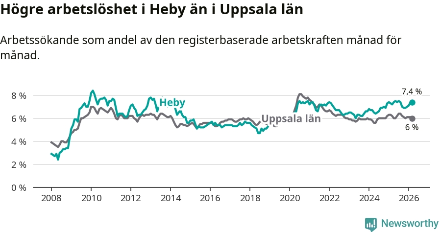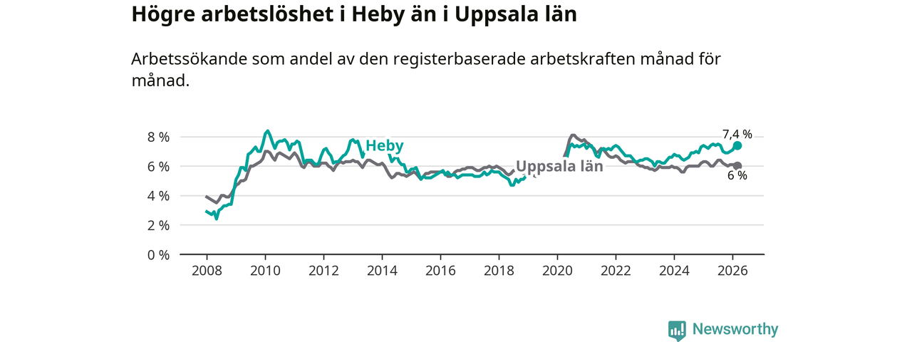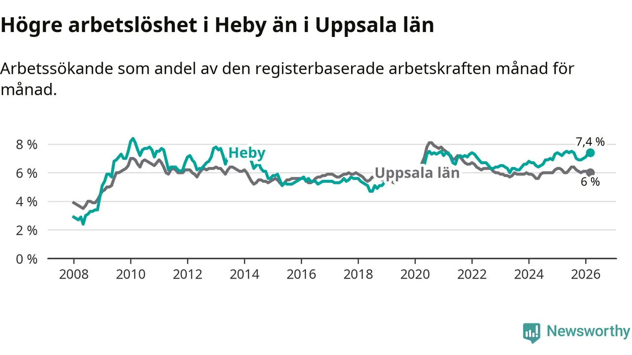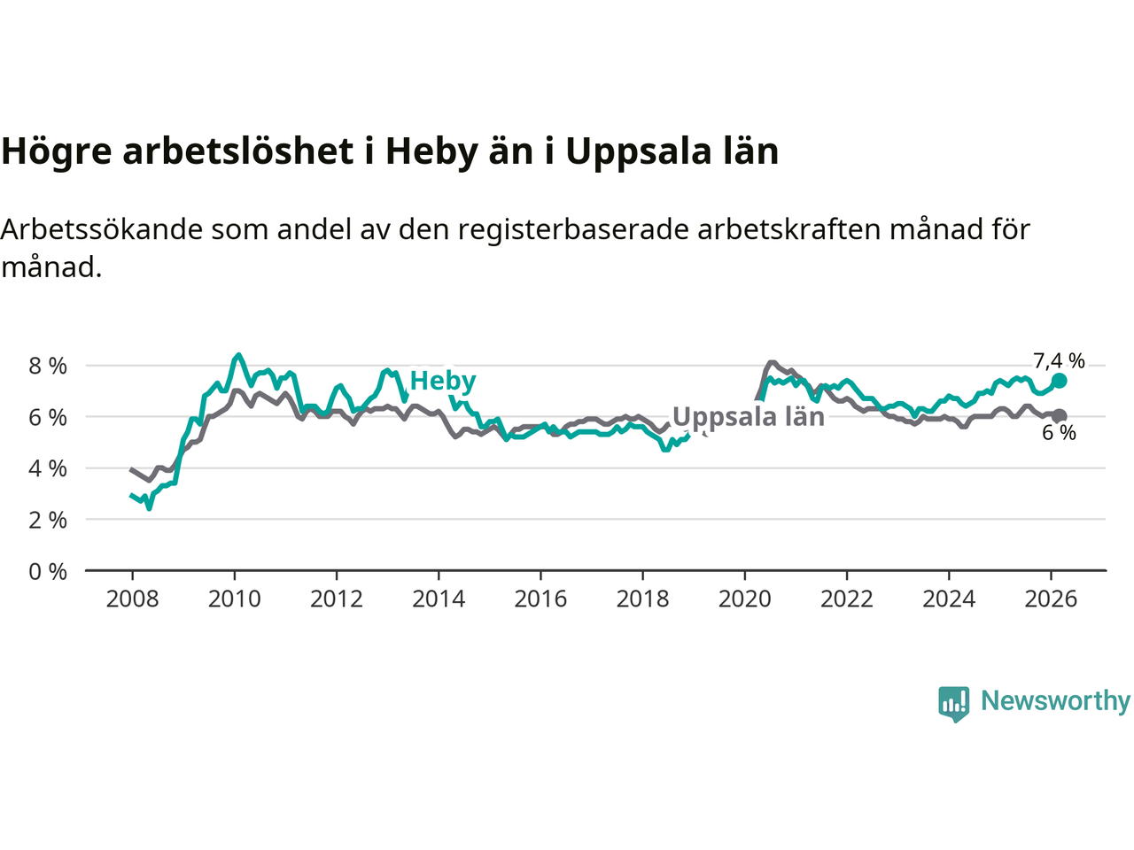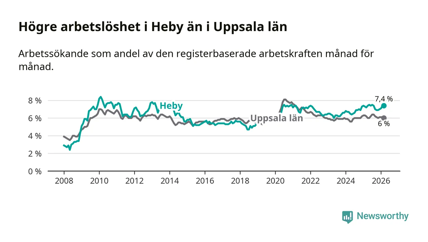 Under mars månad rapporterade Heby kommun en total arbetslöshet på 7,4 procent. Det är en ökning jämfört med samma tidpunkt i fjol (+0,2 procentenheter). I Uppsala län däremot sjunker arbetslösheten .