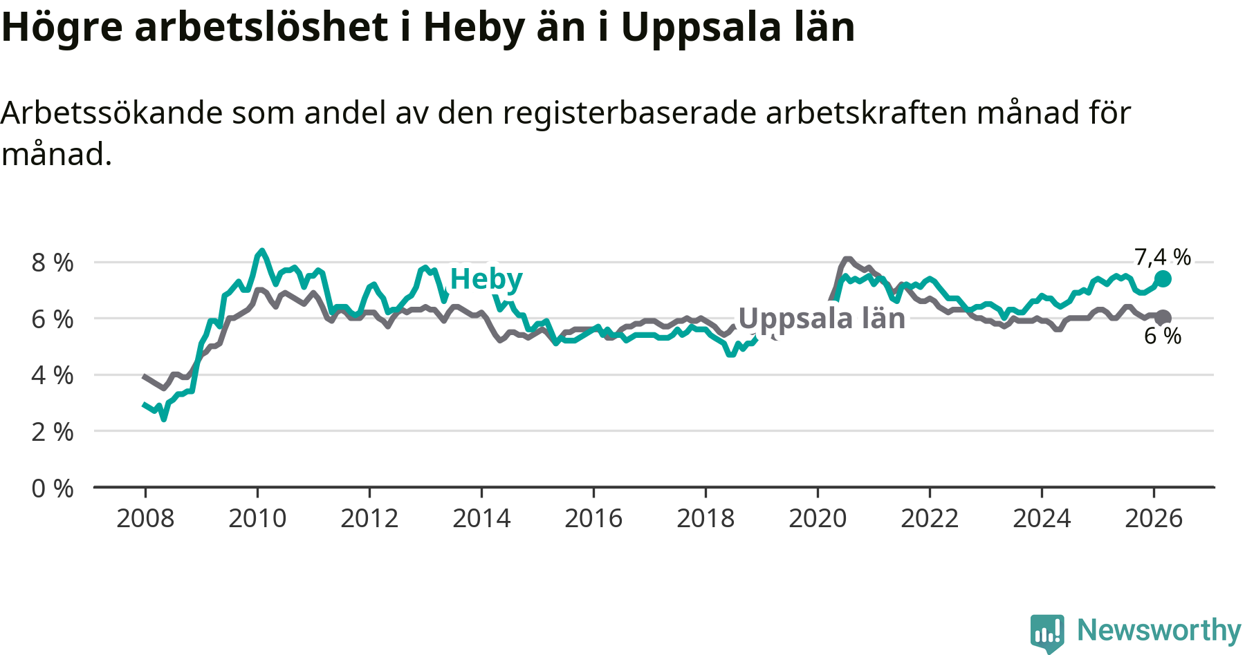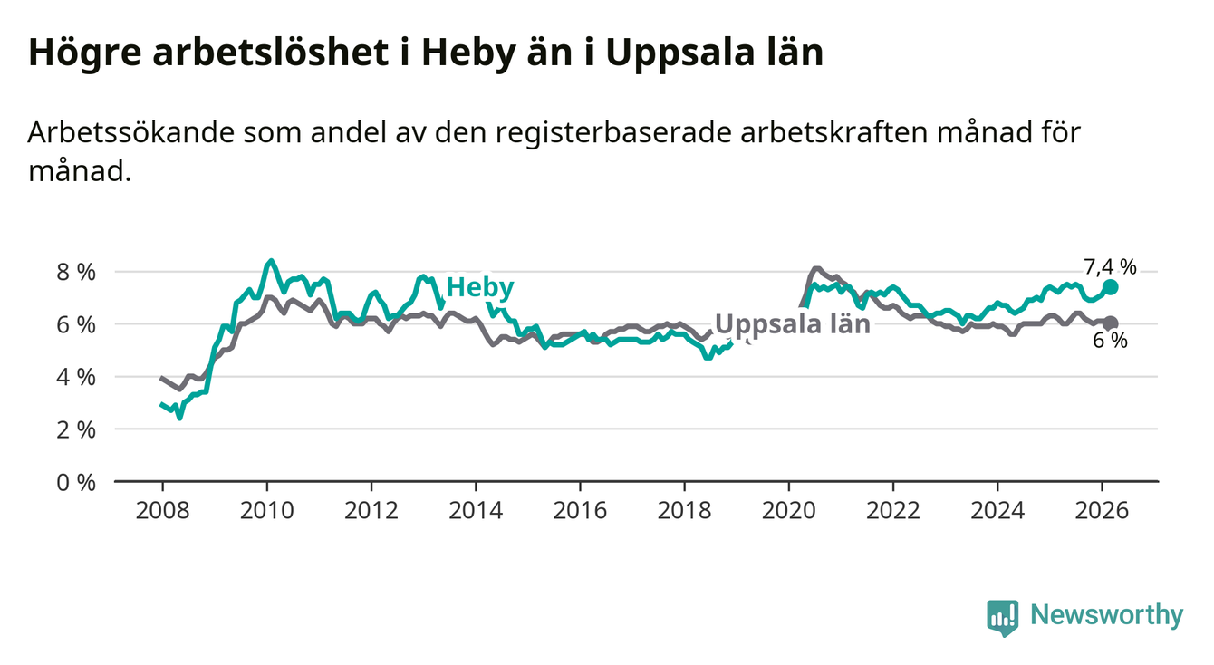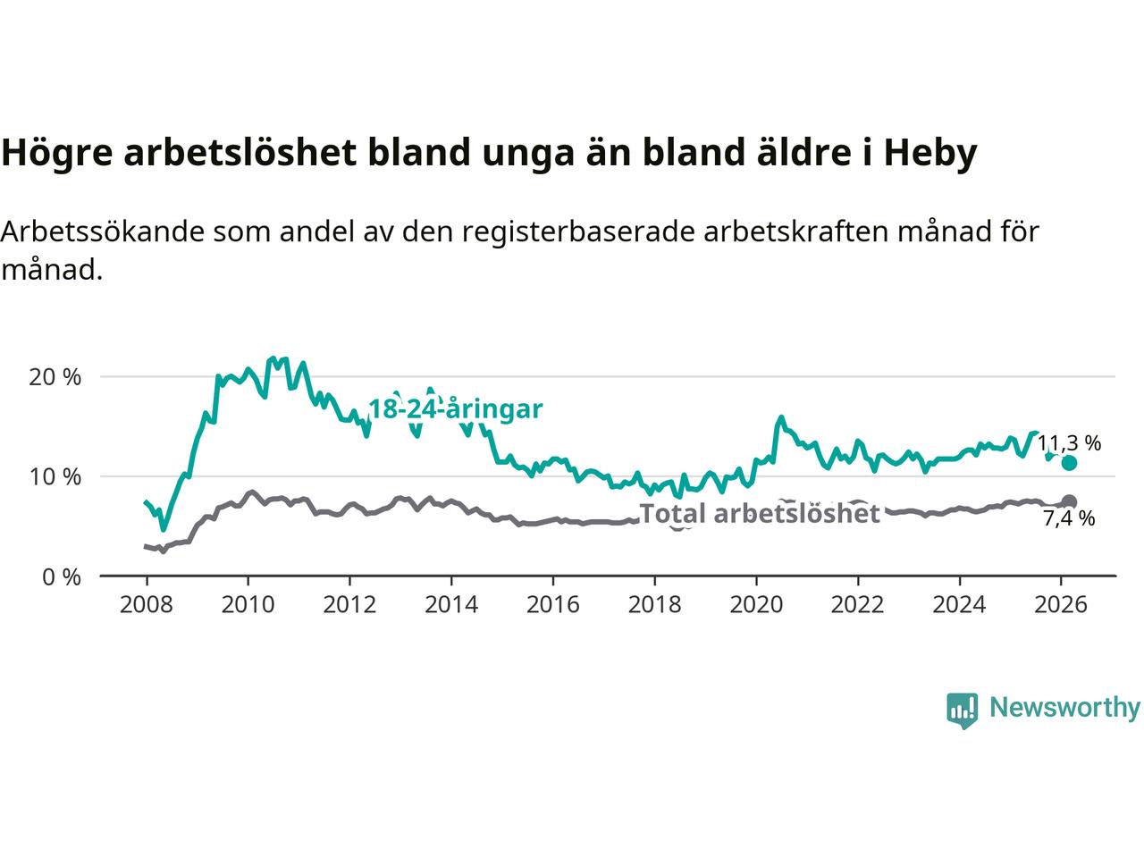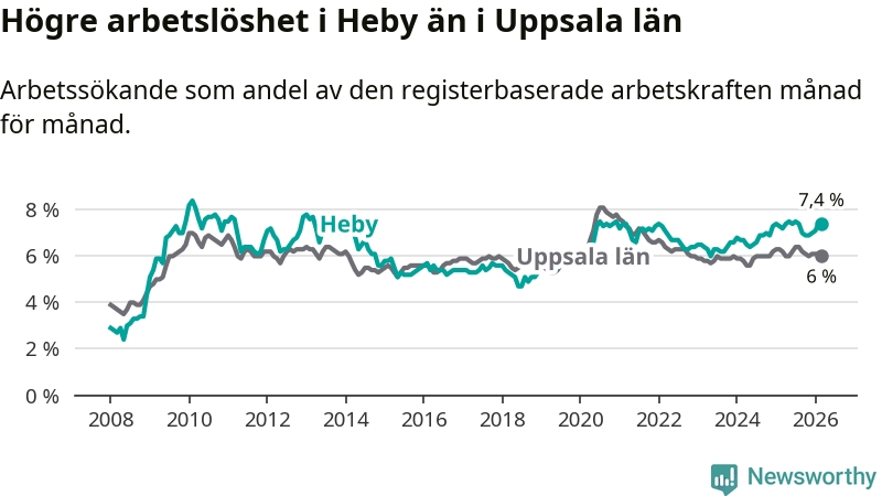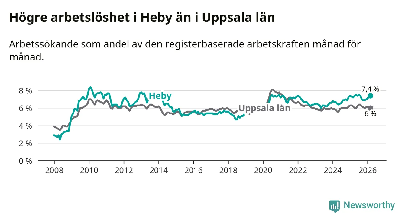 Under mars månad rapporterade Heby kommun en total arbetslöshet på 7,4 procent. Det är en ökning jämfört med samma tidpunkt i fjol (+0,2 procentenheter). I Uppsala län däremot sjunker arbetslösheten .
