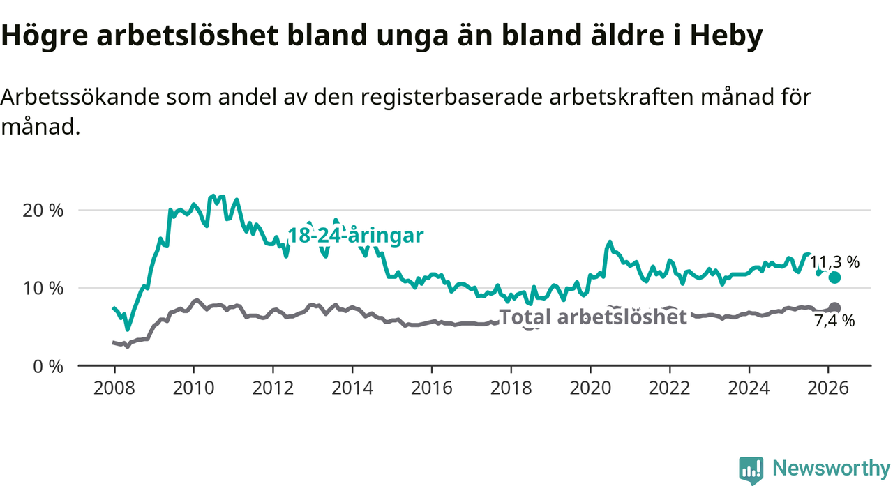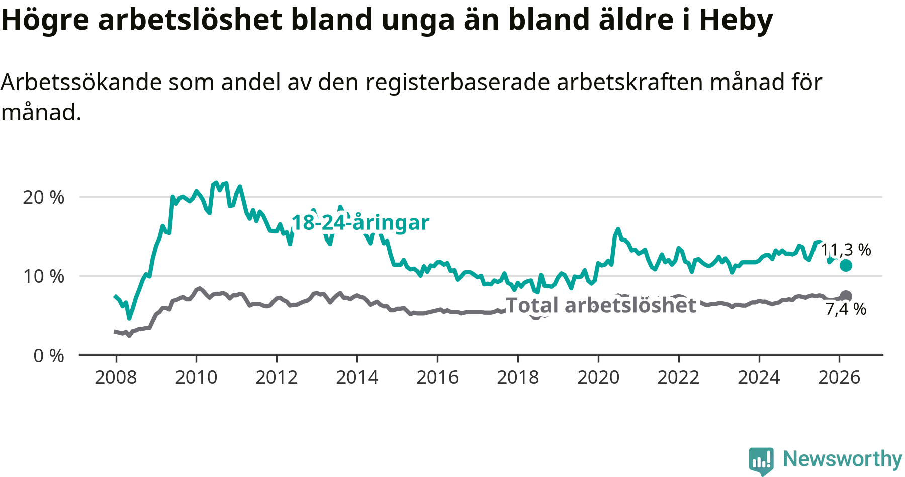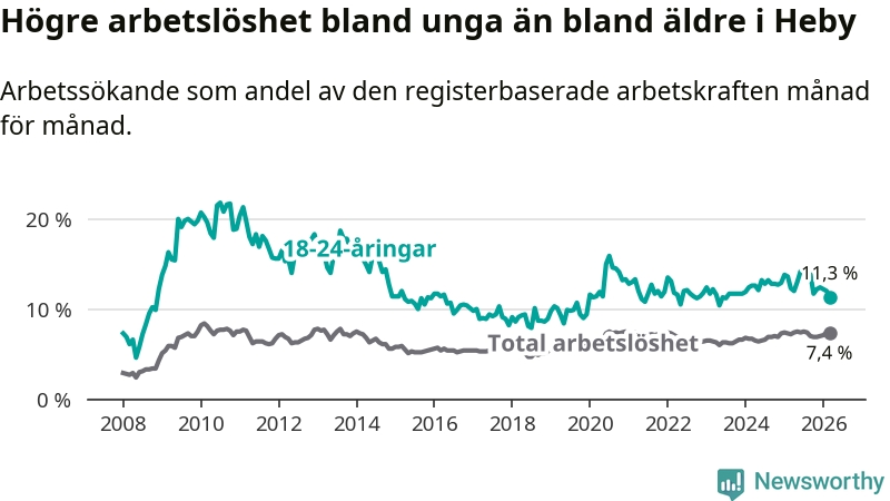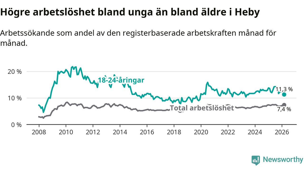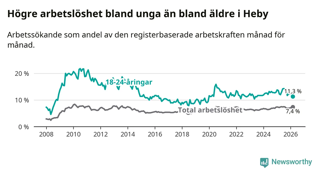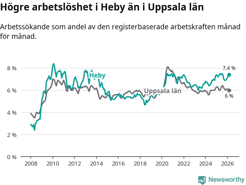 Under mars månad rapporterade Heby kommun en total arbetslöshet på 7,4 procent. Det är en ökning jämfört med samma tidpunkt i fjol (+0,2 procentenheter). I Uppsala län däremot sjunker arbetslösheten .