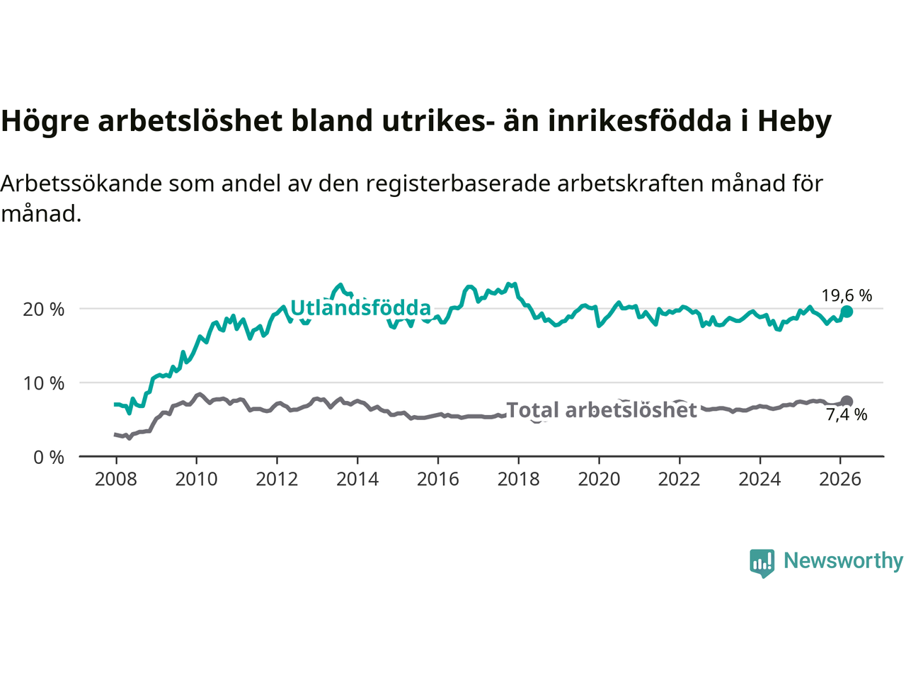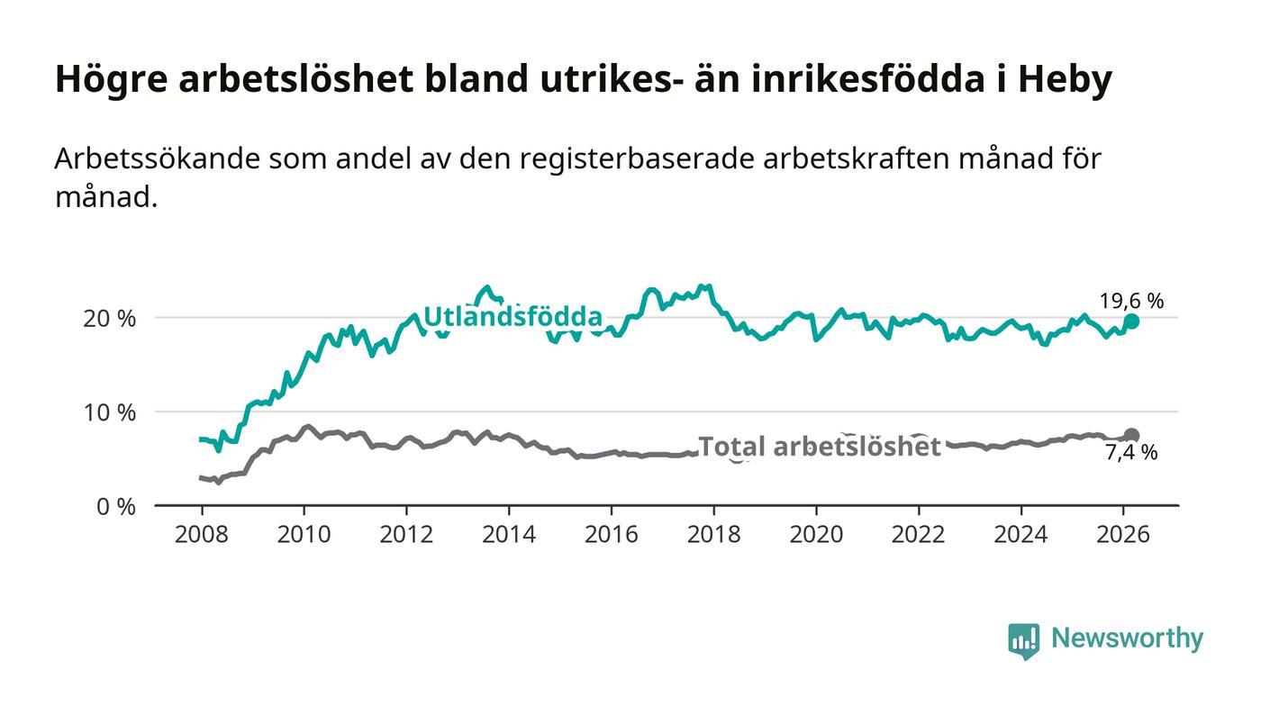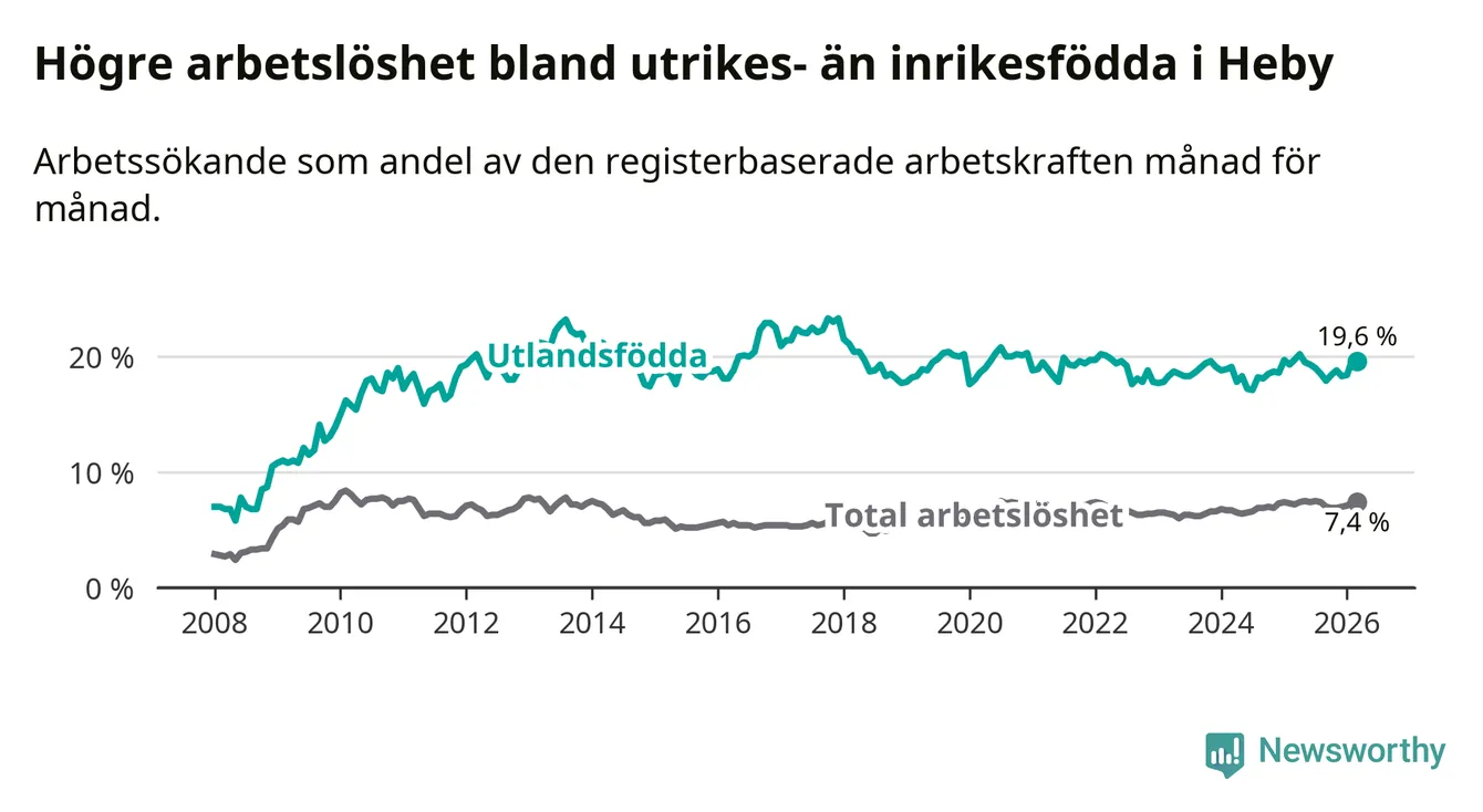 Arbetslösheten bland utlandsfödda var 19,6 procent i Heby under mars månad, motsvarande 206 av 1 051 personer. Det är 0,1 procentenheter färre än vid samma tidpunkt i fjol (−5 om man räknar personer). Den senaste månadens nedgång innebär ett trendbrott. Under de ett föregående månaderna hade arbetslösheten bland utlandsfödda varit högre än motsvarande tidpunkt året innan.