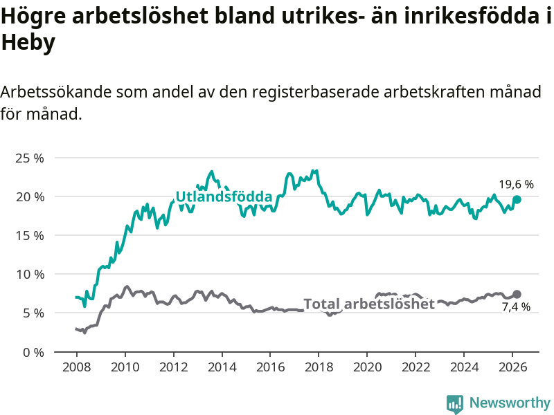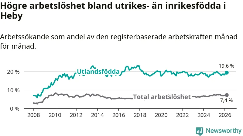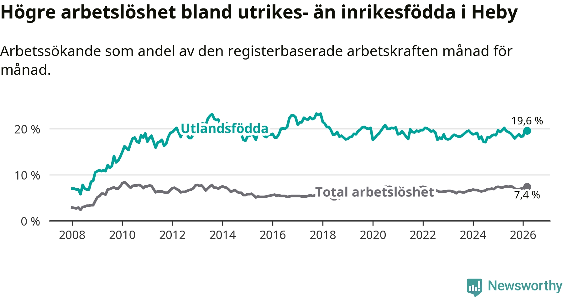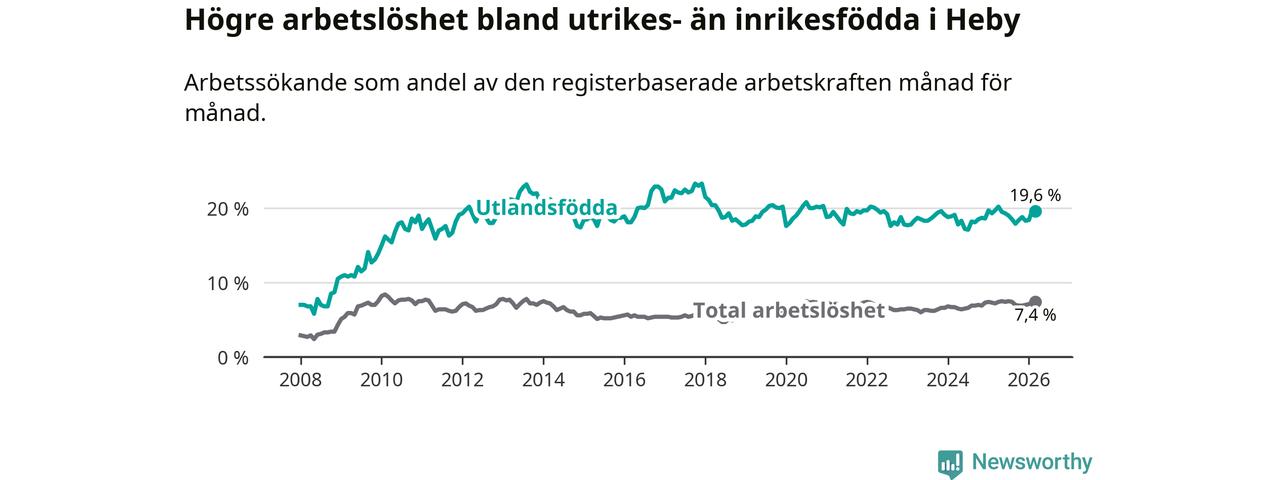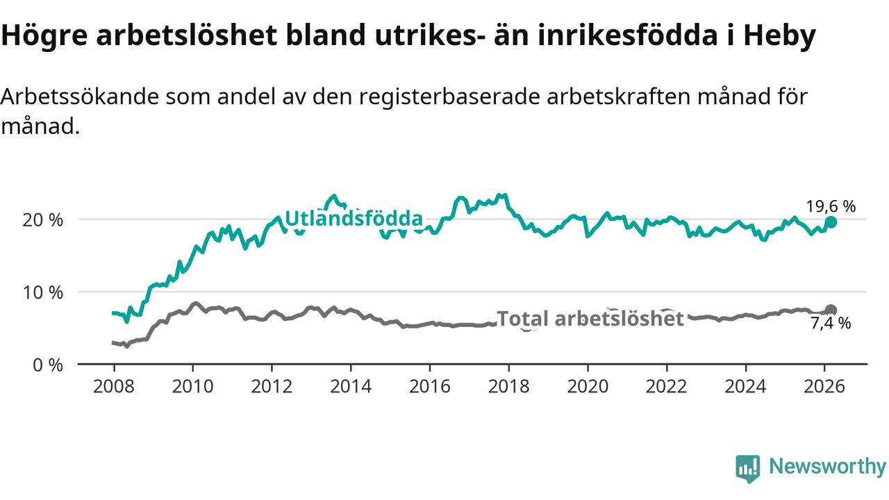 Arbetslösheten bland utlandsfödda var 19,6 procent i Heby under mars månad, motsvarande 206 av 1 051 personer. Det är 0,1 procentenheter färre än vid samma tidpunkt i fjol (−5 om man räknar personer). Den senaste månadens nedgång innebär ett trendbrott. Under de ett föregående månaderna hade arbetslösheten bland utlandsfödda varit högre än motsvarande tidpunkt året innan.