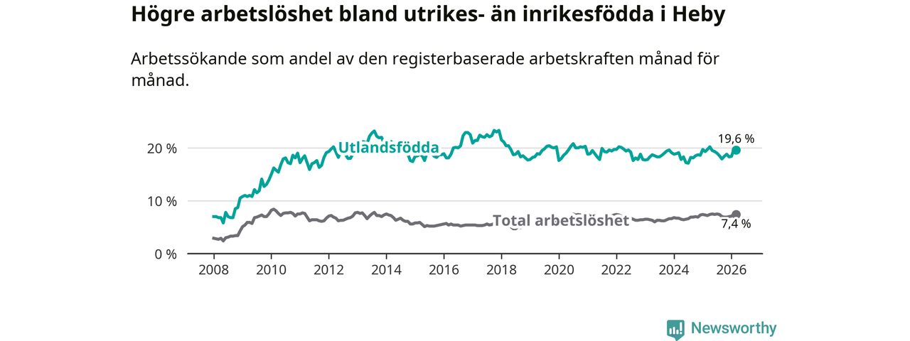 Skillnaden i arbetslöshet mellan utrikesfödda och hela befolkningen är 12,2 procentenheter i Heby.