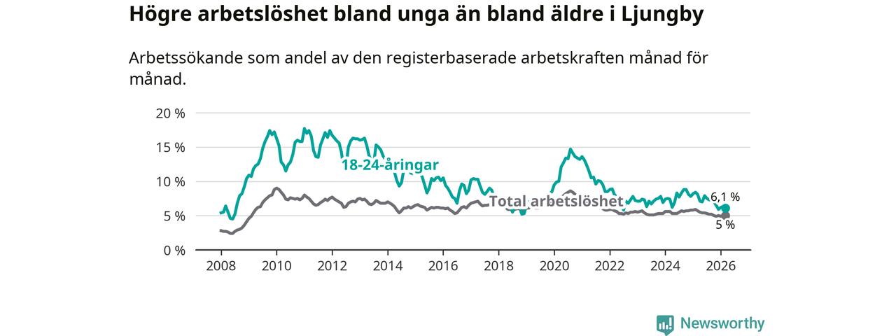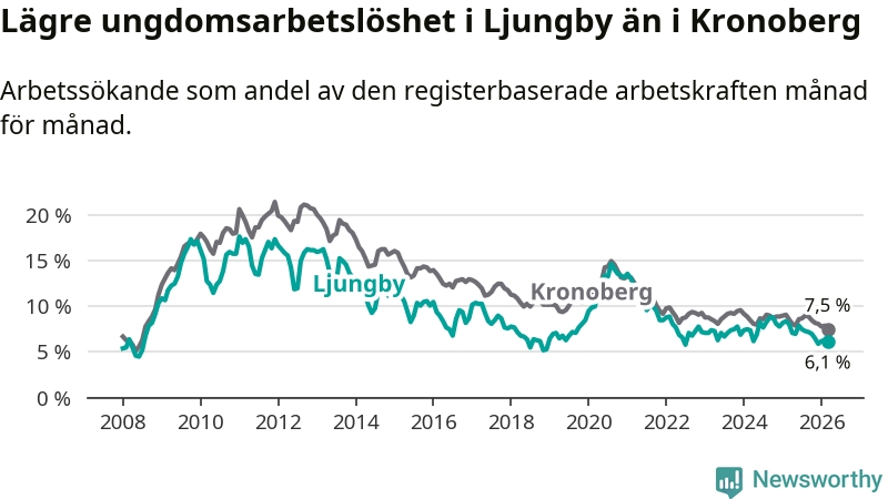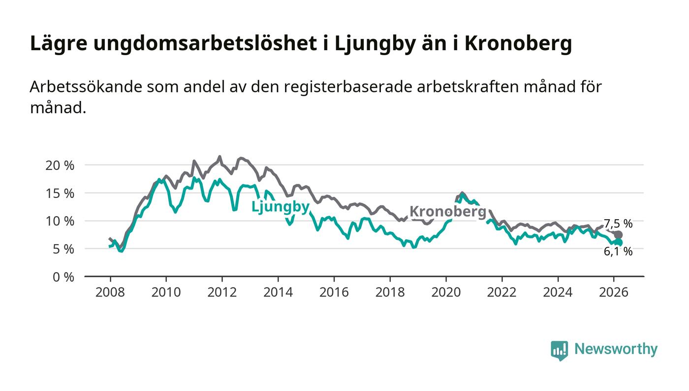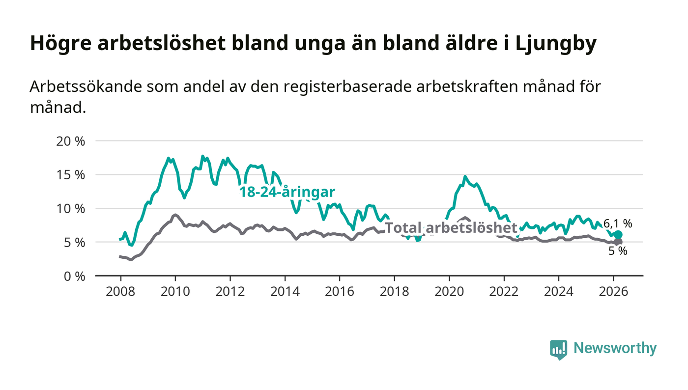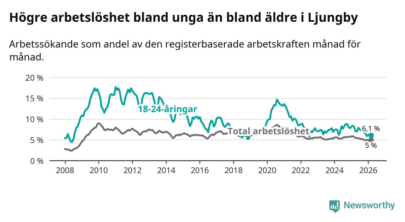 I och med den senaste månadens nedgång har de ungas arbetslöshet i Ljungby sjunkit tio månader i följd (ner från 7,0 procent i maj 2025 till 6,1 procent nu).