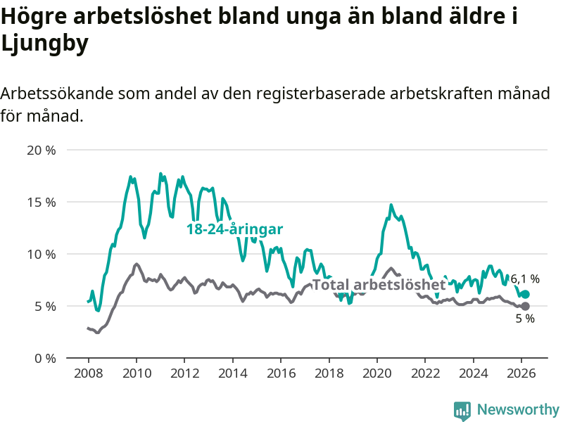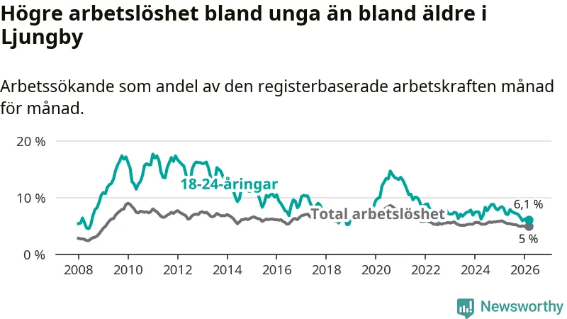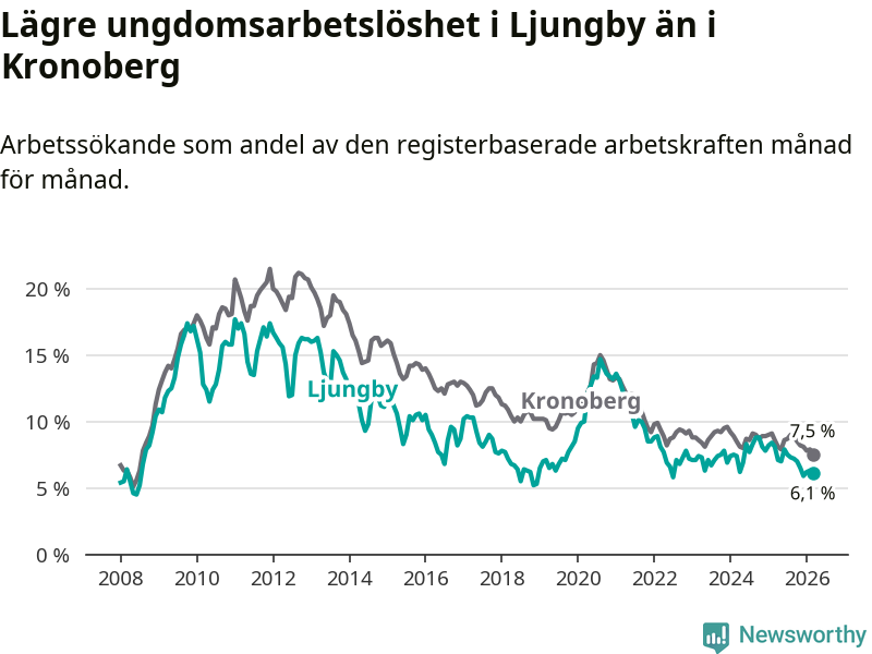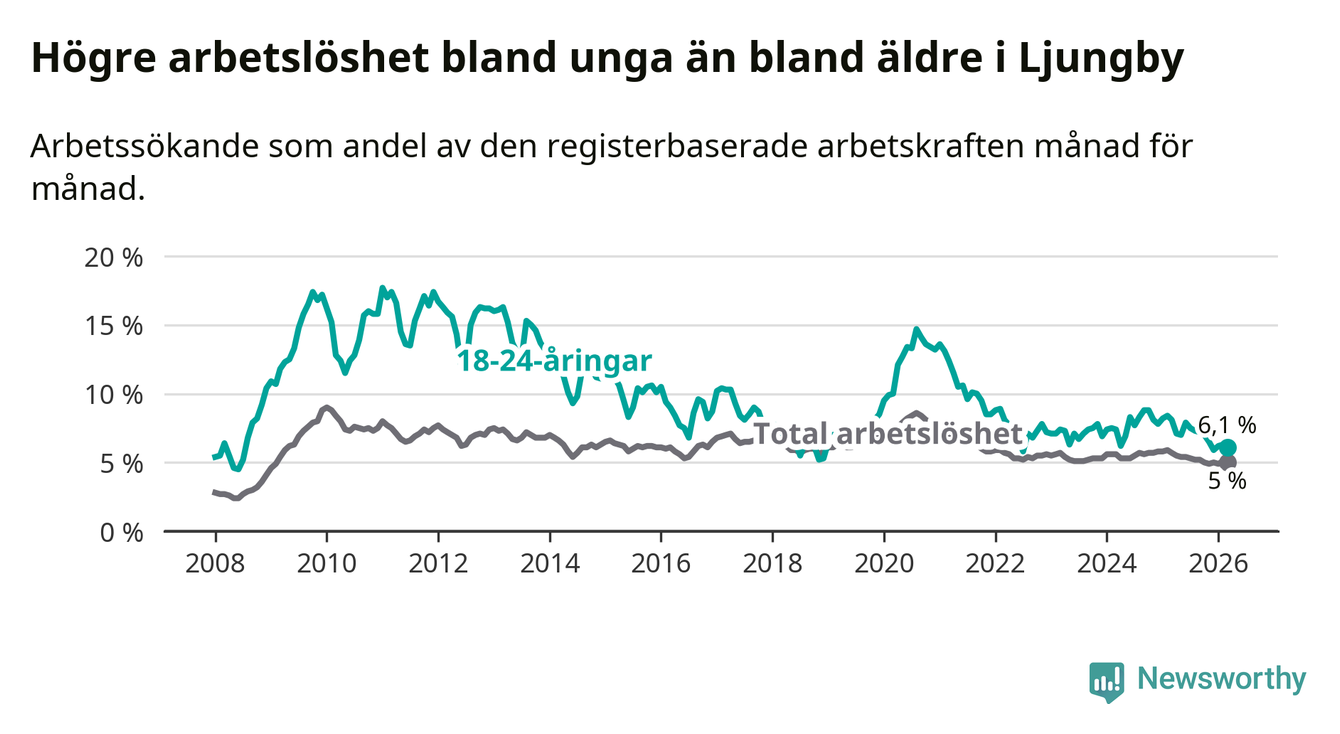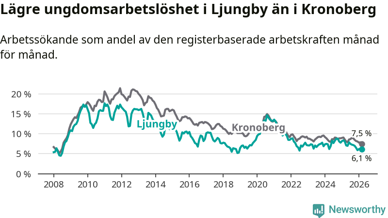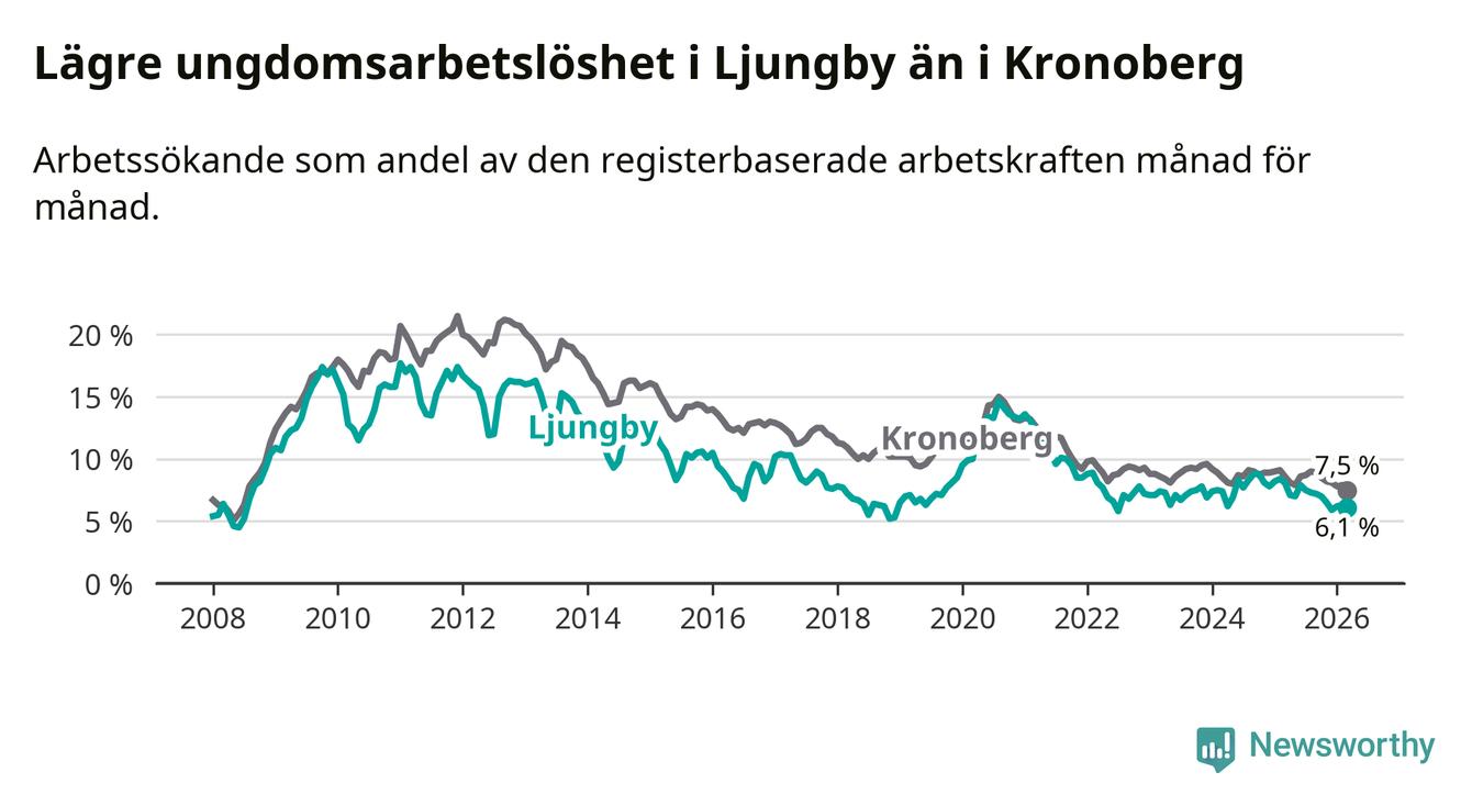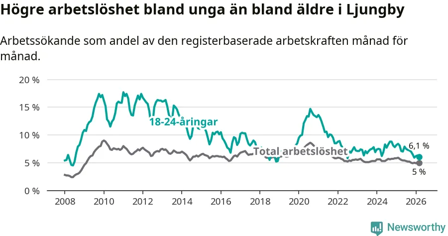 I och med den senaste månadens nedgång har de ungas arbetslöshet i Ljungby sjunkit tio månader i följd (ner från 7,0 procent i maj 2025 till 6,1 procent nu).