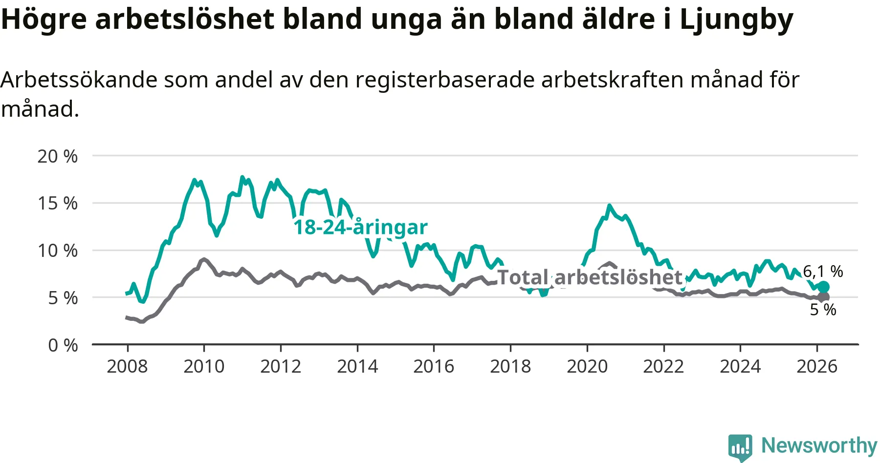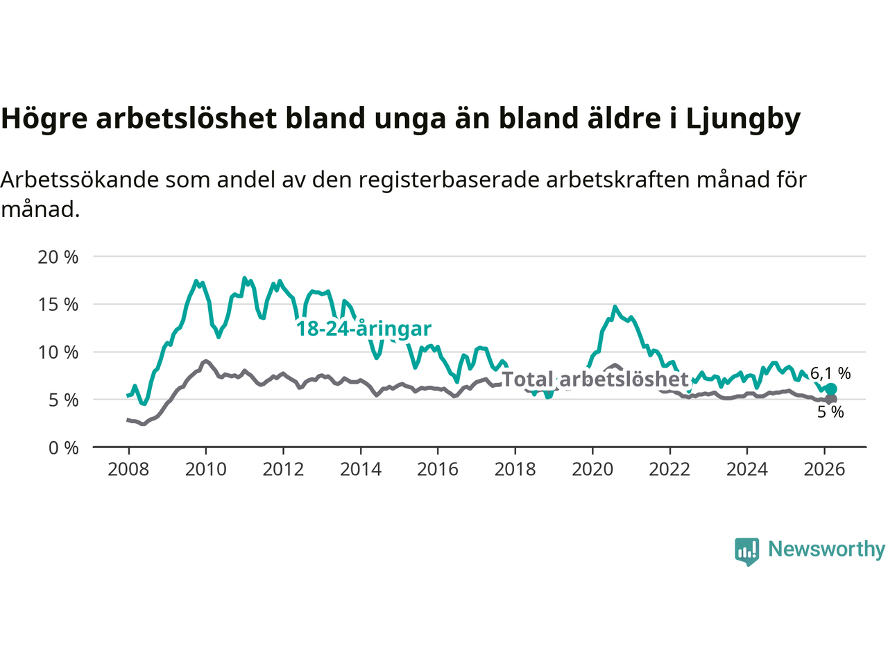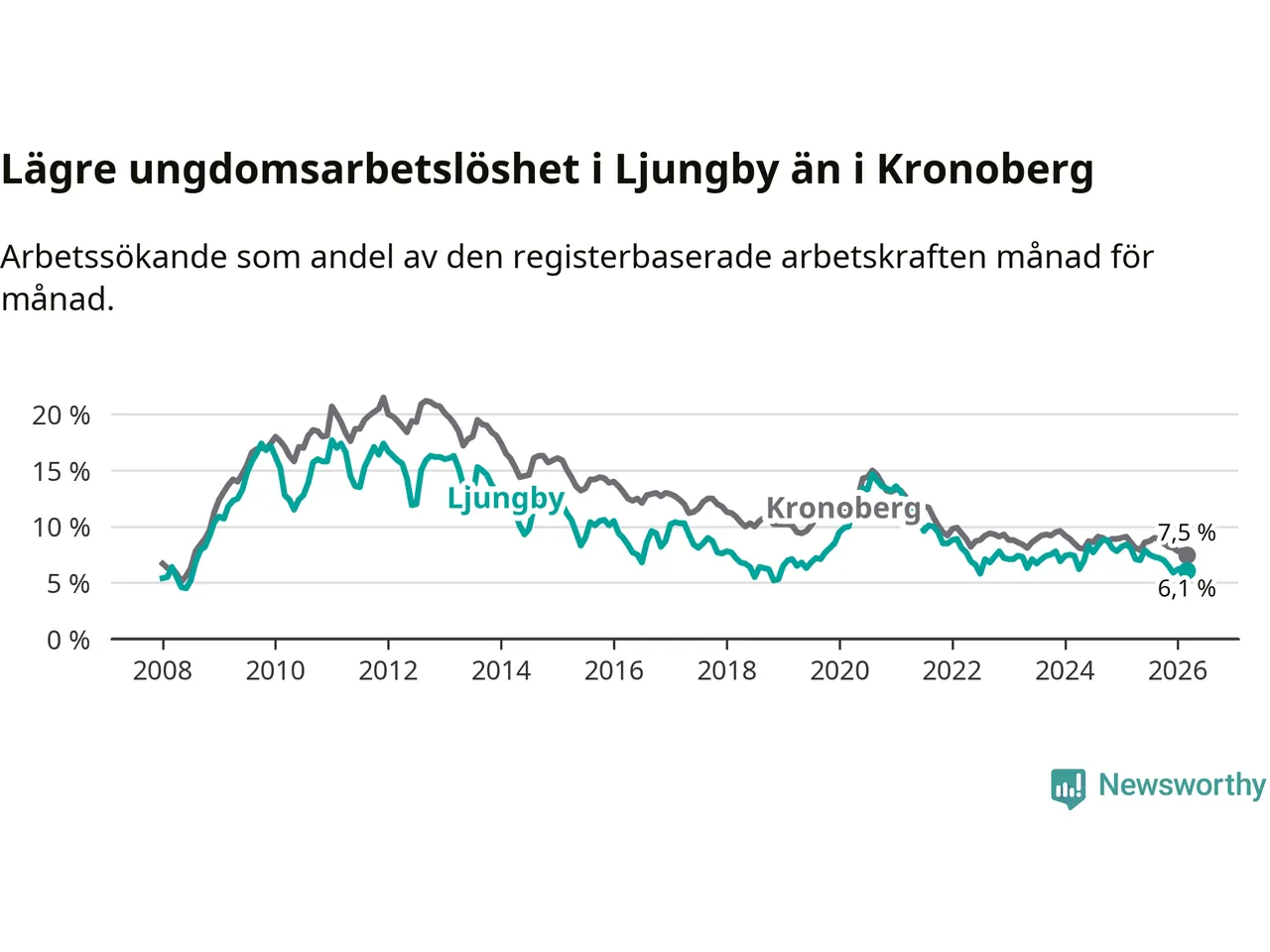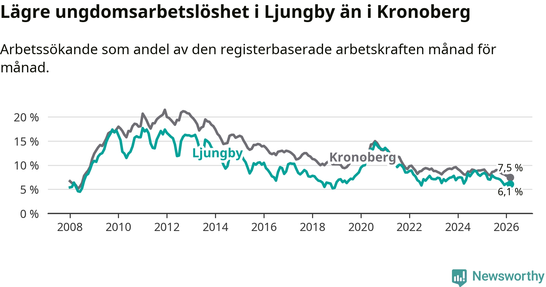 I och med den senaste månadens nedgång har de ungas arbetslöshet i Ljungby sjunkit tio månader i följd (ner från 7,0 procent i maj 2025 till 6,1 procent nu).