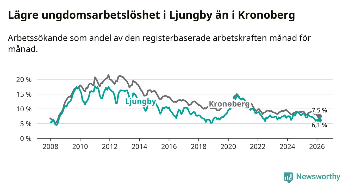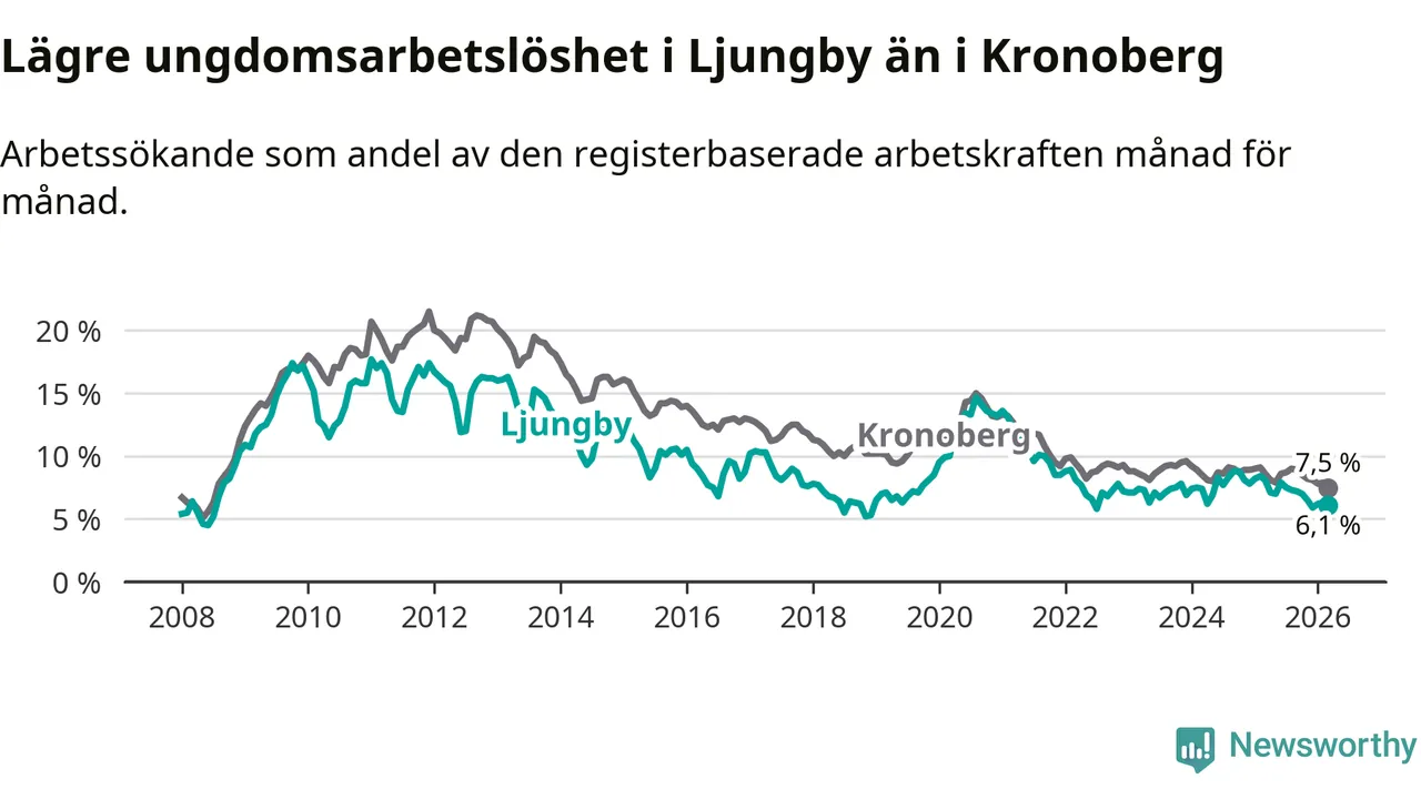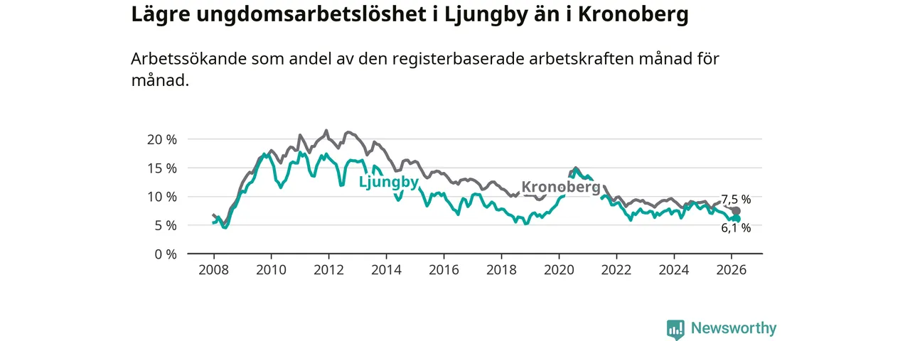 Graf: Arbetslöshet bland unga i Ljungby kommun och Kronobergs län