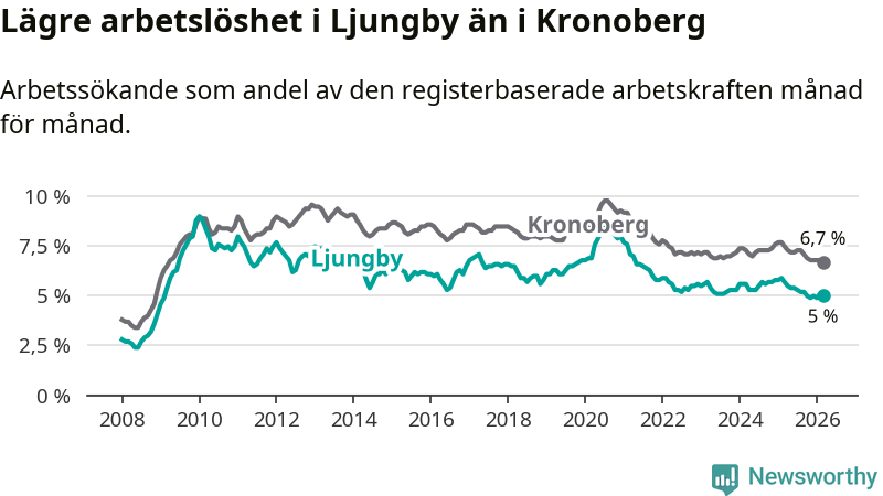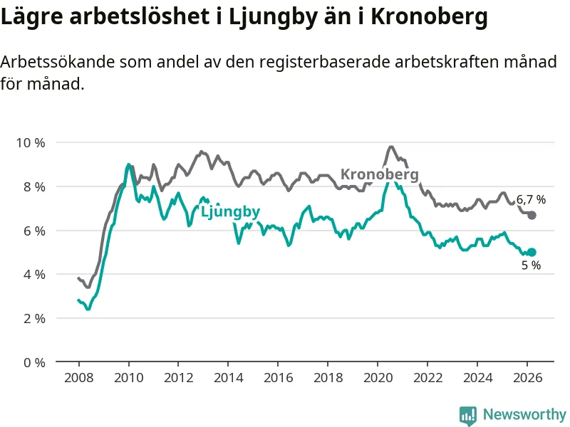 Ljungby hade redan tidigare lägre arbetslöshet än snittet i hela Kronobergs län och nu växer klyftan (5,0 procent i kommunen, jämfört med 6,7 procent i hela länet). Ljungby har därmed även den lägsta arbetslöshetsnivån i länet. Lessebo har den högsta (9,1 procent).