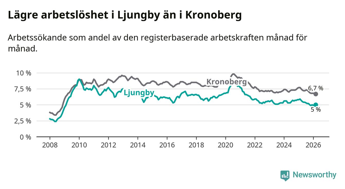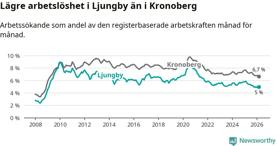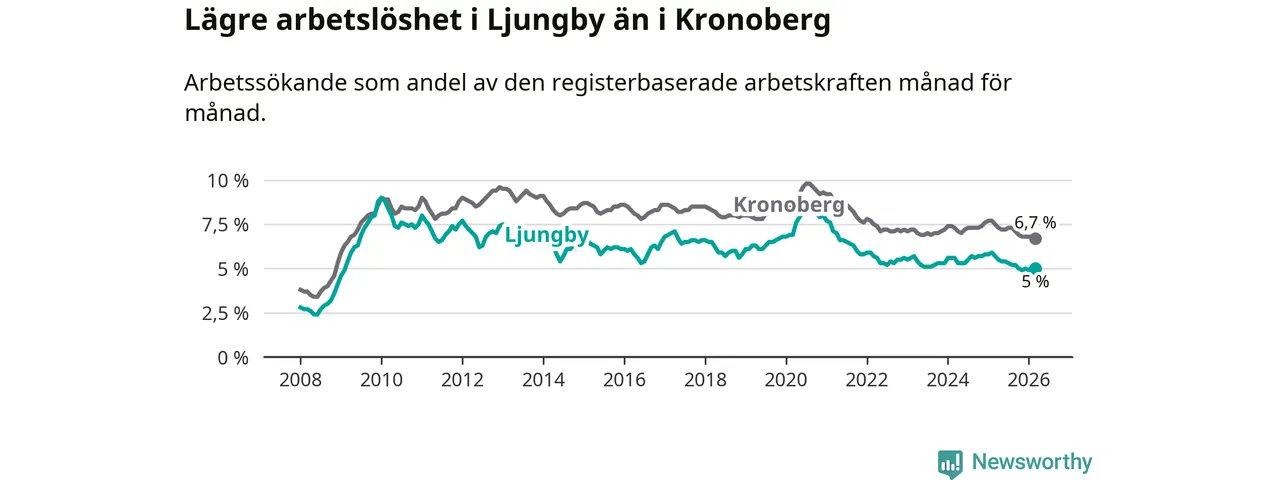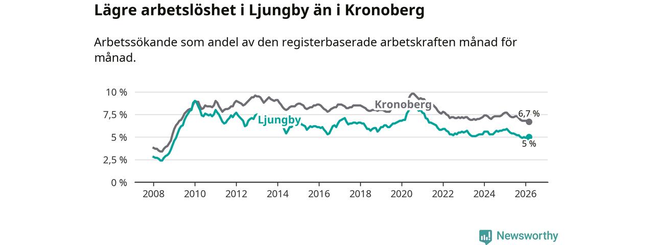 Under mars månad rapporterade Ljungby kommun en total arbetslöshet på 5,0 procent. Det är en minskning jämfört med samma tidpunkt i fjol (−0,7 procentenheter). Även i Kronobergs län sjunker arbetslösheten .