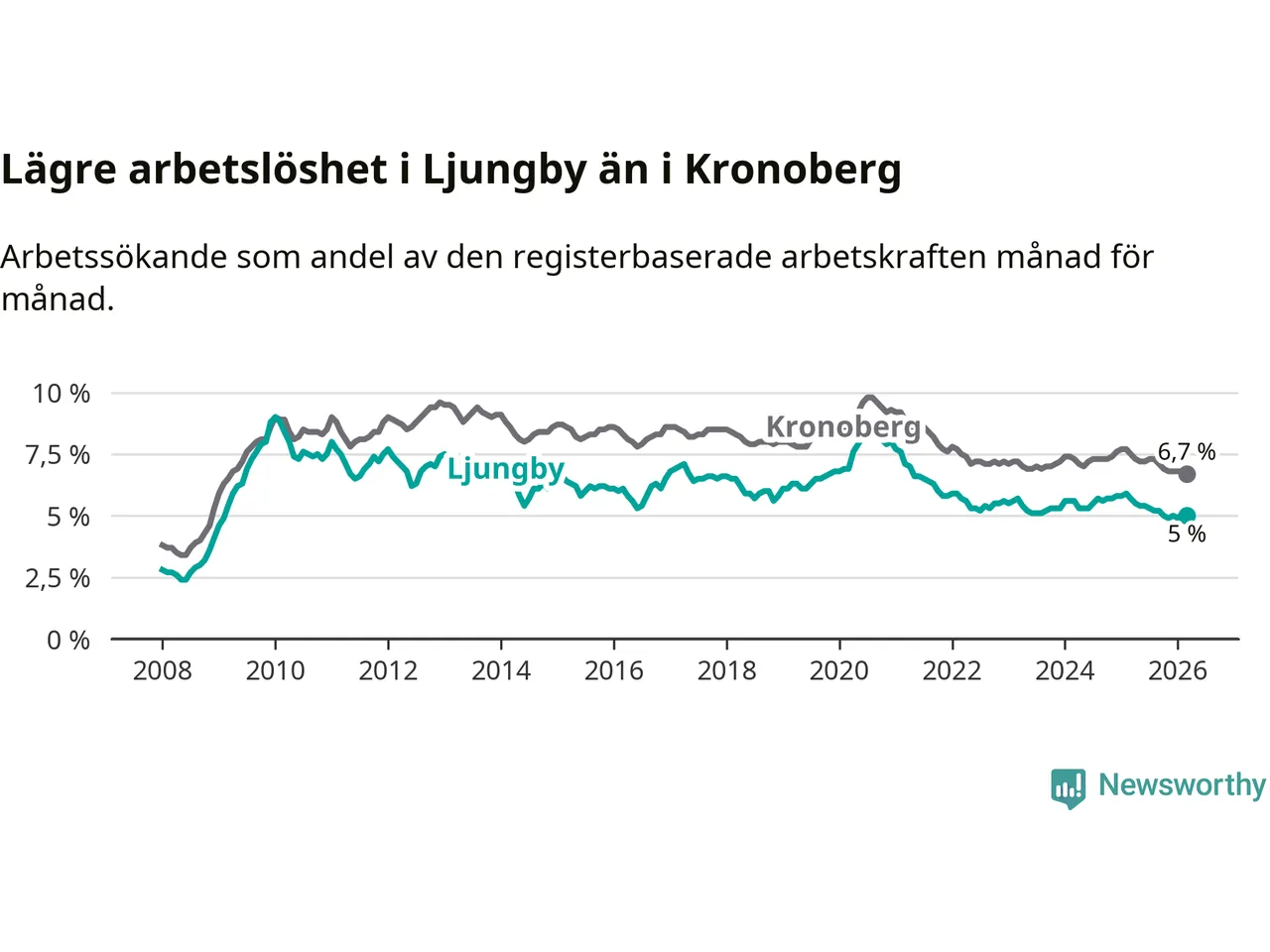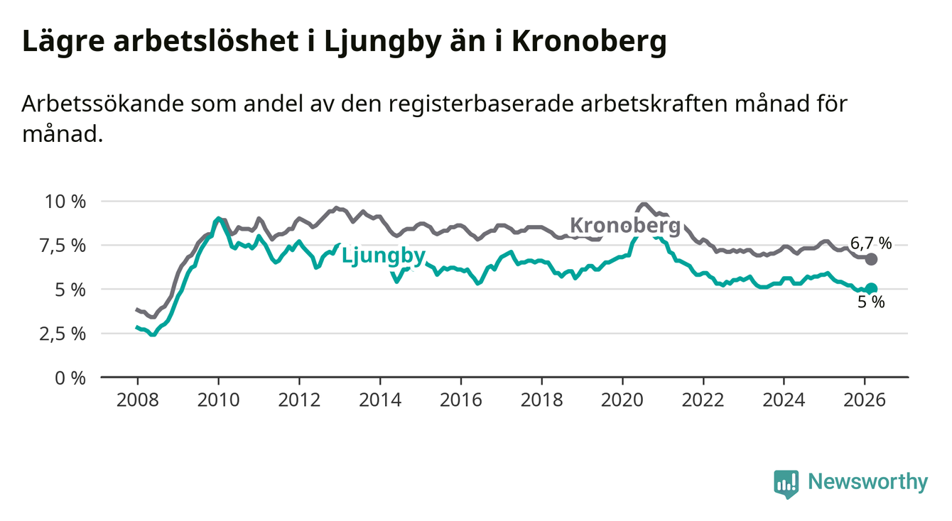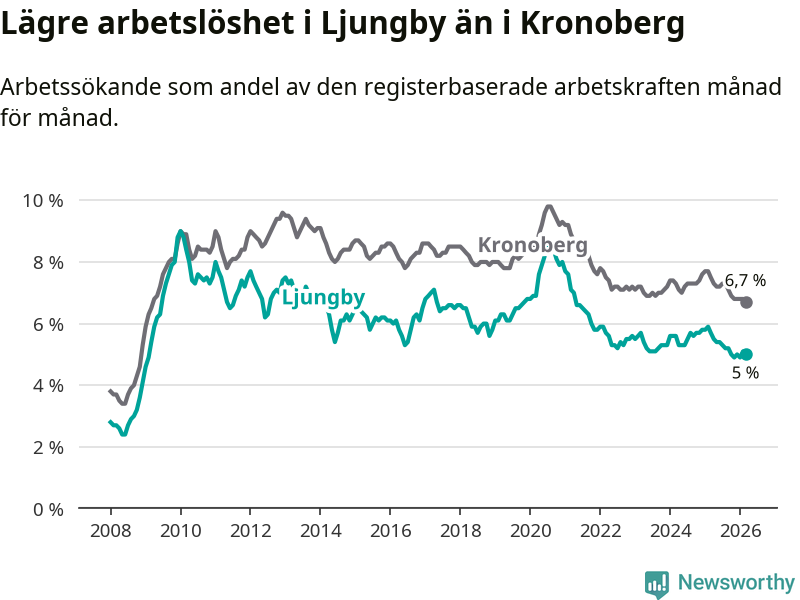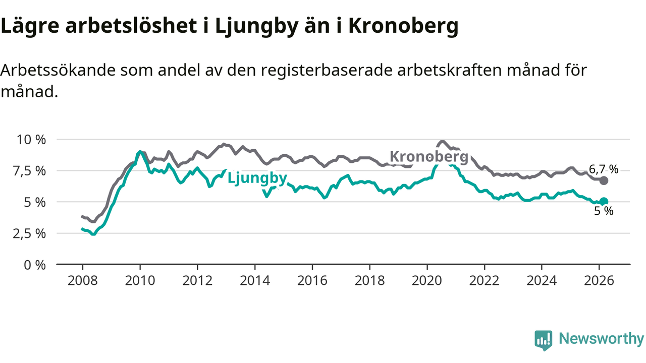 Under mars månad rapporterade Ljungby kommun en total arbetslöshet på 5,0 procent. Det är en minskning jämfört med samma tidpunkt i fjol (−0,7 procentenheter). Även i Kronobergs län sjunker arbetslösheten .