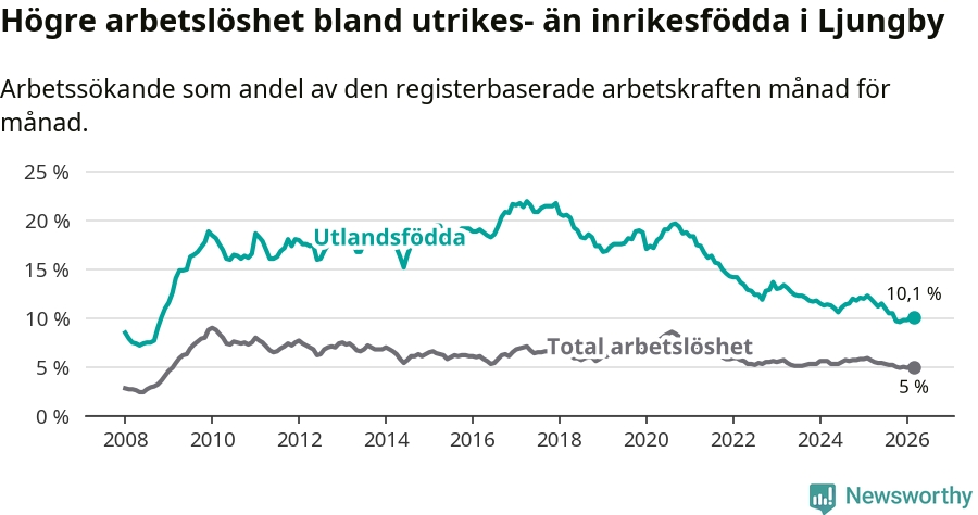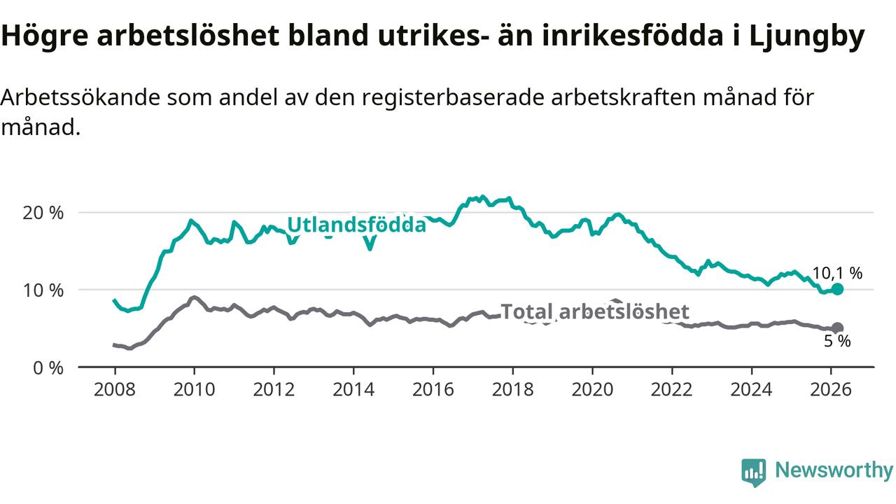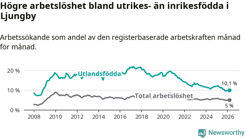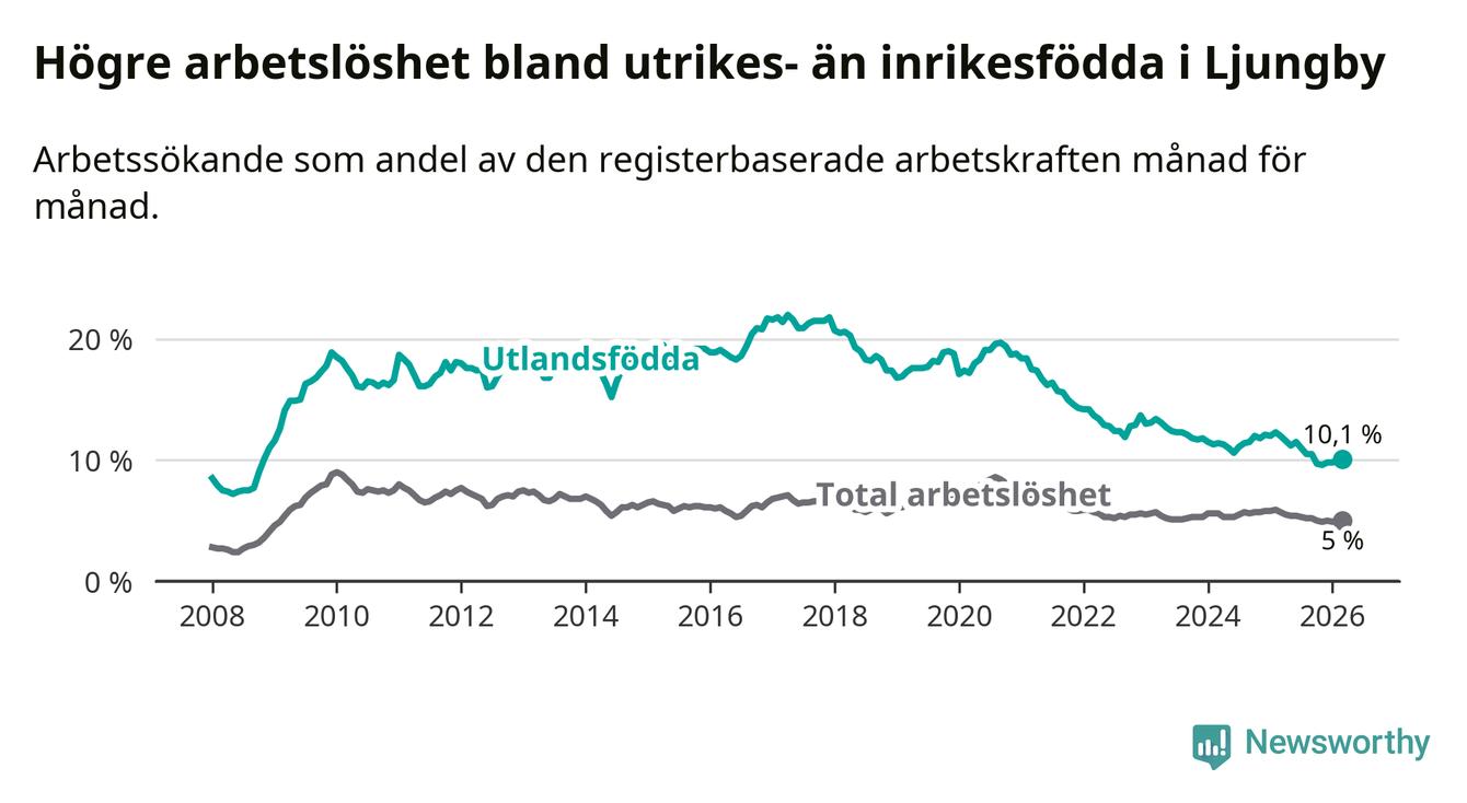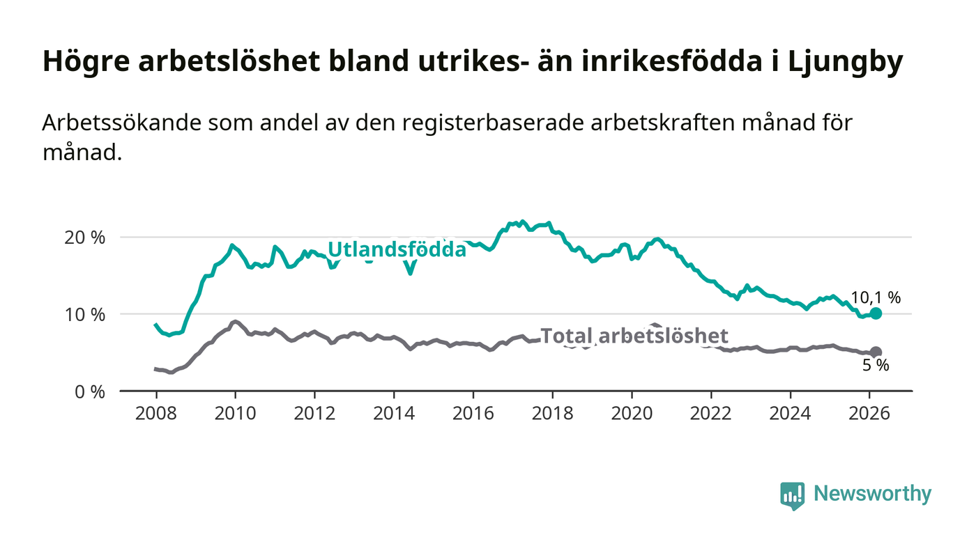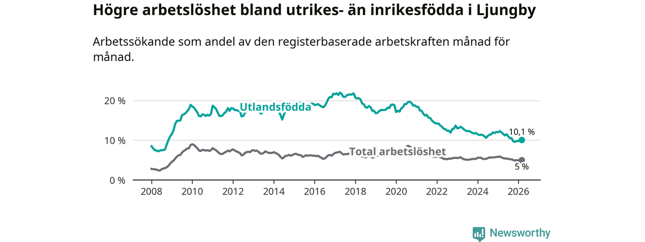 Arbetslösheten bland utlandsfödda var 10,1 procent i Ljungby under mars månad, motsvarande 344 av 3 406 personer. Det är 1,9 procentenheter färre än vid samma tidpunkt i fjol (−62 om man räknar personer). Därmed är de utlandsföddas arbetslöshet lägre än vid samma tidpunkt i fjol för nionde månaden i följd. Sedan juni 2025 har arbetslösheten bland utlandsfödda minskat från 11,5 till 10,1 procent.
