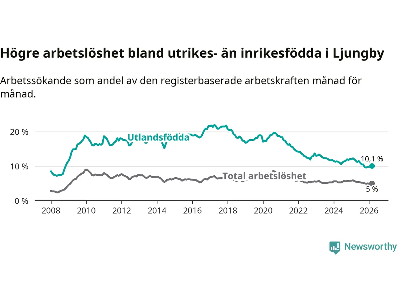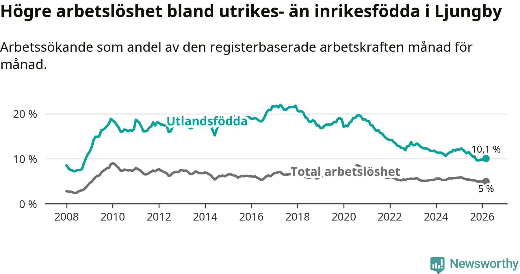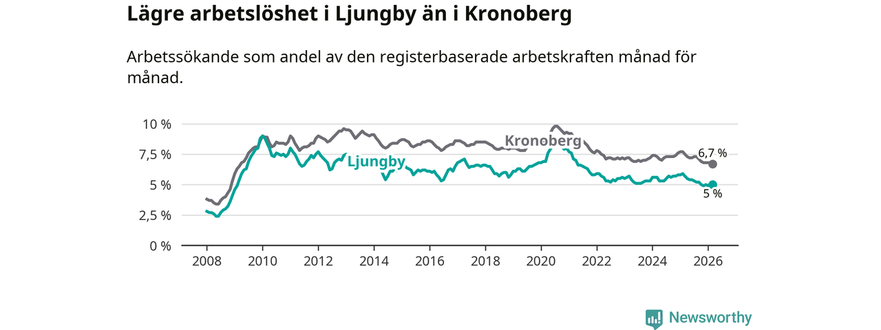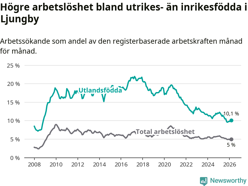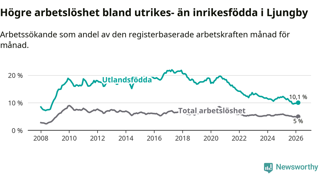 Arbetslösheten bland utlandsfödda var 10,1 procent i Ljungby under mars månad, motsvarande 344 av 3 406 personer. Det är 1,9 procentenheter färre än vid samma tidpunkt i fjol (−62 om man räknar personer). Därmed är de utlandsföddas arbetslöshet lägre än vid samma tidpunkt i fjol för nionde månaden i följd. Sedan juni 2025 har arbetslösheten bland utlandsfödda minskat från 11,5 till 10,1 procent.