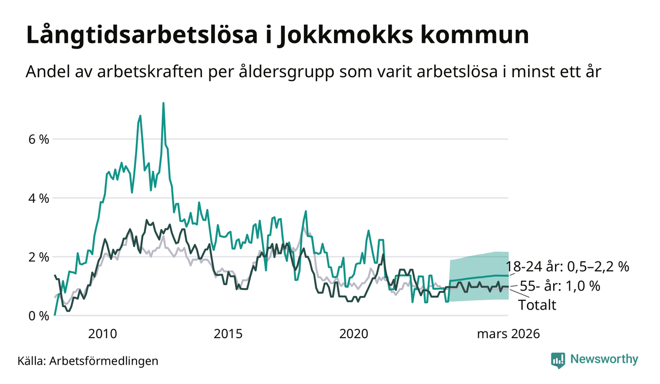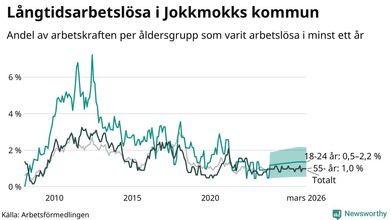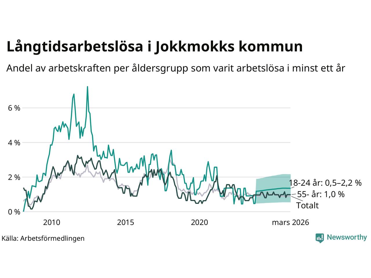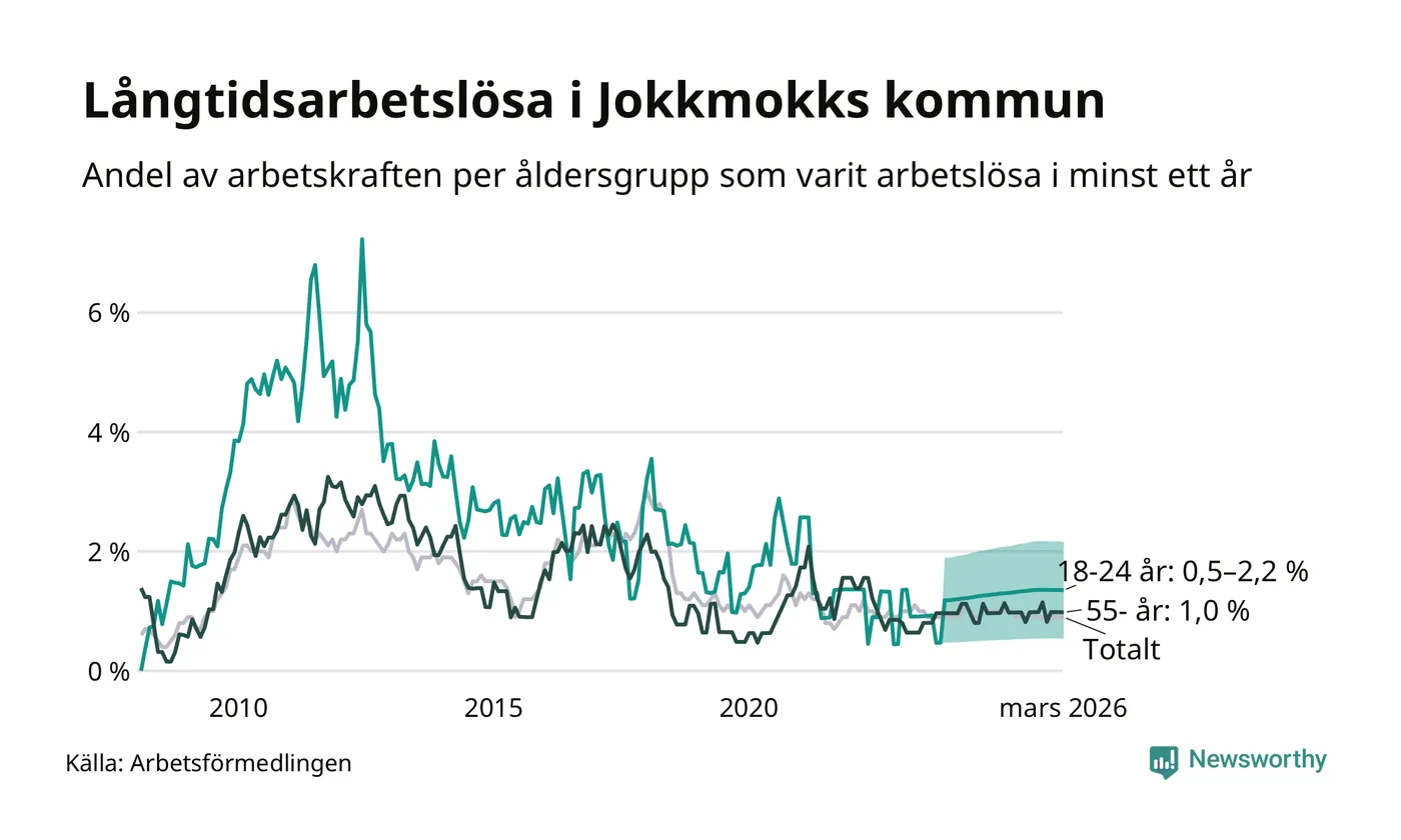 Av de 21 personerna som varit arbetslösa i mer än ett år i Jokkmokks kommun är sex personer mellan 55 och 661 år och mellan en och fyra är mellan 18 och 24 år. För den äldre gruppen är andelen arbetslösa 1,0 procent medan den i den yngre gruppen är mellan 0,5 och 2,2 procent. Även i riket som helhet är långtidsarbetslösheten högre i gruppen äldre.
