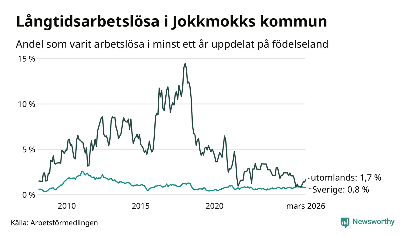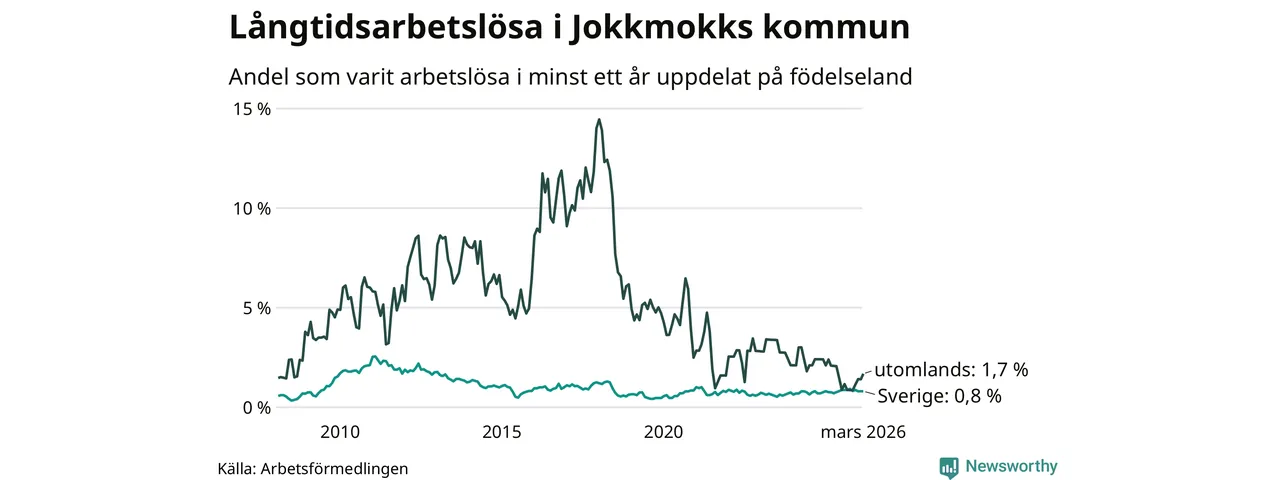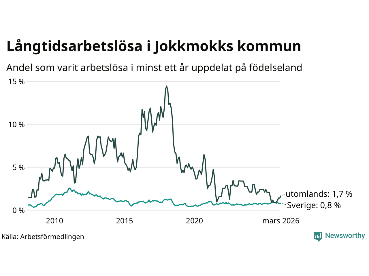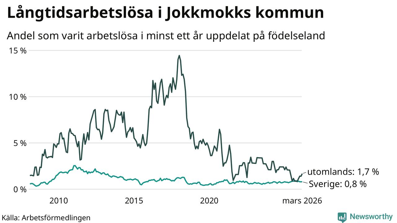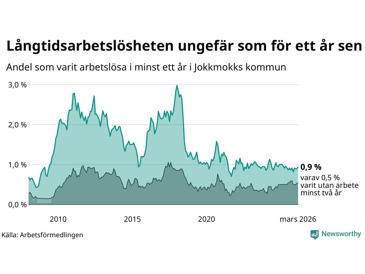 I mars hade 21 Jokkmokksbor varit arbetslösa i minst ett år, vilket är en fler än månaden innan. 21 personer motsvarar 0,9 procent av arbetskraften i kommunen – andelen långtidsarbetslösa är ungefär på samma nivå som för ett år sedan. Jokkmokk tillhör de kommuner som har lägst andel långtidsarbetslösa i hela landet just nu.