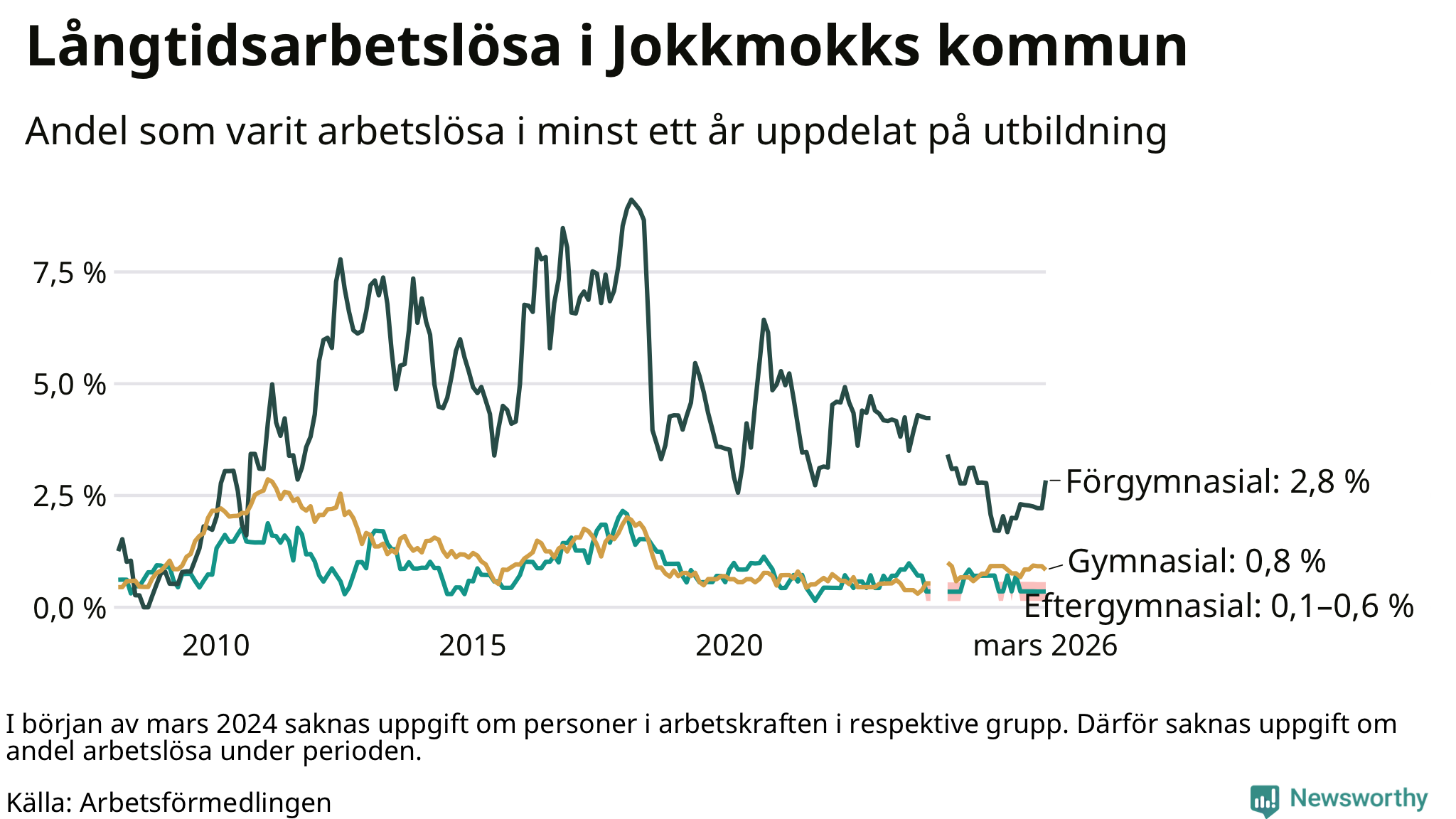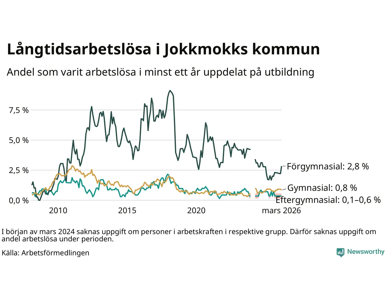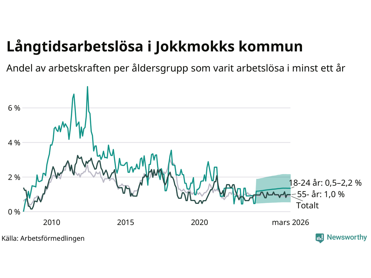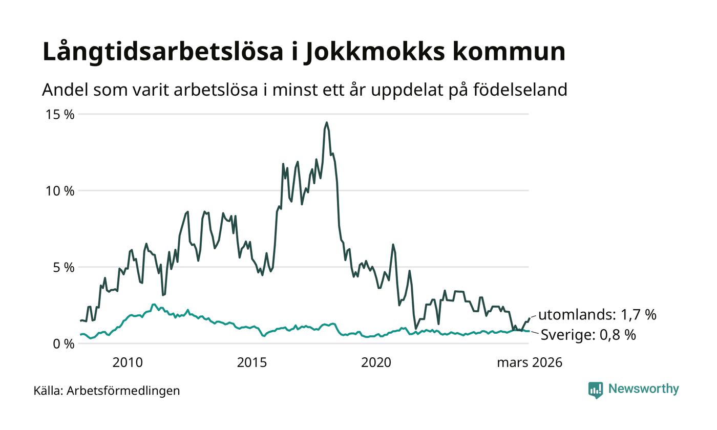 I mars hade 21 Jokkmokksbor varit arbetslösa i minst ett år, vilket är en fler än månaden innan. 21 personer motsvarar 0,9 procent av arbetskraften i kommunen – andelen långtidsarbetslösa är ungefär på samma nivå som för ett år sedan. Jokkmokk tillhör de kommuner som har lägst andel långtidsarbetslösa i hela landet just nu.