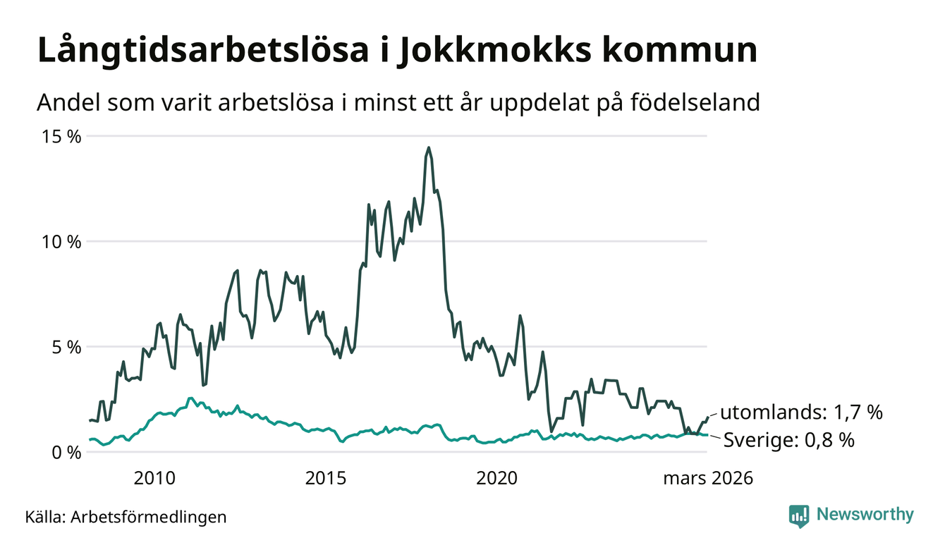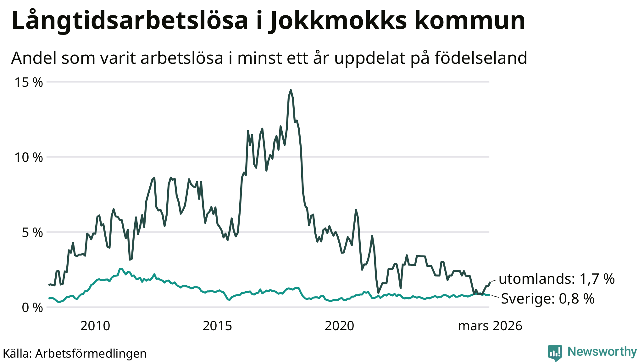 15 av de långtidsarbetslösa i Jokkmokk är födda i Sverige, medan sex är födda utomlands. Det innebär att långtidsarbetslösheten bland Sverigefödda är 0,8 procent, medan den är dubbelt så hög – 1,7 procent – bland födda utomlands. Även i riket som helhet är arbetslösheten högre bland utrikesfödda.