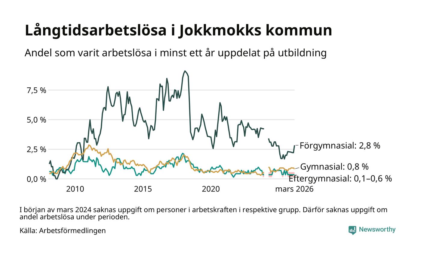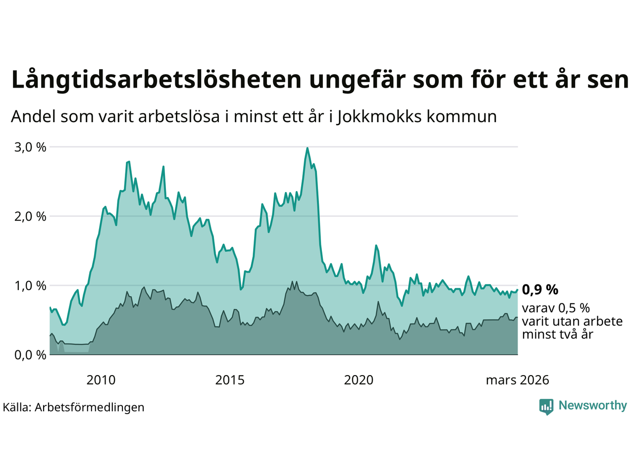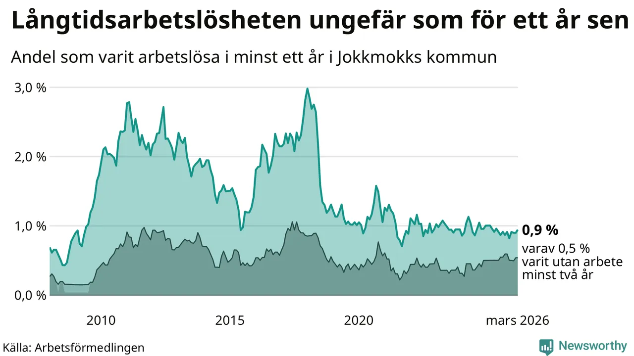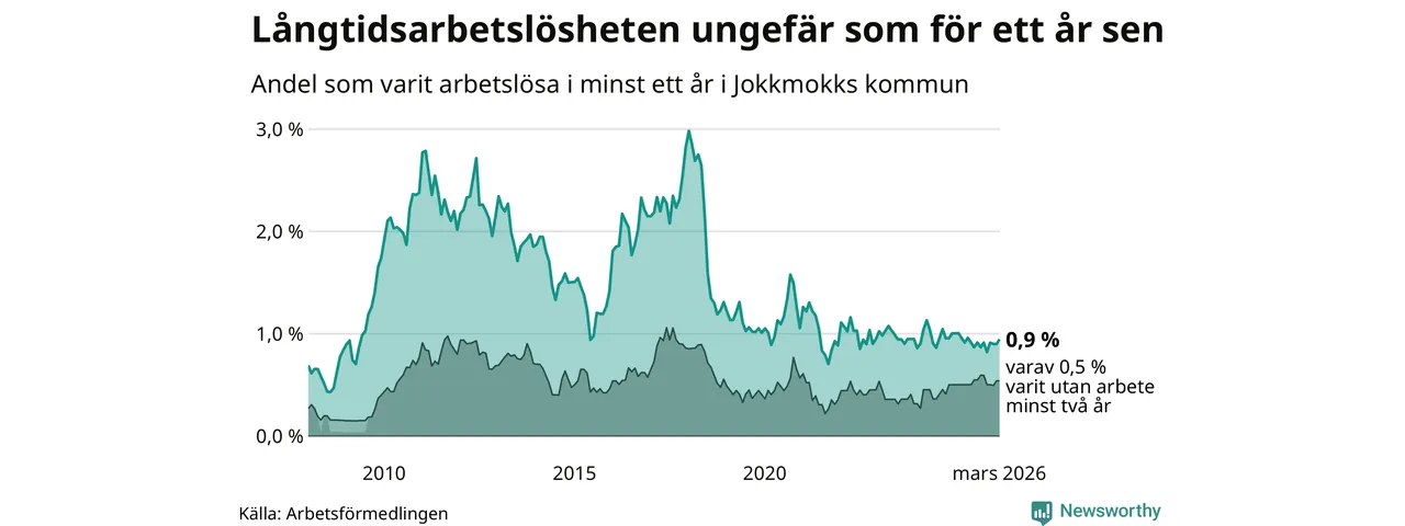 Andelen som varit utan arbete i minst ett år i Jokkmokk var ungefär lika stor i mars jämfört med samma månad för ett år sedan. Det visar Arbetsfömedlingens senaste månadsstatistik.