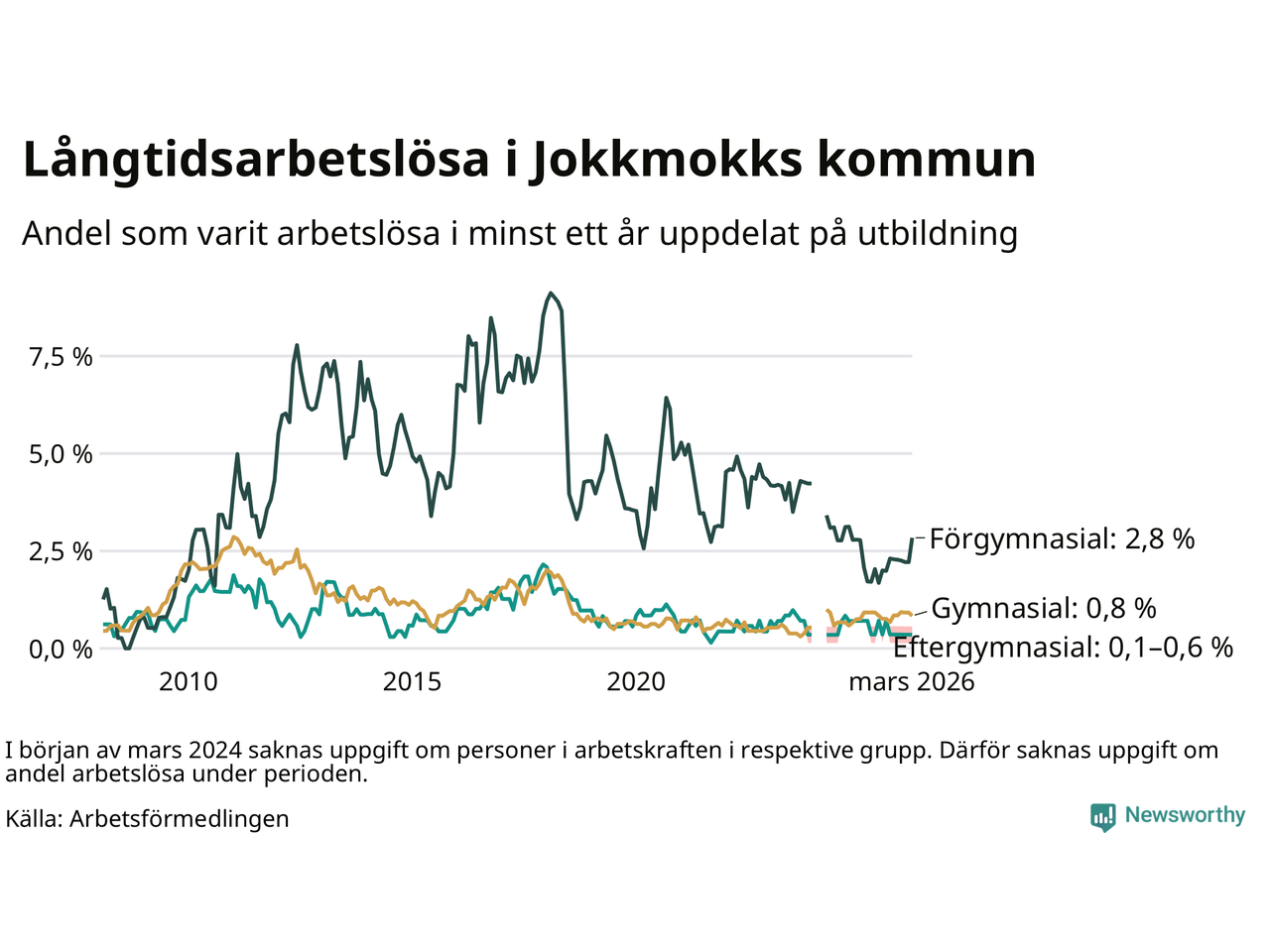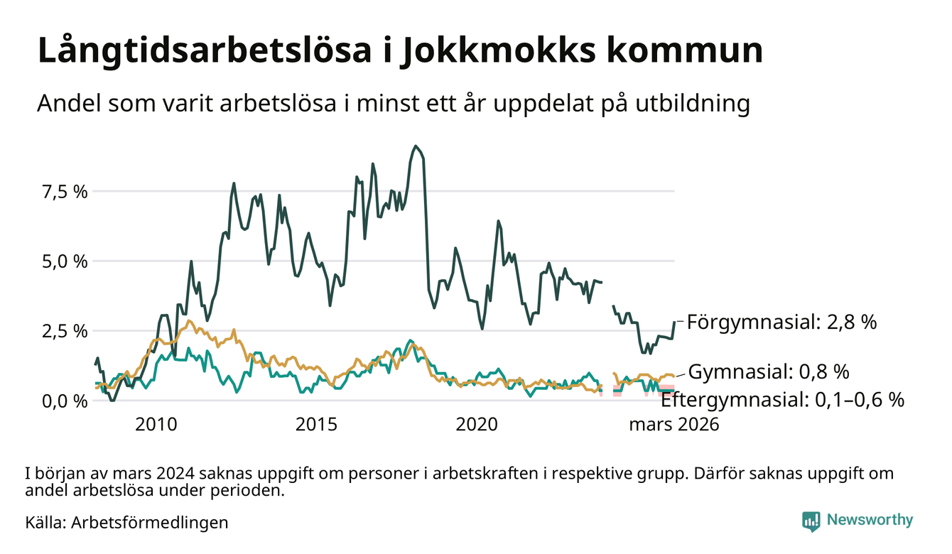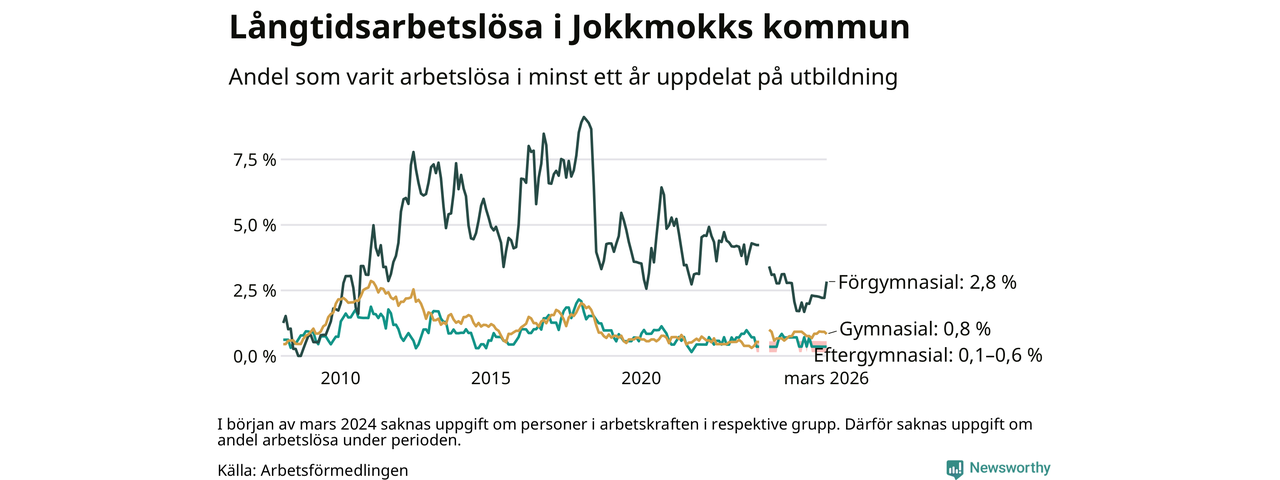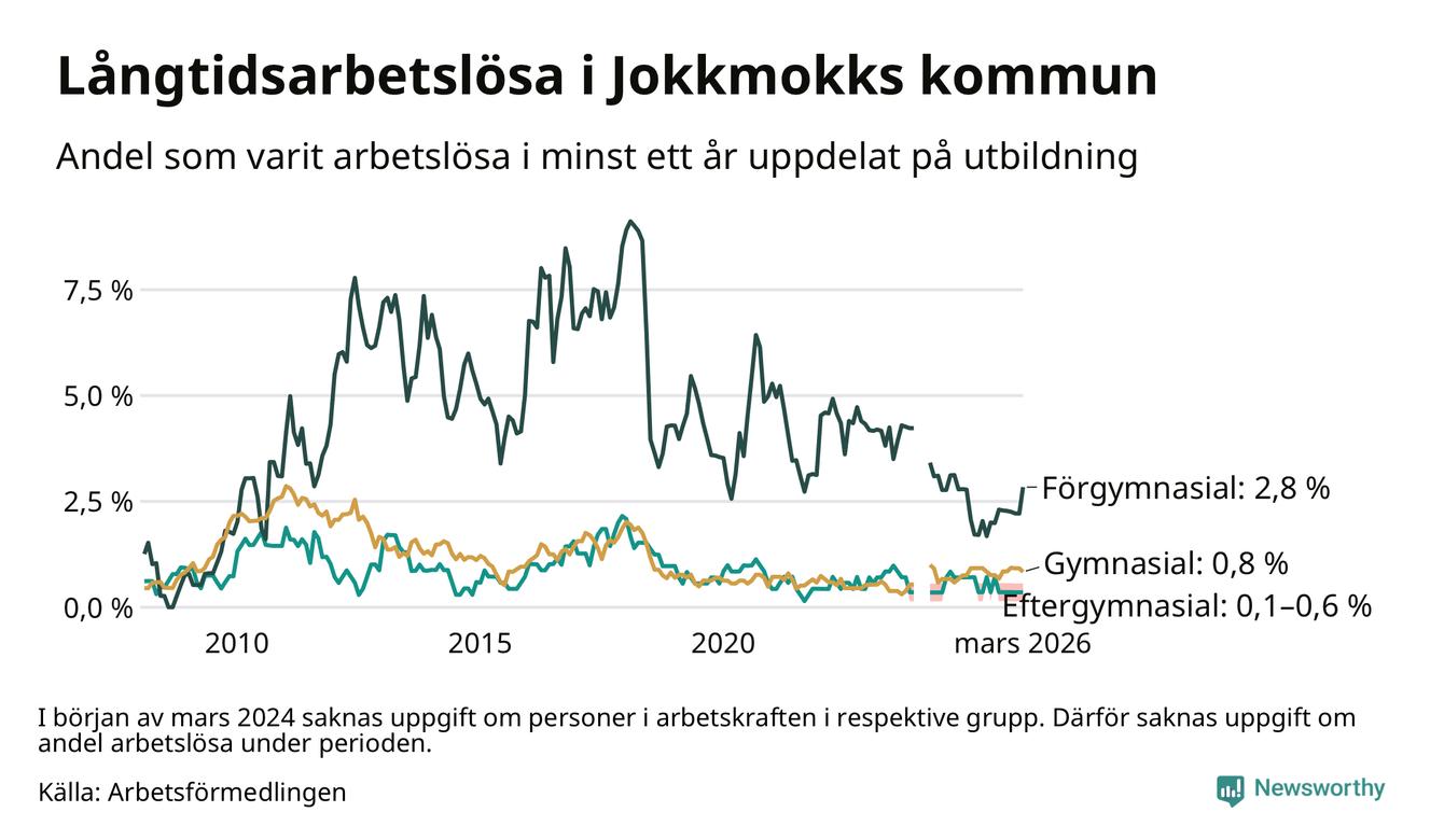Andelen som varit utan arbete i minst ett år i Jokkmokk var ungefär lika stor i mars jämfört med samma månad för ett år sedan. Det visar Arbetsfömedlingens senaste månadsstatistik.