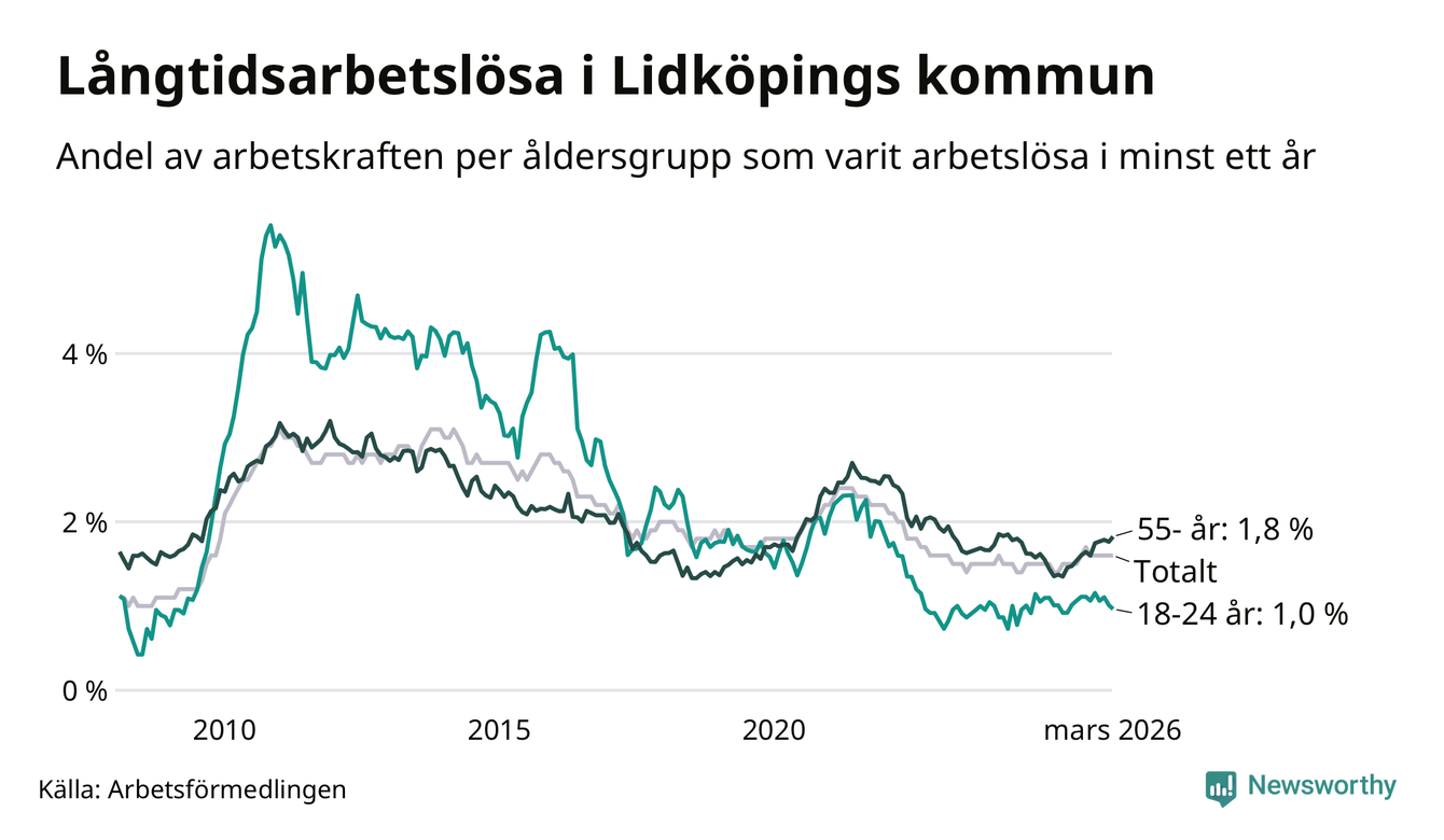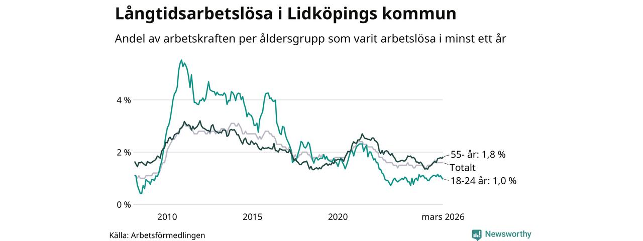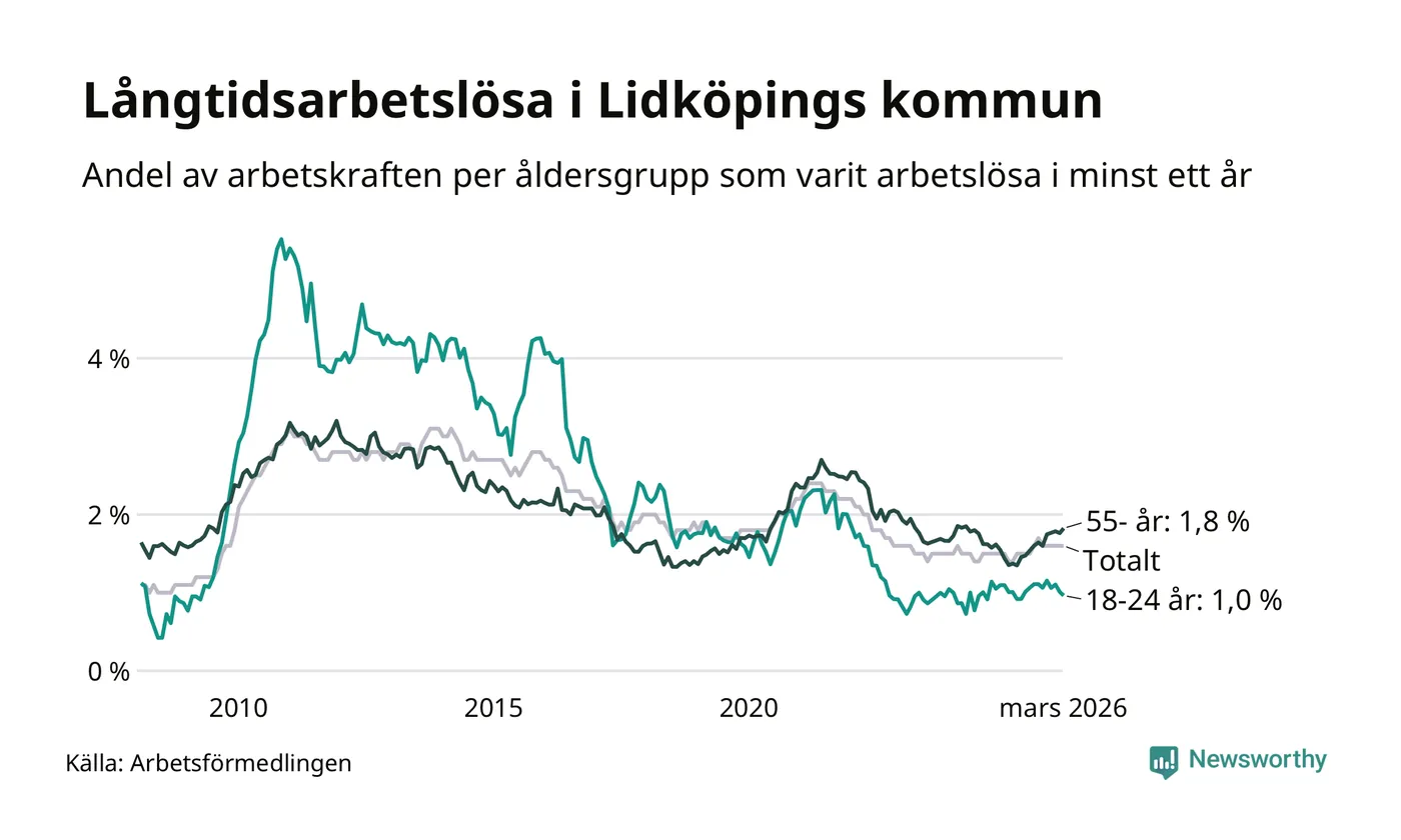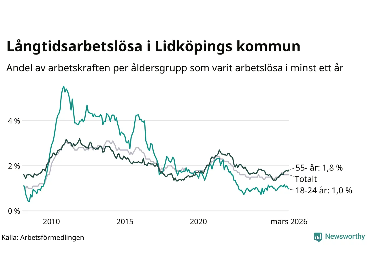 Av de 322 personerna som varit arbetslösa i mer än ett år i Lidköpings kommun är 86 personer mellan 55 och 661 år och 21 är mellan 18 och 24 år. För den äldre gruppen är andelen arbetslösa 1,8 procent medan den i den yngre gruppen är 1,0 procent. Även i riket som helhet är långtidsarbetslösheten högre i gruppen äldre.