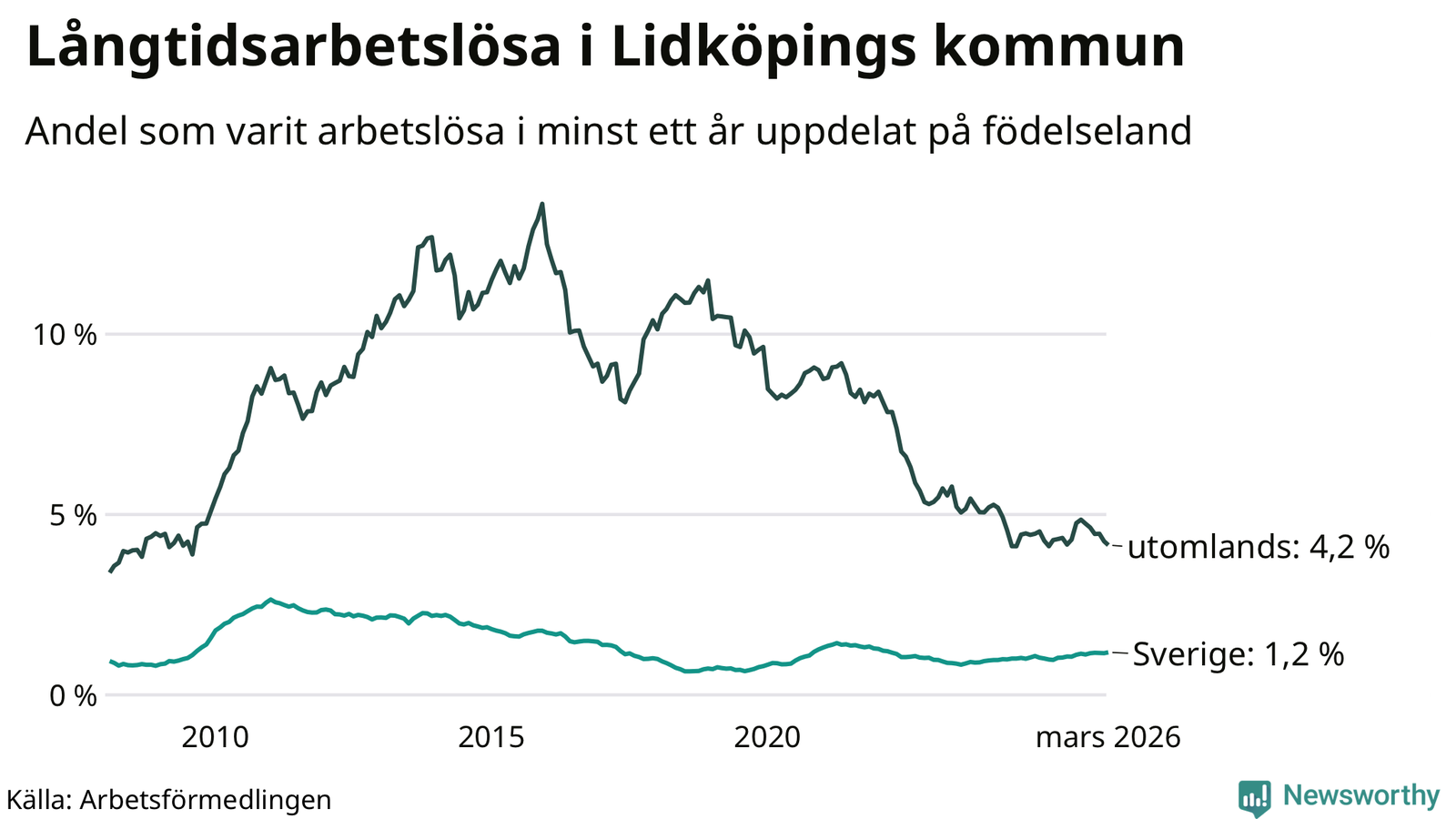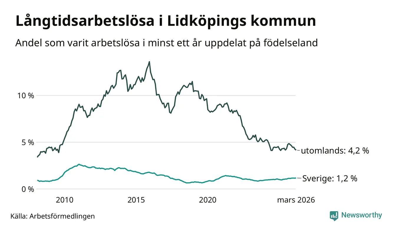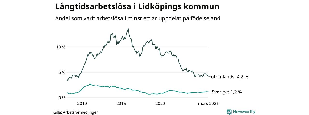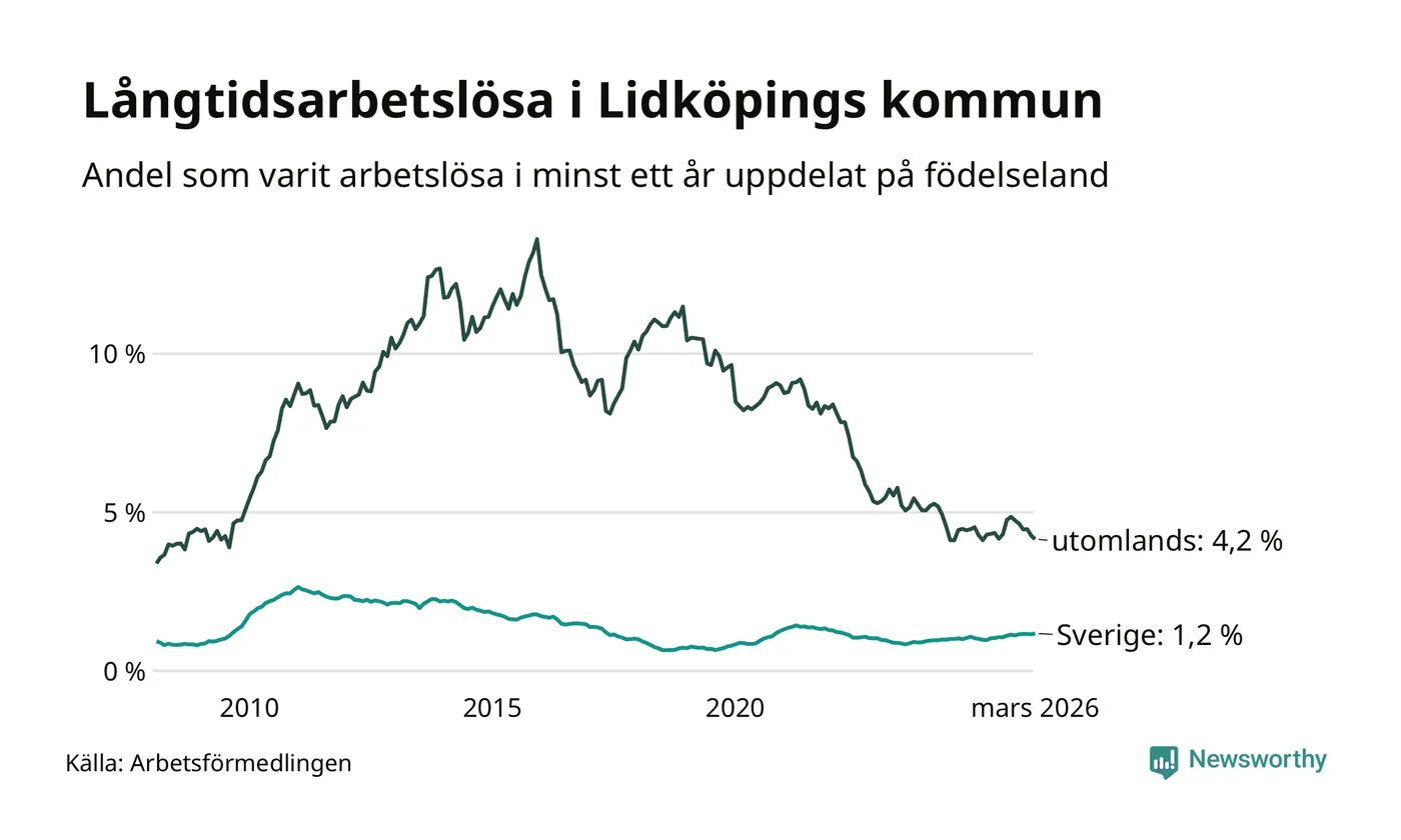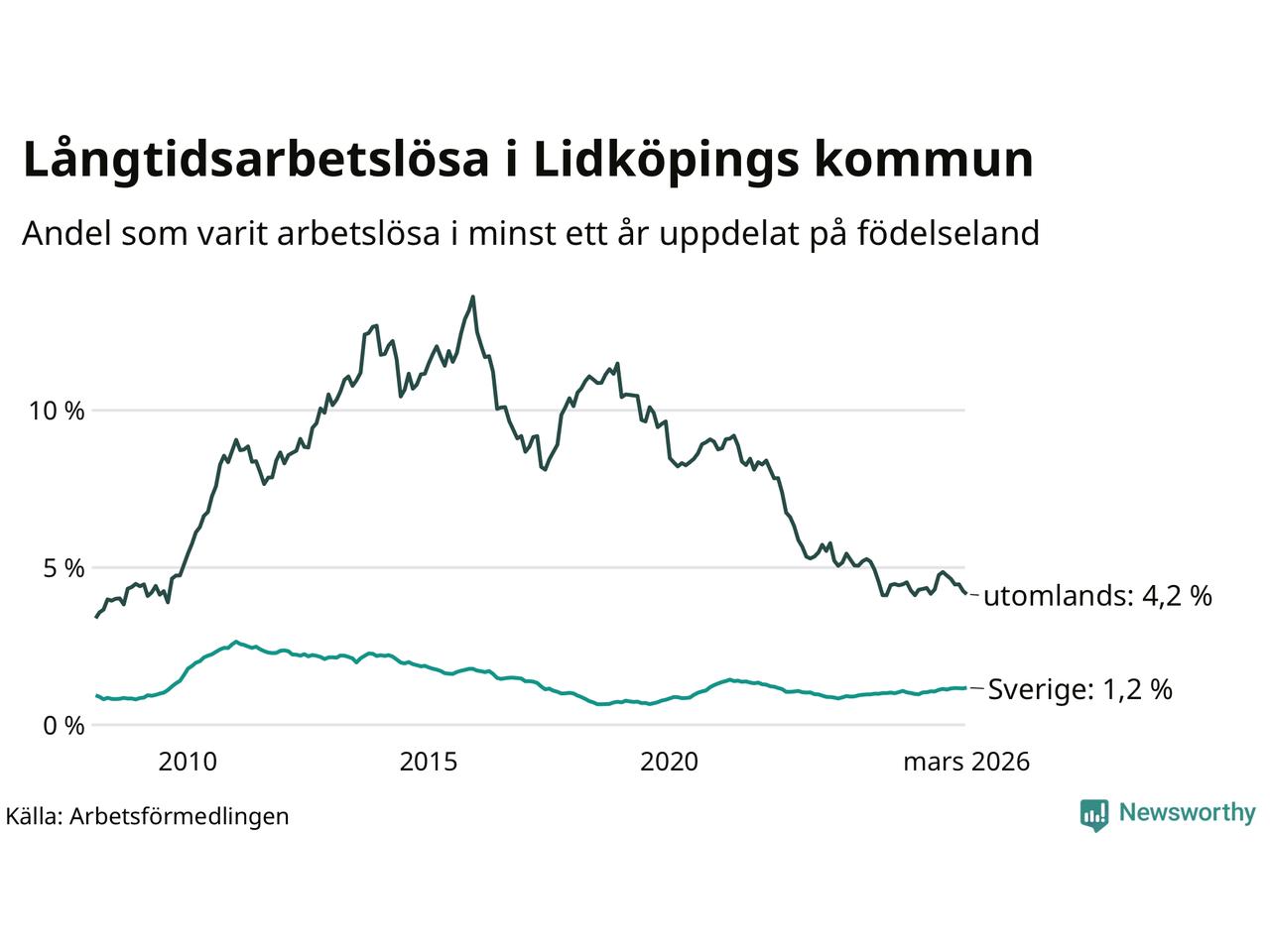 204 av de långtidsarbetslösa i Lidköping är födda i Sverige, medan 118 är födda utomlands. Det innebär att långtidsarbetslösheten bland Sverigefödda är 1,2 procent, medan den är fyra gånger så hög – 4,2 procent – bland födda utomlands. Även i riket som helhet är arbetslösheten högre bland utrikesfödda.