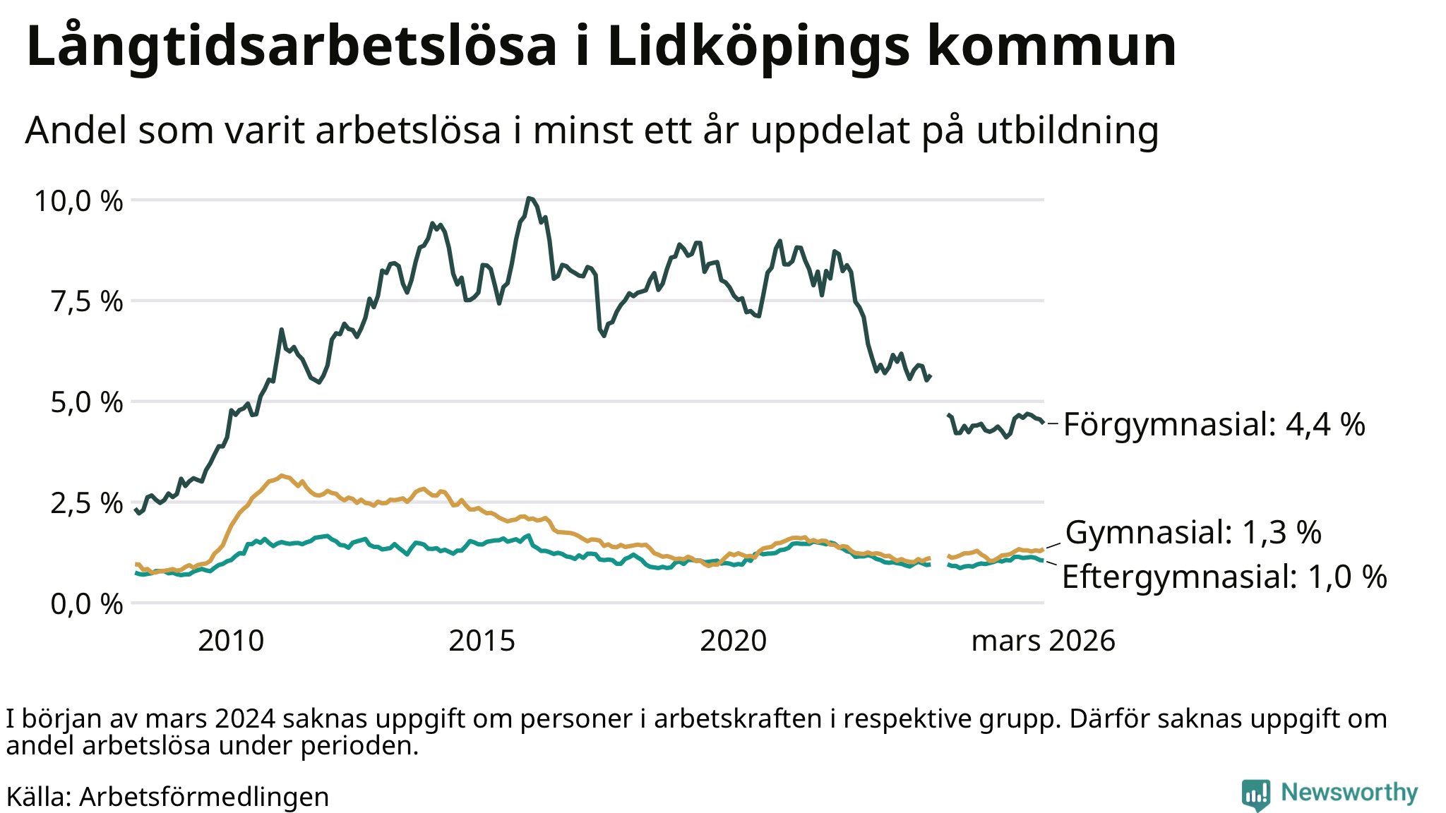 | Bland dem utan gymnasieutbildning | 4,4 % | 6,5 % | 7,8 % |
