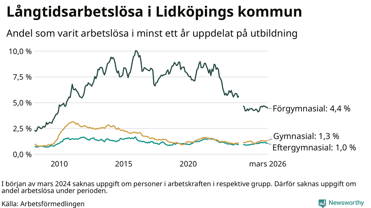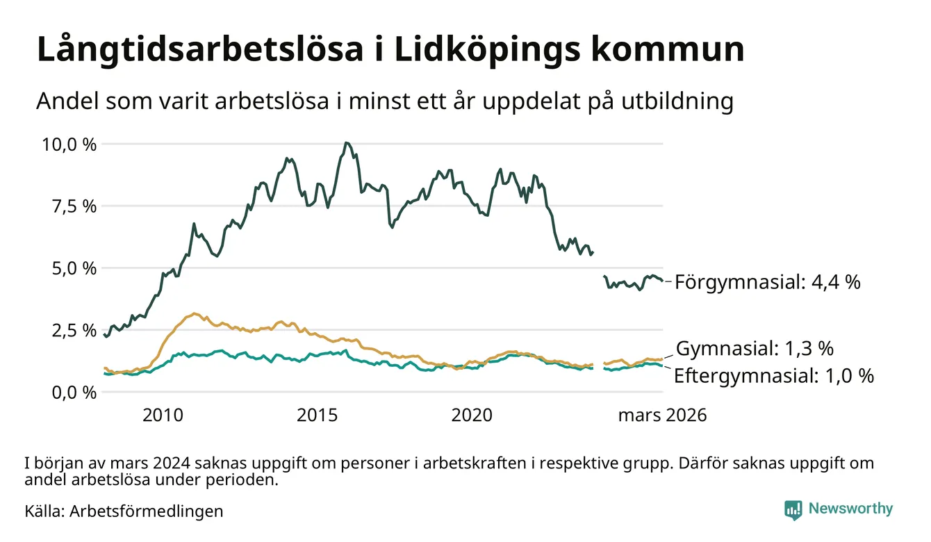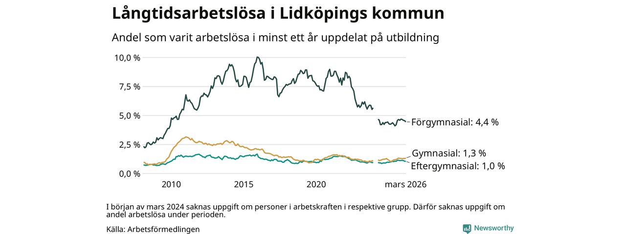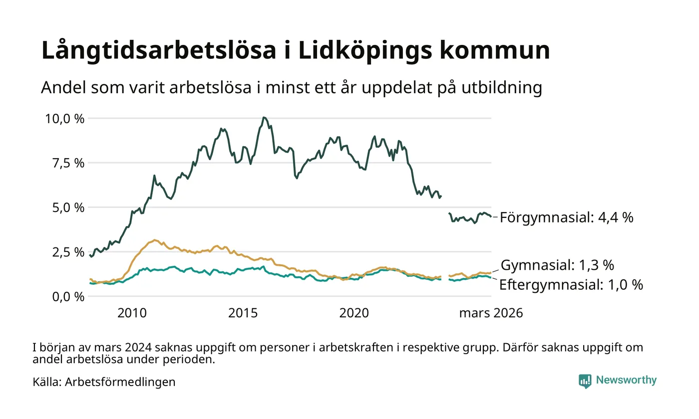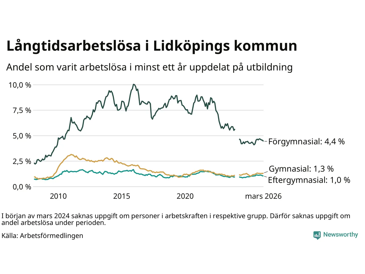 Andelen som varit utan arbete i minst ett år i Lidköping var ungefär lika stor i mars jämfört med samma månad för ett år sedan. Det visar Arbetsfömedlingens senaste månadsstatistik.