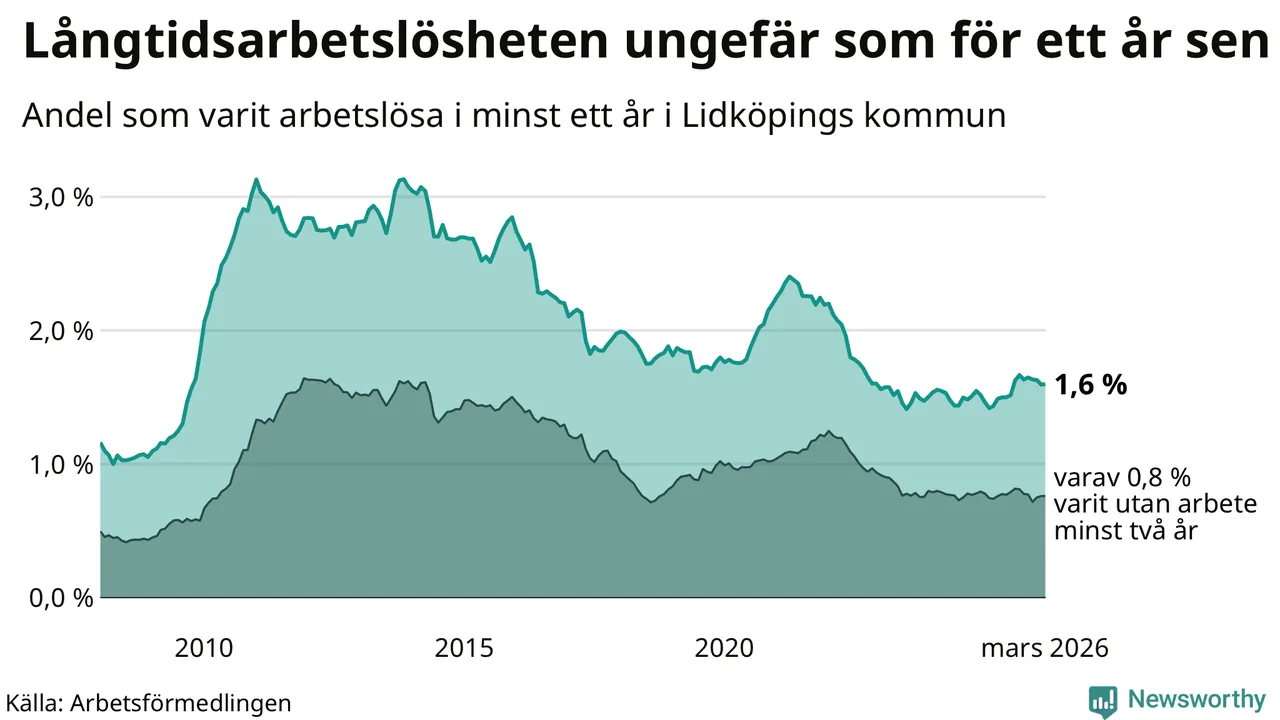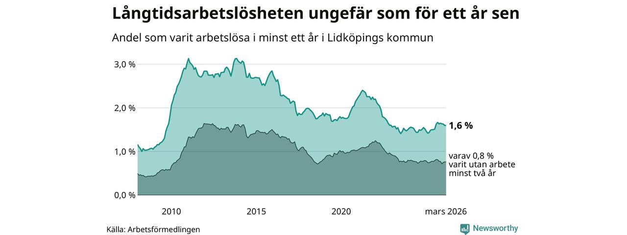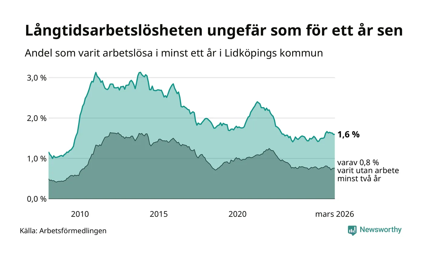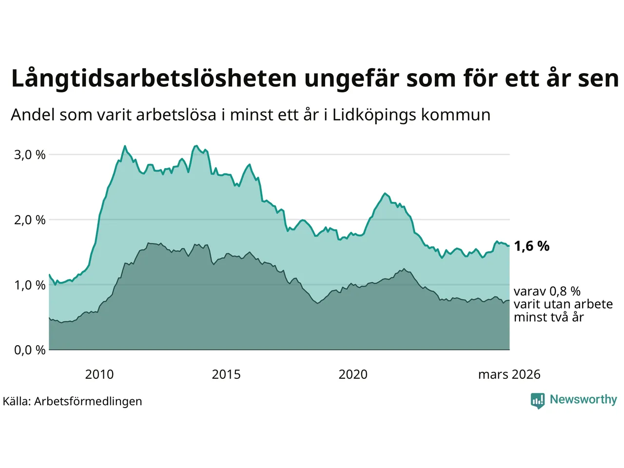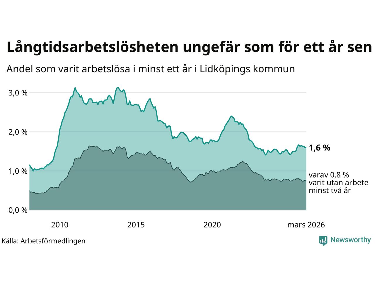 I mars hade 322 Lidköpingsbor varit arbetslösa i minst ett år, vilket är en fler än månaden innan. 322 personer motsvarar 1,6 procent av arbetskraften i kommunen – andelen långtidsarbetslösa är ungefär på samma nivå som för ett år sedan.