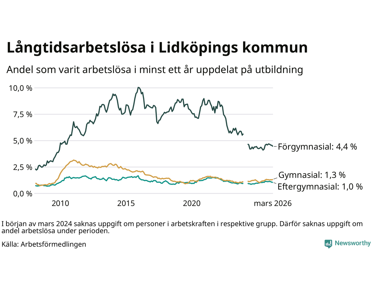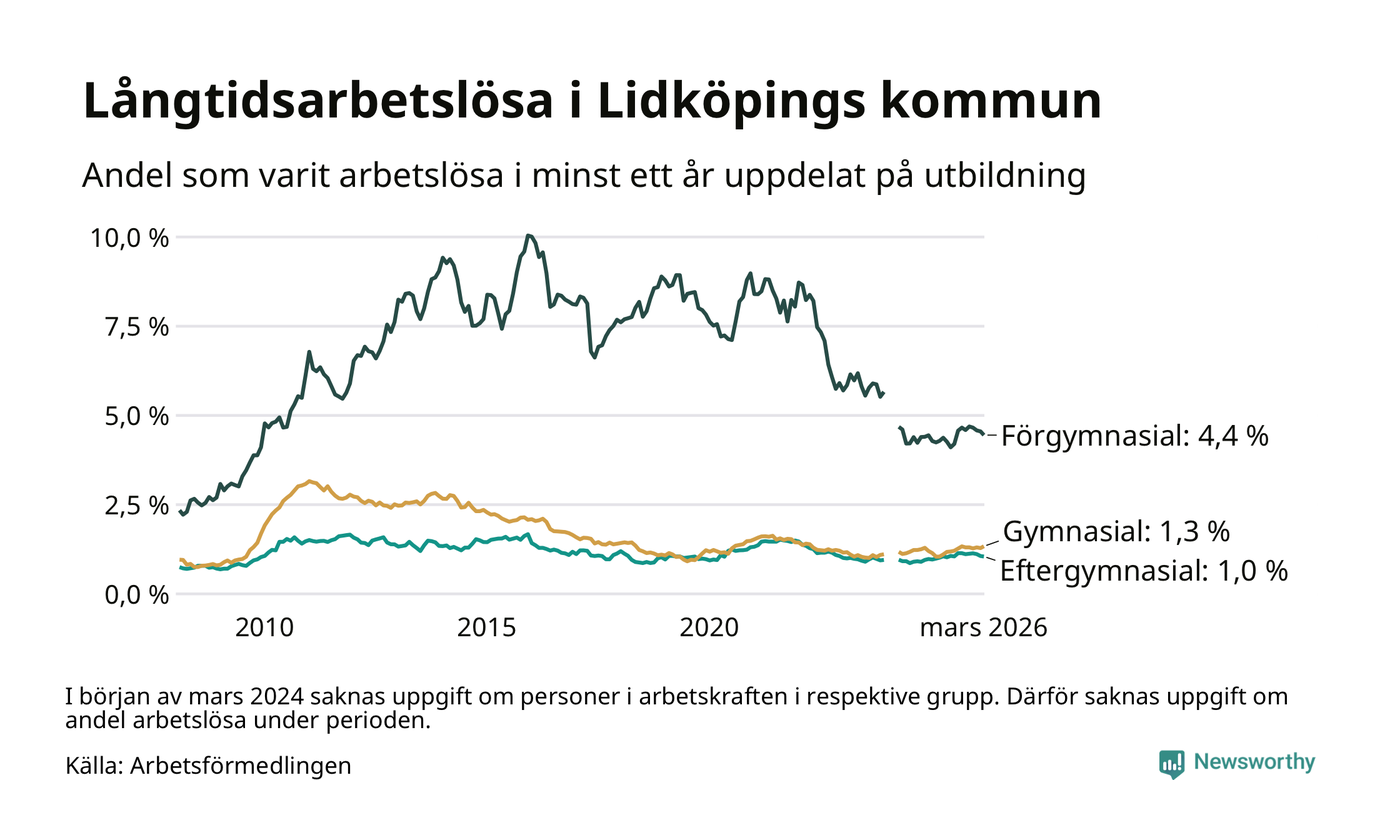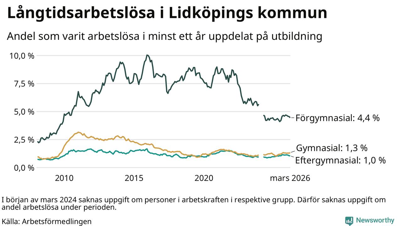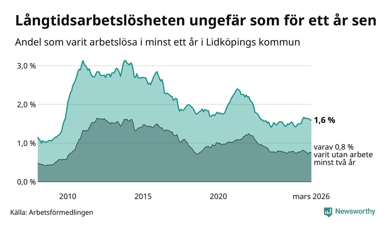 I mars hade 322 Lidköpingsbor varit arbetslösa i minst ett år, vilket är en fler än månaden innan. 322 personer motsvarar 1,6 procent av arbetskraften i kommunen – andelen långtidsarbetslösa är ungefär på samma nivå som för ett år sedan.