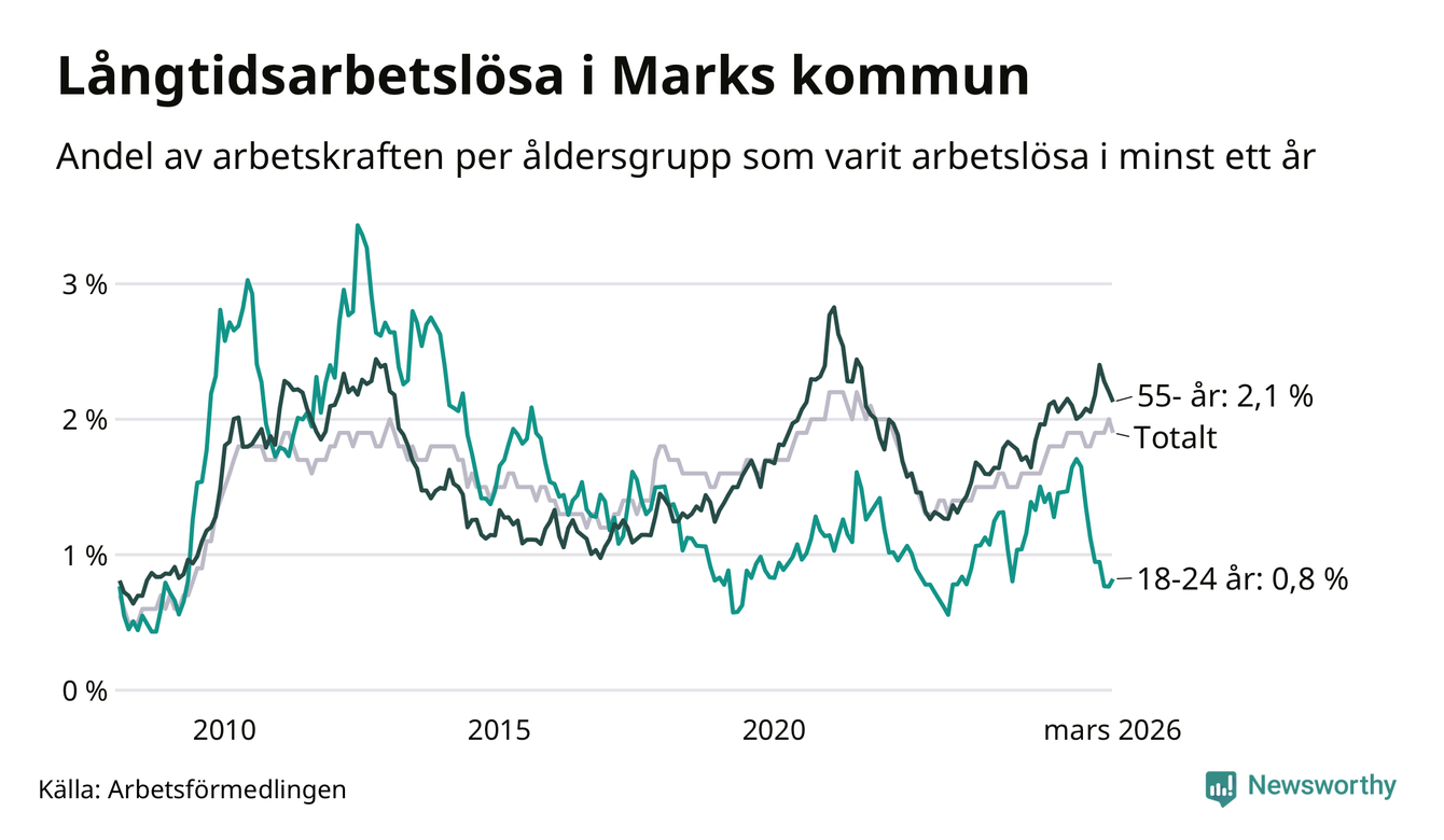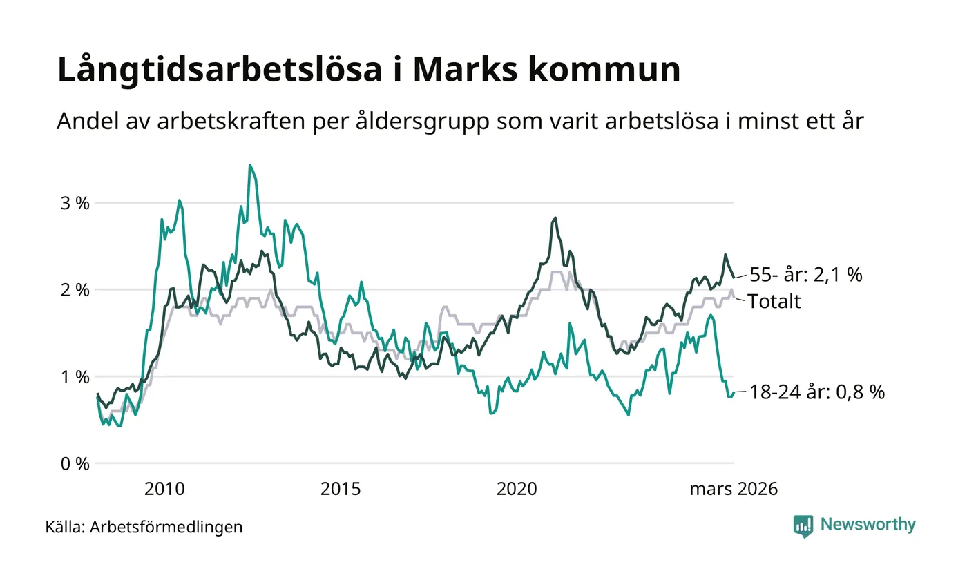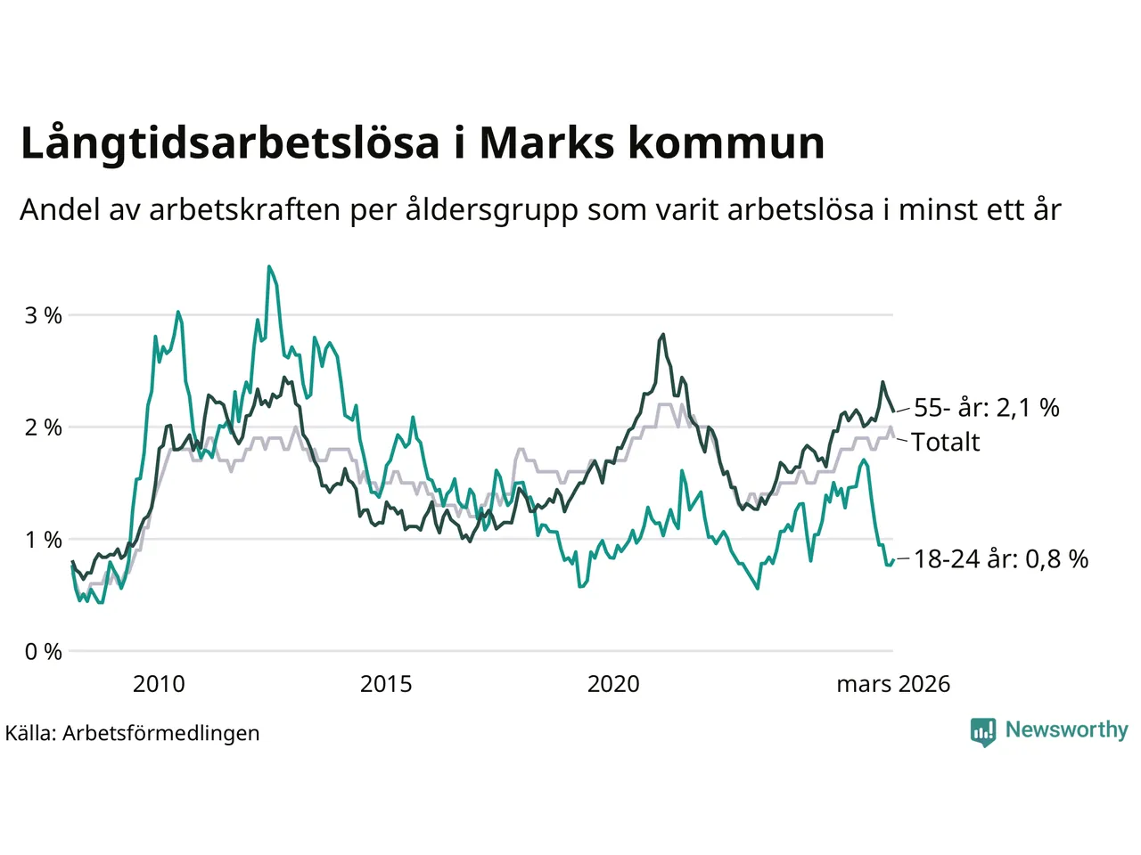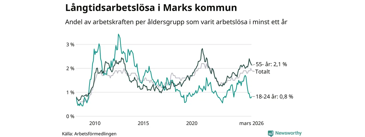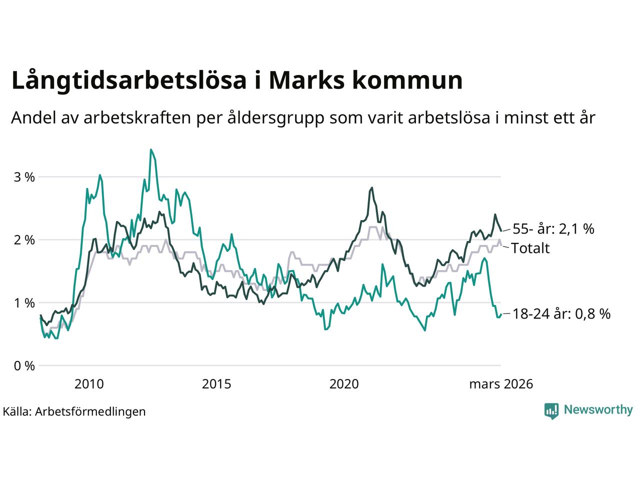 Av de 331 personerna som varit arbetslösa i mer än ett år i Marks kommun är 86 personer mellan 55 och 661 år och 14 är mellan 18 och 24 år. För den äldre gruppen är andelen arbetslösa 2,1 procent medan den i den yngre gruppen är 0,8 procent. Även i riket som helhet är långtidsarbetslösheten högre i gruppen äldre.