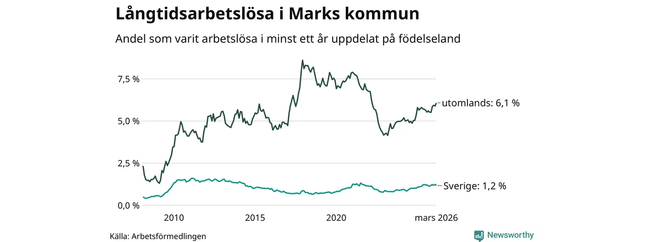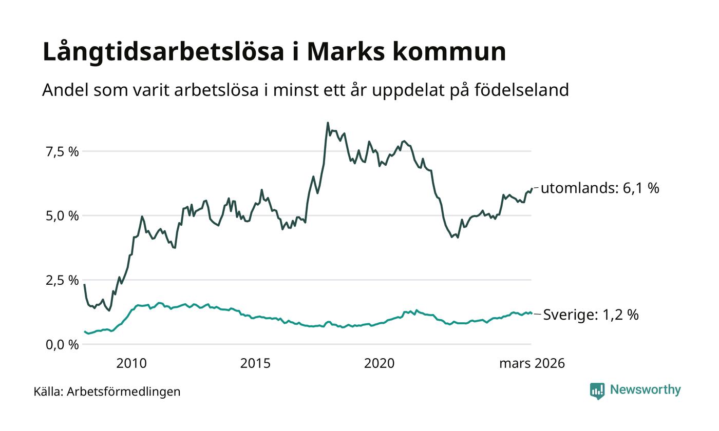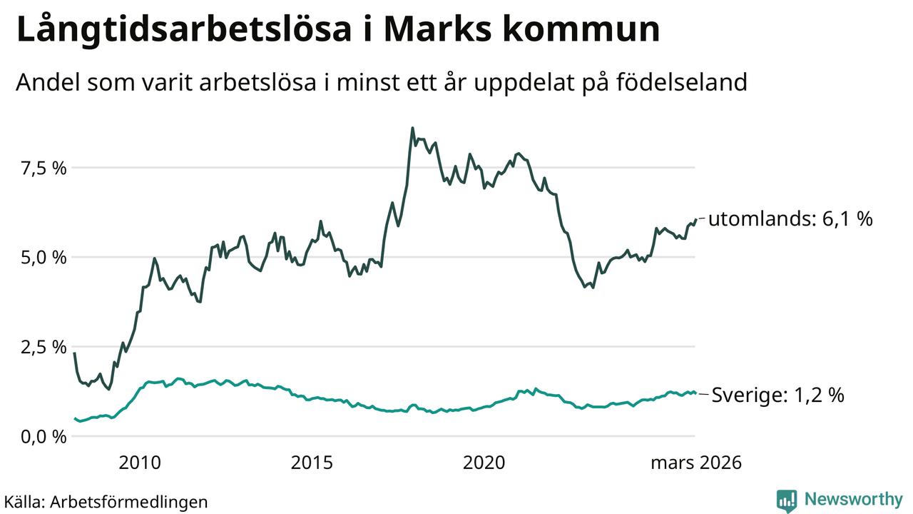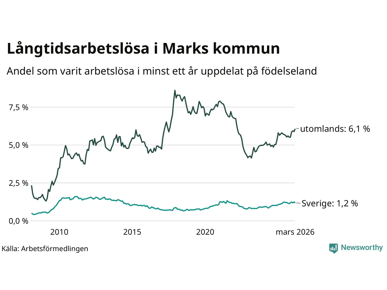 170 av de långtidsarbetslösa i Mark är födda i Sverige, medan 161 är födda utomlands. Det innebär att långtidsarbetslösheten bland Sverigefödda är 1,2 procent, medan den är fem gånger så hög – 6,1 procent – bland födda utomlands. Även i riket som helhet är arbetslösheten högre bland utrikesfödda.