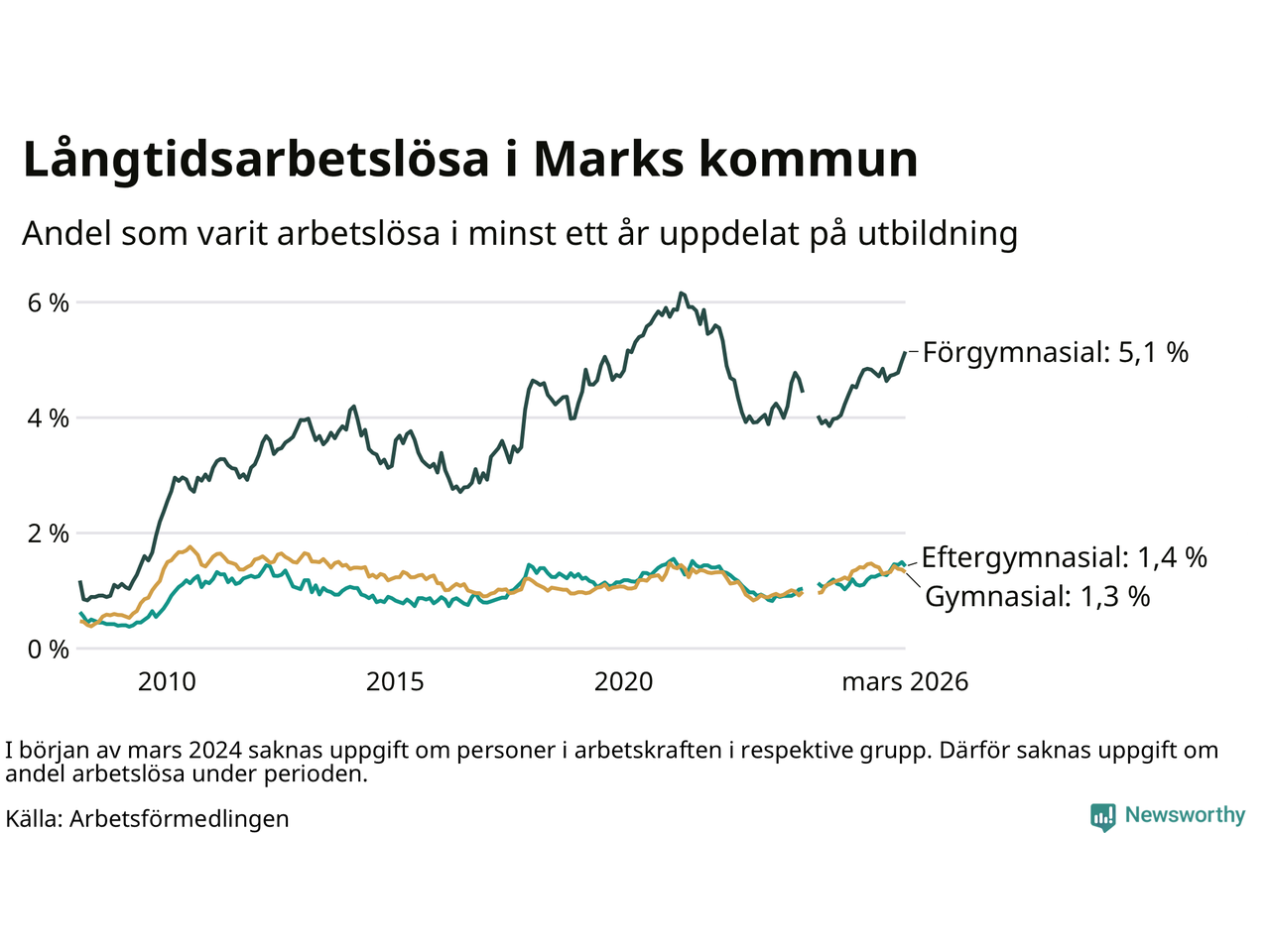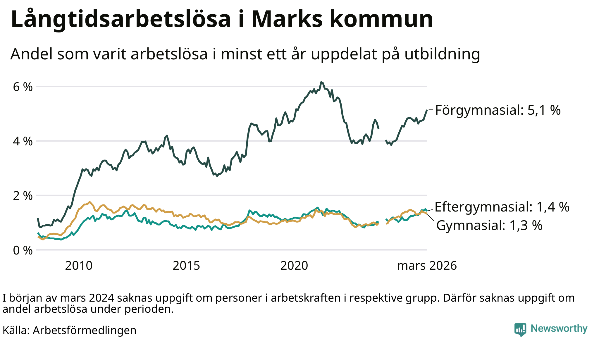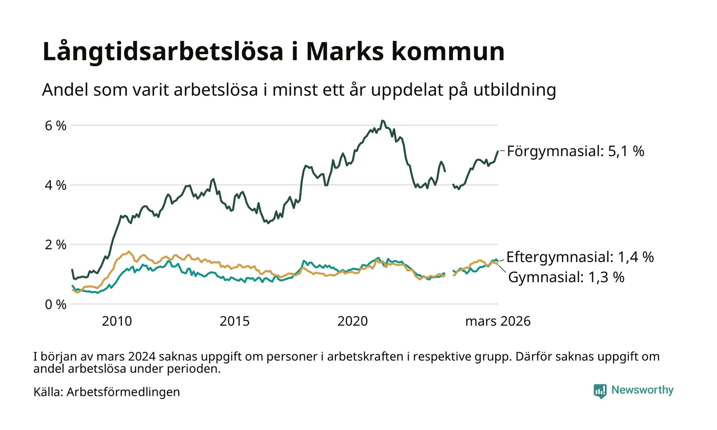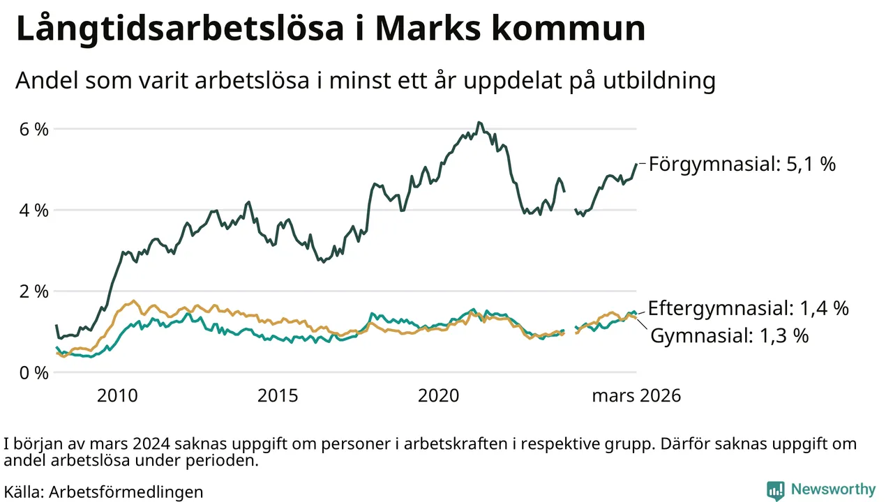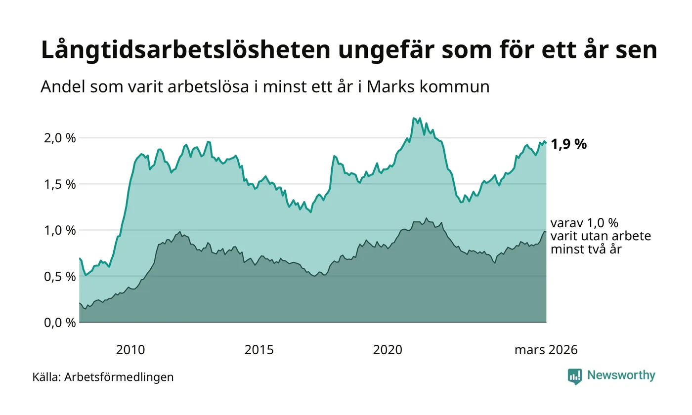 Andelen som varit utan arbete i minst ett år i Mark var ungefär lika stor i mars jämfört med samma månad för ett år sedan. Det visar Arbetsfömedlingens senaste månadsstatistik.